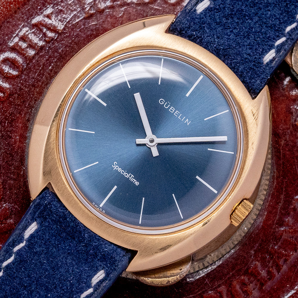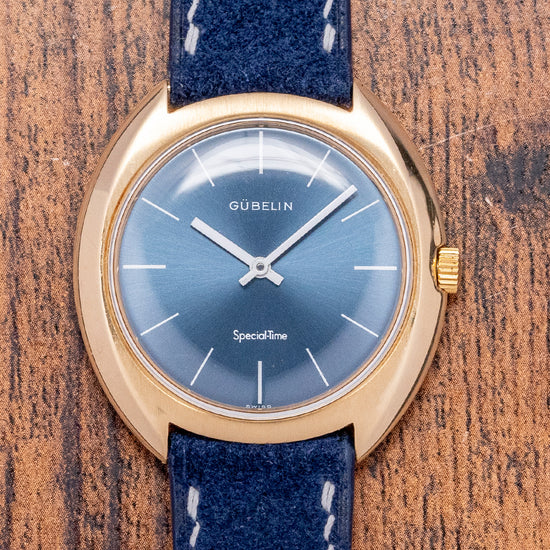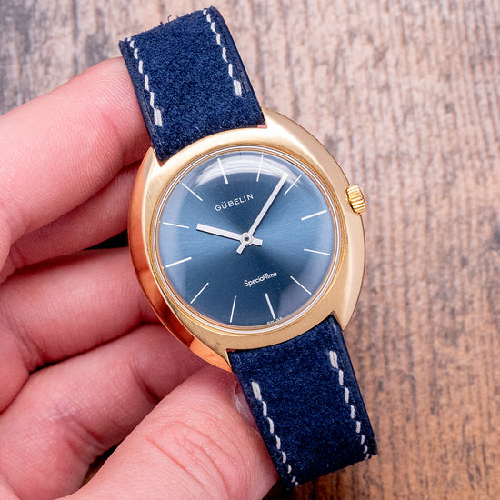 Here we have a 1976 Gübelin 18ct Gold Special-Time Blue Dial with a C-shaped 36.5mm 18ct Yellow Gold "Monocoque" (coque in French means hull) case design with the Swiss hallmarks engraved inside. The curvaceous flanks lead to a lug-to-lug length of 37mm and a case thickness of just 8mm, ensuring a comfortable fit on your wrist. Polished and brushed surfaces transition with crisp lines. On the right side, a coin-edged crown is slightly recessed to keep with its slim profile. The concave top encircles a domed acrylic crystal above a striking sunburst blue dial. Slim white batons mark the hours, slender white baton hands sit majestically in the centre, at noon, we have the Gübelin motif and at 6 o’clock, “Special Time”, completing this stunning versatile timepiece. Inside the monocoque case, we have a quality manually wound Peseux 7000, 21 jewels, beating at a leisurely 18,000 beats per hour, decorated in Côtes de Genève. It is paired with a well-suited 18mm StrapTailor suede strap and gold-plated pin buckle and comes with a Gübelin pouch, papers and an original sales receipt from 1976.