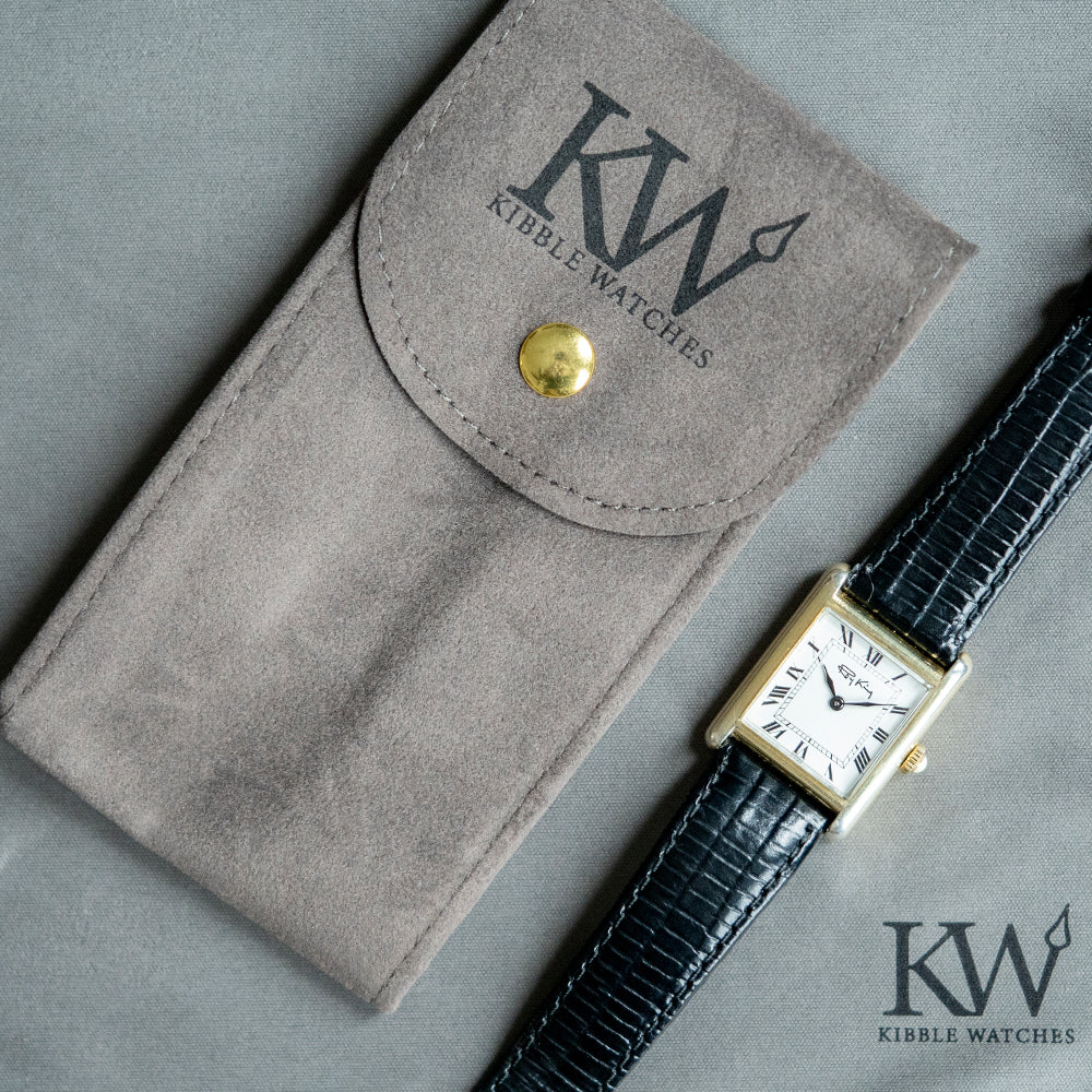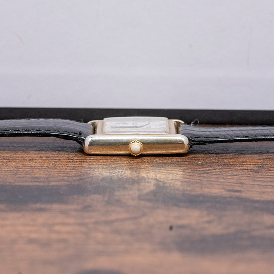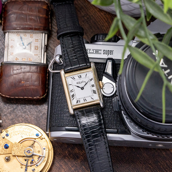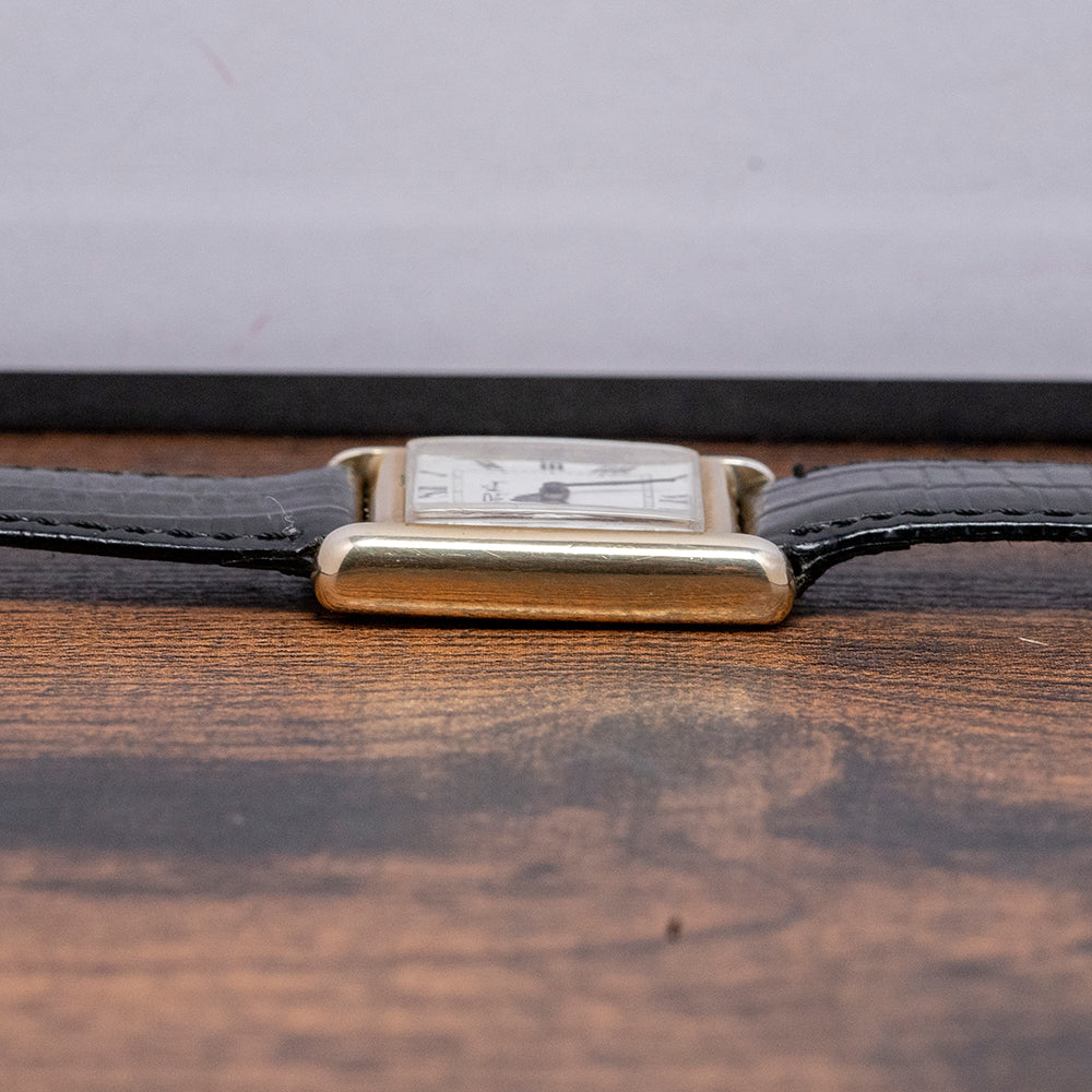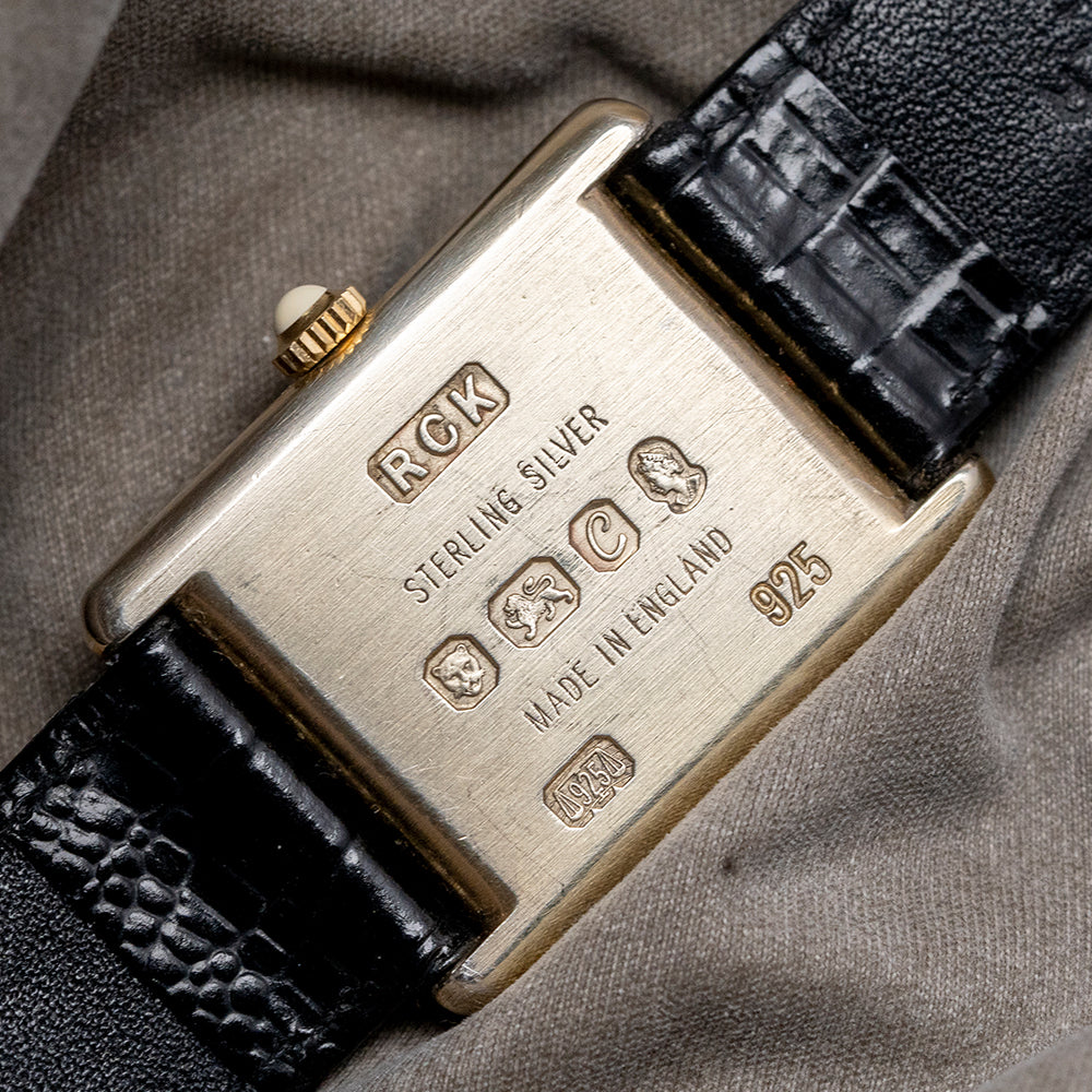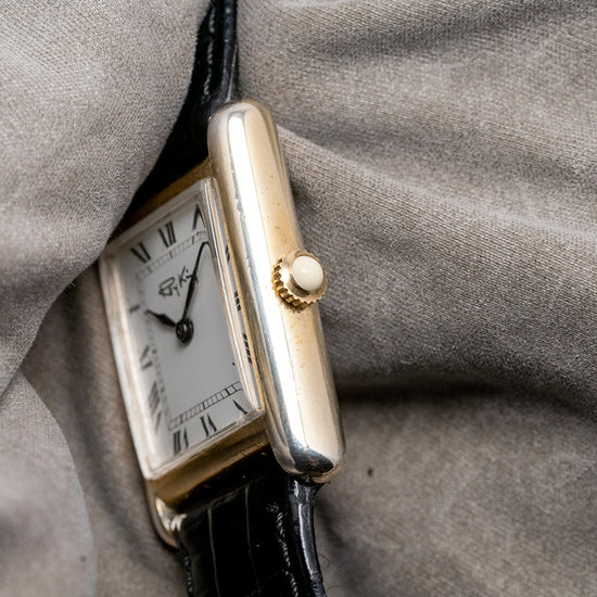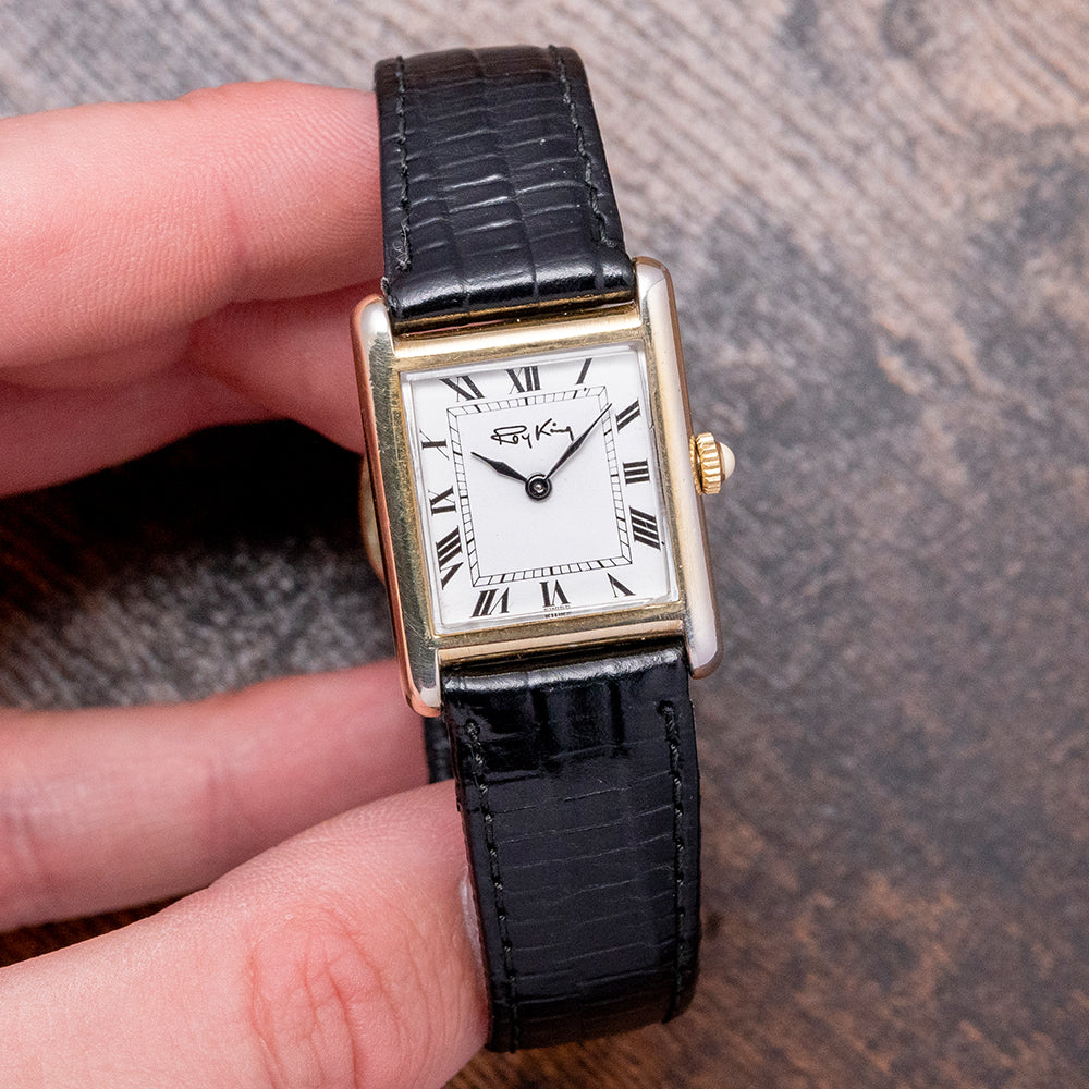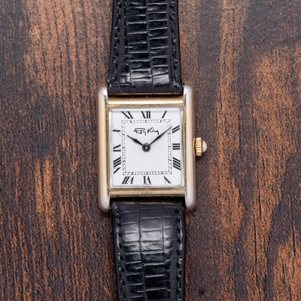Here we have a classic 1977 Roy King 'Tank' mechanical watch, featuring a sterling silver and gold-plated ‘Tank’ case that sits comfortably on your wrist thanks to the extended, rounded lugs. Its straight flanks lead to a lug-to-lug length of 30.5mm and a case thickness of just 7mm. On the right side, a coin-edged silver/gold-plated crown is topped with a white cabochon. A bevel-edged flat crystal sits above a striking white dial. Exploding black Roman numerals surround an inner minute track. Elegant black sculpted hands sit majestically in the centre. At noon, we have the RoyKing motif completing this distinctive dress watch. On the reverse, stamped with the relevant sterling silver/gold-plated hallmarks, inside a manually wound FHF Cal. ST69, 17 jewels, Swiss movement. It comes paired with an 18mm leather strap and silver gold-plated signed pin buckle.