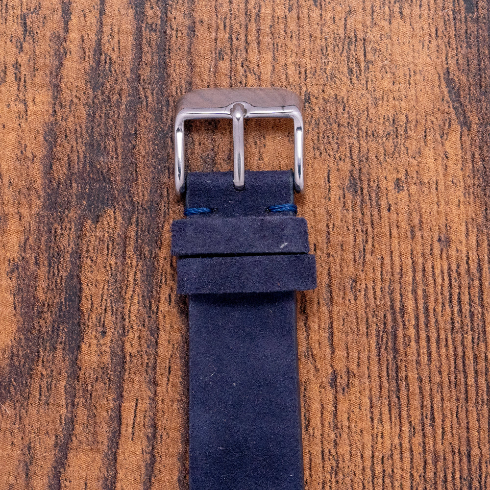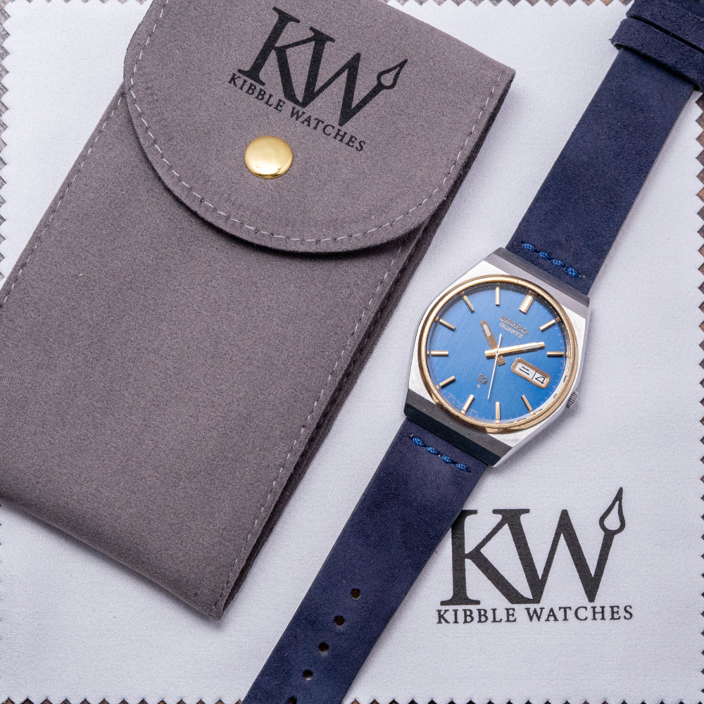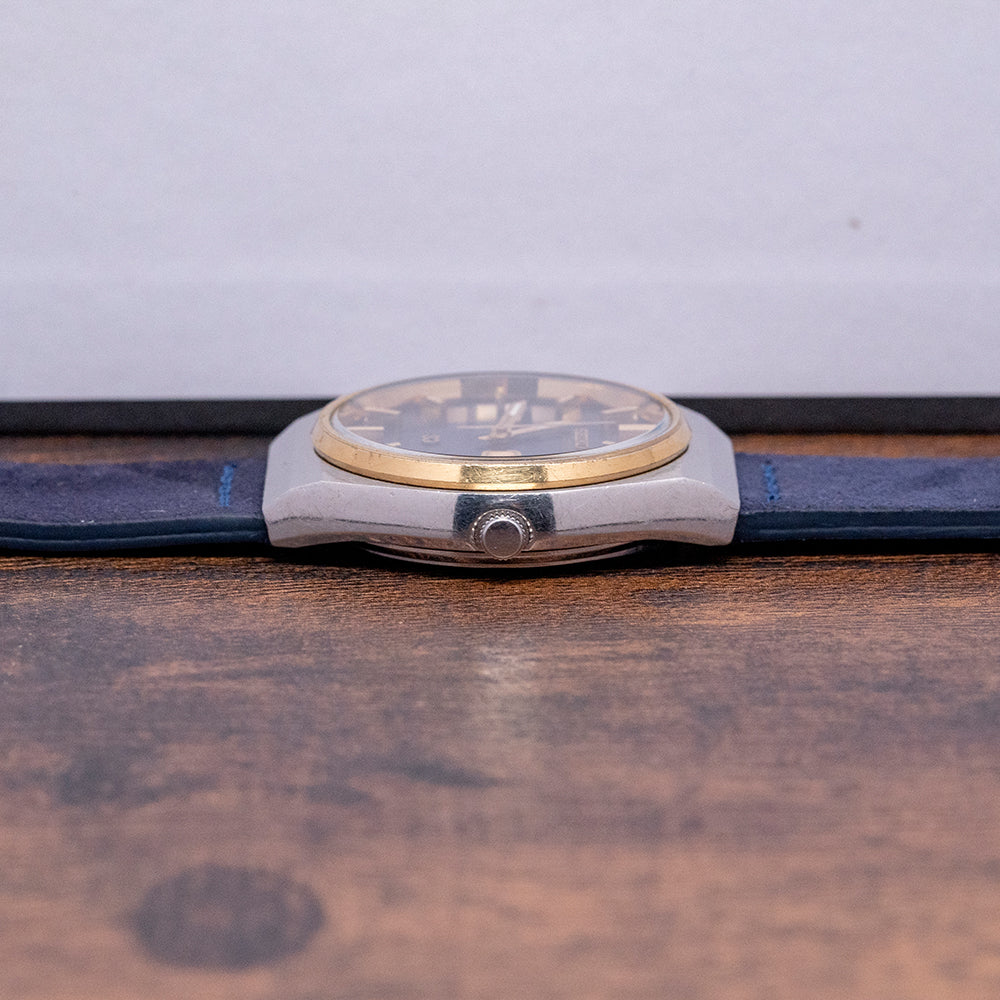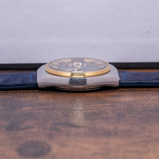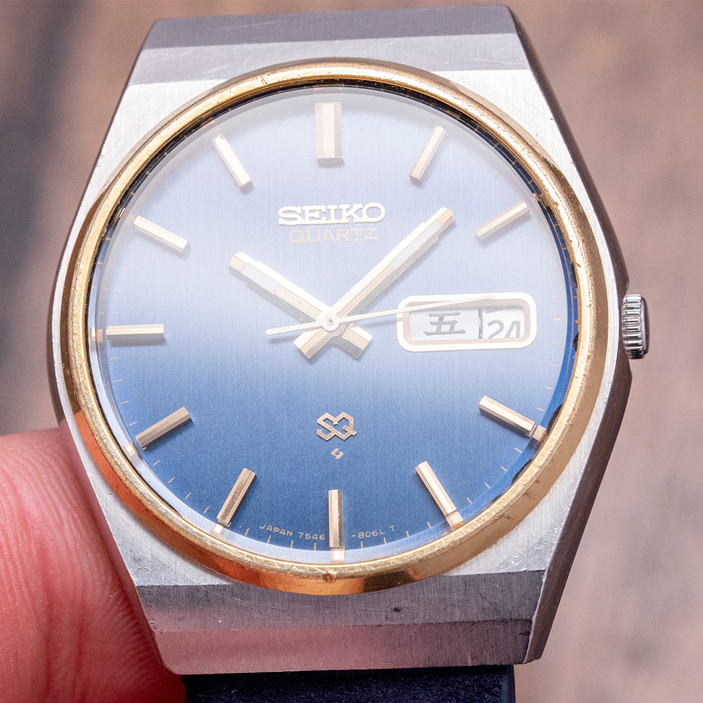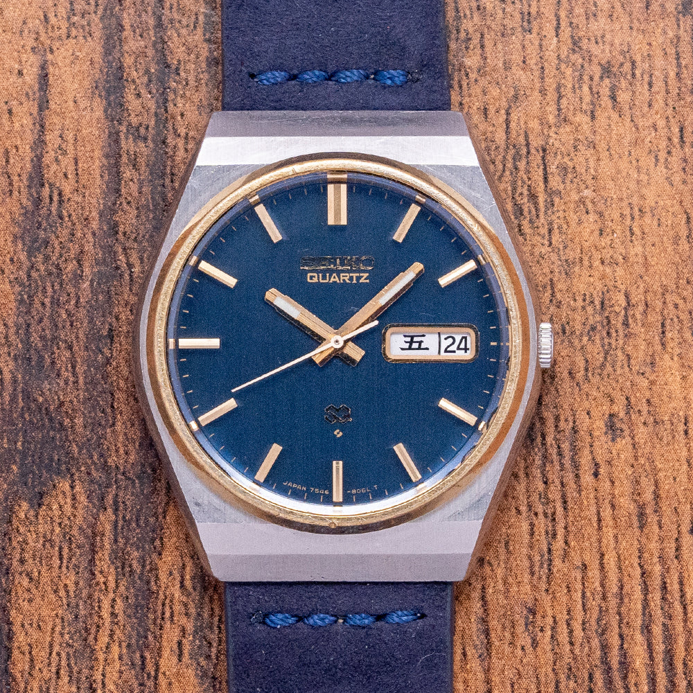 Here we have a 1977 Seiko Quartz 'SQ' Steel & 'Gold' 35.5mm 7546-8059 with a 35.5mm tonneau stainless steel case. Smooth flanks lead to a lug-to-lug length of 41mm and a case thickness of 10mm, ensuring a comfortable fit on your wrist. A slim gold-tone bezel holds a flat crystal above a blue vertical brushed dial. An outer minute track surrounds gold-tone facet-edged baton indexes marking the hours. At 3 o’clock, a framed day/date with Kanji day. Gold-tone baton hands with a lume-filled tip are complemented with a white tapered seconds hand. At 12 o’clock, an applied Seiko with Quartz printed below. At 6 o’clock, an applied SQ logo signifying single crystal quartz and the whirlpool logo indicating it was manufactured at the Suwa Seikosha factory. On the reverse, a screw-down case back with a battery hatch for easy battery change. Inside a Quartz Seiko Cal. 7546, 4 Jewel movement. It comes paired with a well-suited 20mm blue suede strap.