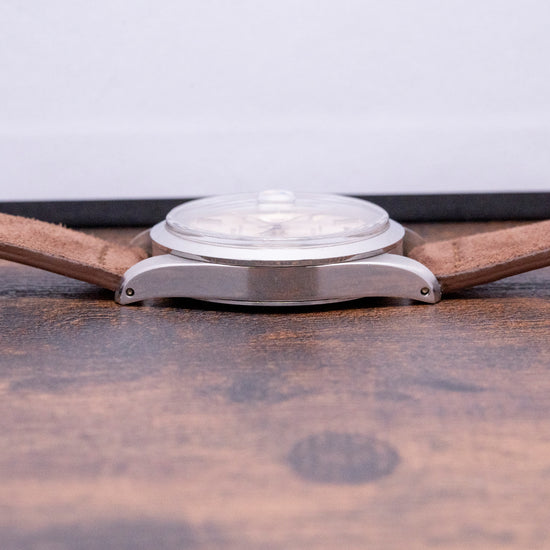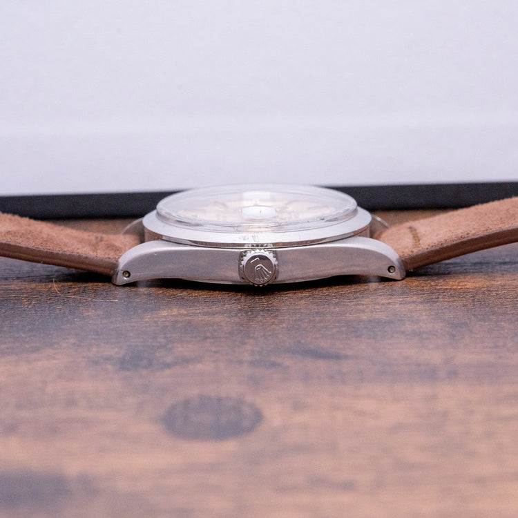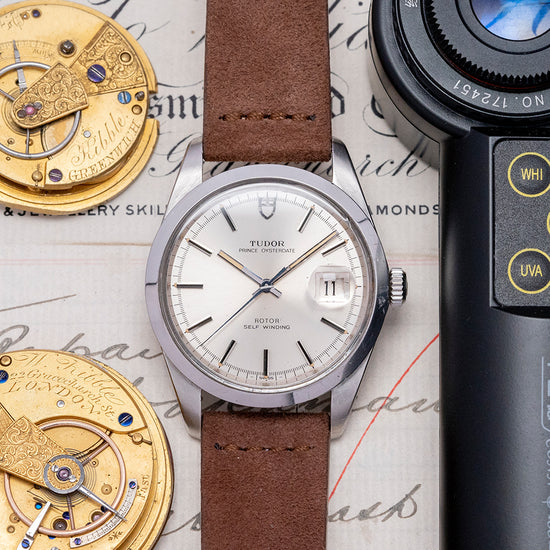 Here we have a 1977 Tudor Prince Oysterdate Silver 9080/0 with a 38mm Jumbo Rolex Oyster stainless steel case that gently curves over your wrist with finely tapered drilled lugs, and a lug-to-lug length of 47.5mm and a case thickness of 11mm ensures a comfortable fit. Polished and brushed surfaces transition with crisp lines, on the right side is a Rolex-signed screw-down crown. A domed crystal sits above a silver dial, an outer minute track precisely executed has chamfer-edged baton indexes with a lume pip marking the hours. At 3 o’clock a date window with cyclops magnification. Slender baton hands have lume tips complemented by a tapered sweeping second hand. At noon we have the applied Tudor shield "Tudor Prince OysterDate" and at 6 o’clock "Rotor Self Winding" complete this vintage sports watch. On the reverse, a Rolex signed coin-edged case back, inside an automatic ETA 2784, 25 jewels, beating at 28,800 beats per hour, the movement has a quick set date and hacking for your convenience. The watch comes paired with its well-suited 20mm suede strap and secured by a pin buckle.