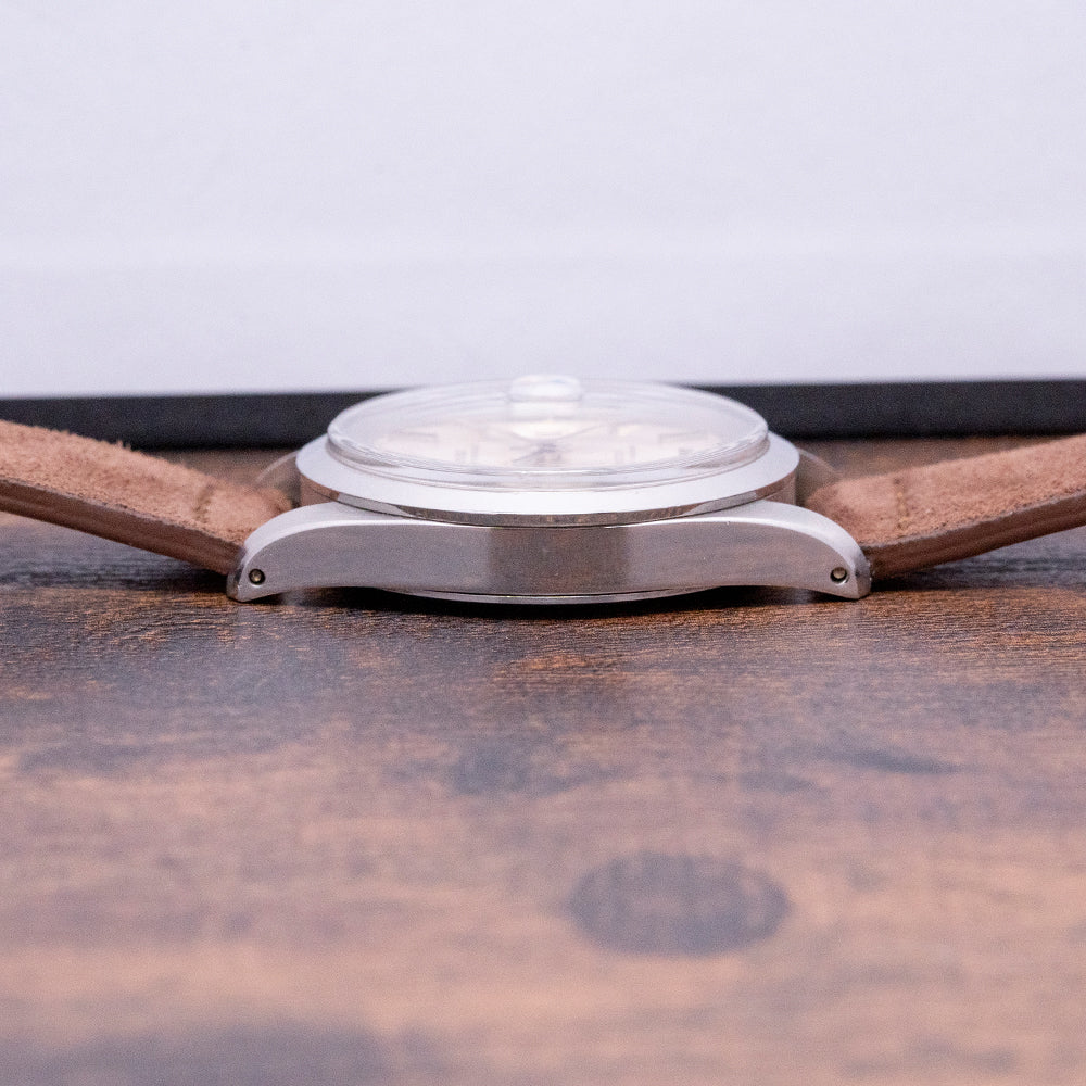 There is something undeniably incredible about a Tudor Prince Oysterdate Jumbo in 38mm on the wrist, whilst only 2mm larger than the traditional 36mm, the wrist presence feels completely different. This specific reference 9080/0 features a beautiful silver dial with tritium throughout, the warm tones of the tritium contrast perfectly against the dial and, in my opinion, this is only made better with the warm tone of the suede strap! This is one to see in the metal if you get the chance, if not, buy it here online and you will not be disappointed.