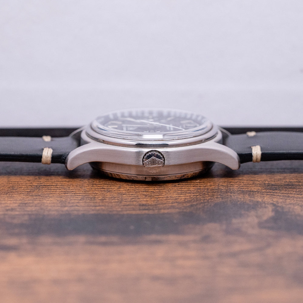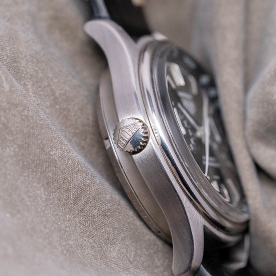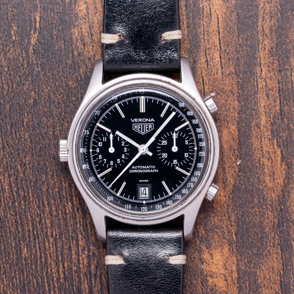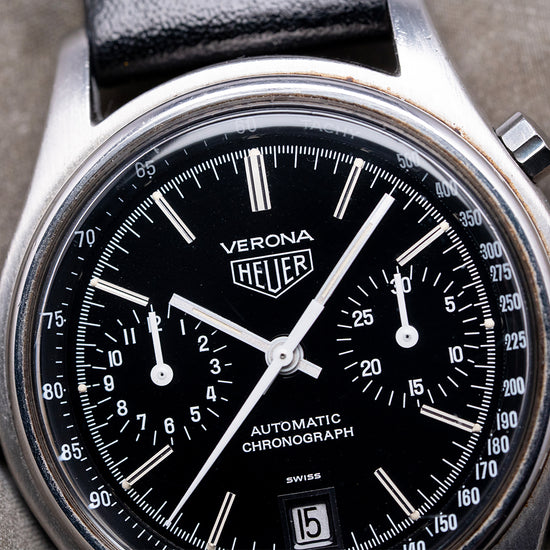 Here we have a rare classic, hardly ever seen, 1978/79 Heuer Verona Automatic Cal. 12 Chronograph. This sports collection, launched in 1978, was named after the small North Italian city of Verona, which Shakespeare famously used as the setting for Romeo and Juliet. Featuring a 38mm round brushed stainless steel case that comfortably sits on your wrist with tapered lugs. Its curved flanks lead to a lug-to-lug length of 46.5mm and a case thickness of 13.5mm, giving it an impressive wrist presence. Down the right side, we have the short, deep-knurled pushers, and on the left side, a signed coin-edged crown in the centre. The stepped smooth bezel holds a domed crystal above a striking black bicompax dial. An inner Tachymeter scale chapter ring surrounds a minute track precisely executed above applied baton indexes and lume pips marking the hours. At 3 o’clock, a 30-minute register; at 9 o’clock, a 12-hour register. A framed date window at 6 o’clock perfectly balances the dial. Slender baton hands filled with lume are complemented by a tapered black chronograph hand. At noon, we have the Verona Heuer motif, and at 6 o’clock, ‘Automatic Chronograph’ completes this rare vintage sports bicompax. On the reverse, a screw-down solid case back, inside an automatic Heuer Cal. 12, 17 jewels, beating at 21,600 beats per hour, a module cam-style chronograph with a micro rotor, introduced in 1969 it was one of the first automatic chronographs and is based on the Buren 1282, part of ‘Project 99,’ a collaboration with Hamilton, Breitling, and Dubois-Depraz. It comes paired with three well-suited 20mm straps and pin buckles.