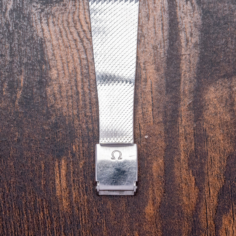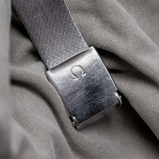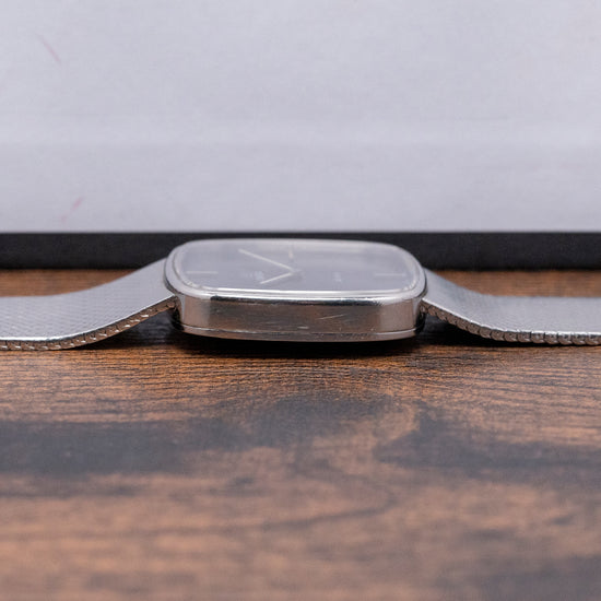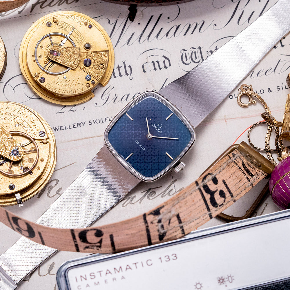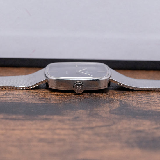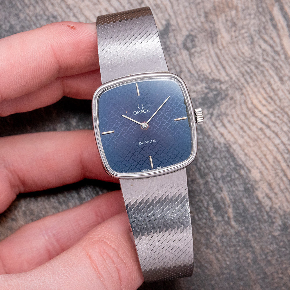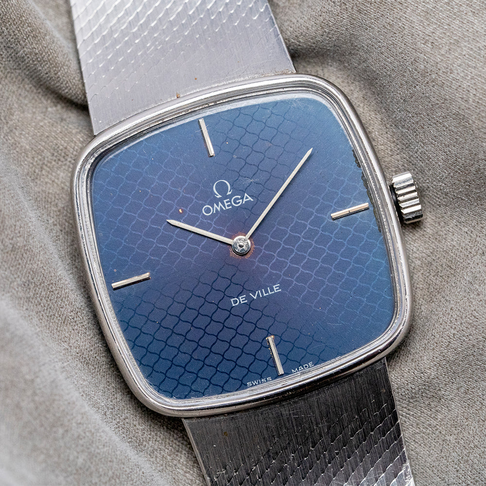 Here we have a very rare 1978 Omega De Ville Blue 'Mosaic' Dial Mechanical 311.0165 with a 28.5mm square stainless steel case with soft rounded corners that flow over your wrist thanks to the elegant integrated bracelet and concealed lugs. The subtly curved, stepped flanks lead to a lug-to-lug length of 27mm and a case thickness of just 6mm, ensuring a comfortable fit. On the right side, there is a signed coin-edged crown. A thin bezel holds the flat crystal above the star of the show, a very rare dynamic mosaic-patterned blue dial that catches the light perfectly as you rotate your wrist. Applied slim baton indexes at the cardinal points mark the hours; at 12, the printed Omega motif and at 6, “De Ville” completes this sophisticated minimalist two-hand dress watch. On the reverse, a brushed solid snap-on case back, inside a manually wound Omega Cal. 625, 17 jewels, beating at 21,600 beats per hour. It is integrated with its original, elegantly tapered 19mm Omega stainless steel fine link bracelet secured by an adjustable signed folding clasp.