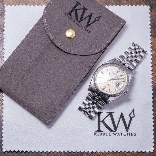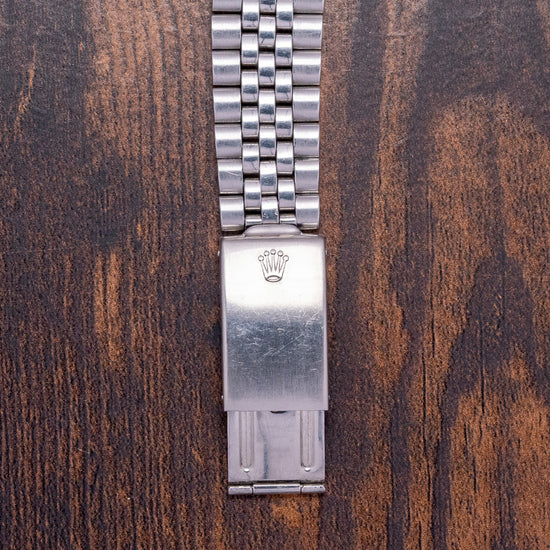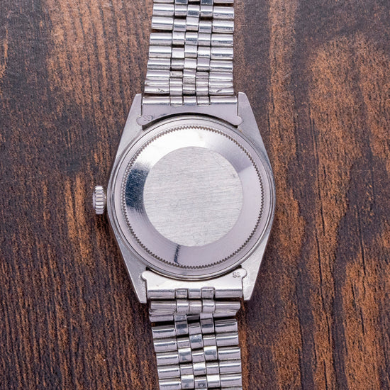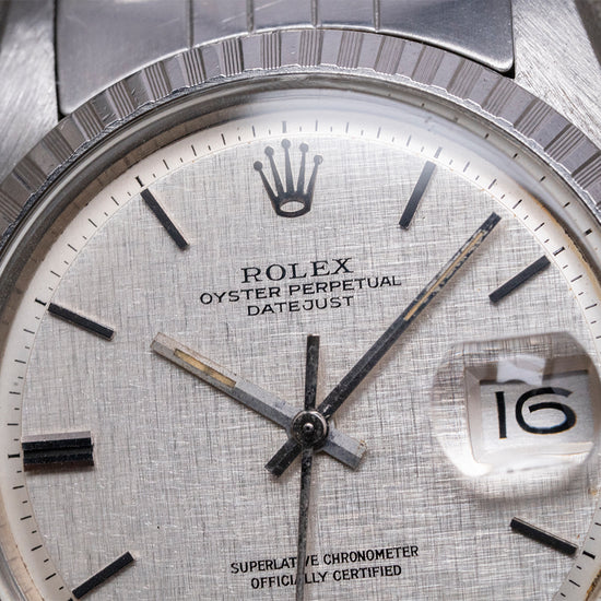 Here we have a 1978 Rolex Datejust Linen Dial Engine-Turned Bezel 1603, featuring a 36mm stainless steel Oyster case that gently curves towards the tapered, drilled lugs for easy strap changing. The lug-to-lug length measures 43mm, and the thickness is 12mm, ensuring a comfortable fit on your wrist. On the right side, a signed screw-down crown with deep knurling for extra grip. Polished and brushed surfaces transition with crisp edges, the engine-turned bezel holds a domed crystal above a rare pie-pan linen dial. An outer minute track is precisely printed with Tritium lume pips at hourly intervals, and applied chamfered-edged baton indexes catch the light magically as you rotate your wrist. At 3 o’clock, a date window with a cyclops magnification on the crystal. Elegant baton hands have chamfered edges and Tritium lume infill complemented by a finely tapered sweeping second hand. At 12 o’clock, an applied Rolex crown, text is printed accurately at 12 “Rolex Oyster Perpetual DateJust” and at 6 o’clock “Superlative Chronometer Officially Certified”. On the reverse, a coin-edged screw-down case back houses an automatic Rolex Cal. 1570, featuring 26 jewels and a beat rate of 19,800 beats per hour. This movement was first introduced in 1965 and remained in production until 1974. It comes paired with an original polished and brushed 20mm folded-link Rolex Jubilee bracelet, featuring a Rolex folding clasp.