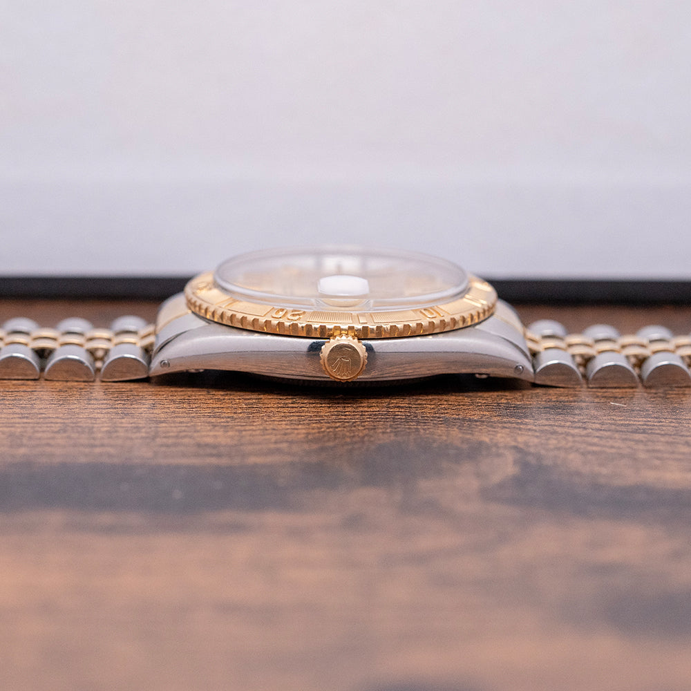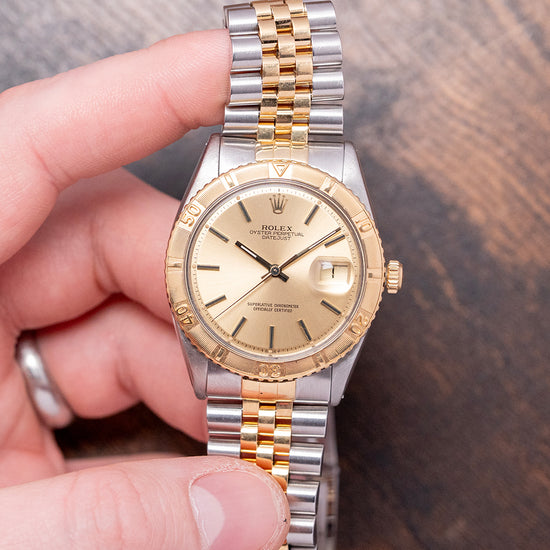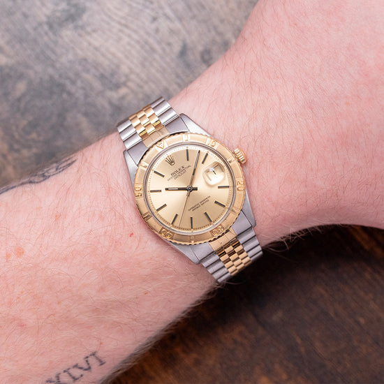 Here we have a lovely 1978 Rolex Datejust Turn-O-Graph 1625 featuring a 36mm Steel and 18ct yellow gold case that sits comfortably on your wrist with fine tapered lugs. Turn-o-Graph refers to its innovative, bidirectional rotating bezel designed to "turn" and measure elapsed time, acting as a precursor to diving watches. Introduced in 1953, it was the first Rolex to feature a rotating bezel and gained the nickname "Thunderbird" after the U.S. Air Force aerobatic team adopted it for navigational calculations. Its curvaceous flanks lead to a lug-to-lug length of 43mm and a case thickness of 11.5mm. On the right side, an 18ct yellow gold signed screw-down crown. The 18ct yellow gold bidirectional bezel has deep knurling for grip and an attractive textured insert with a raised 60-minute scale. A domed crystal sits above a sunburst gold dial with an outer minute track, surrounding applied facet-edged 18ct yellow gold baton indexes, and a Tritium pip marking the hours. At 3 o’clock, a date window with Cyclops magnification. Elegant 18ct yellow gold hands are complemented by a tapered sweeping second hand. At noon, we have ‘Rolex Oyster Perpetual Datejust’ and at 6 o’clock, ‘Superlative Chronometer Officially Certified’, completing this sophisticated dress watch. On the reverse, a coin-edged screw-down solid case back, inside an automatic Rolex Cal. 1570, 26 jewels, 19,800 beats per hour. First introduced in 1965, this exceptional movement was COSC Certified. Giving it the smooth tick associated with Rolex. It comes paired with a very nice 20mm folded-link Rolex 62523H-18 Jubilee steel and 18ct yellow gold bracelet, featuring a Rolex folding clasp with 445 End Links and will fit up to a 7.15-inch wrist.