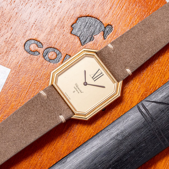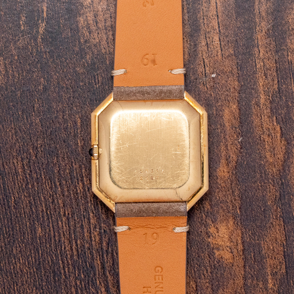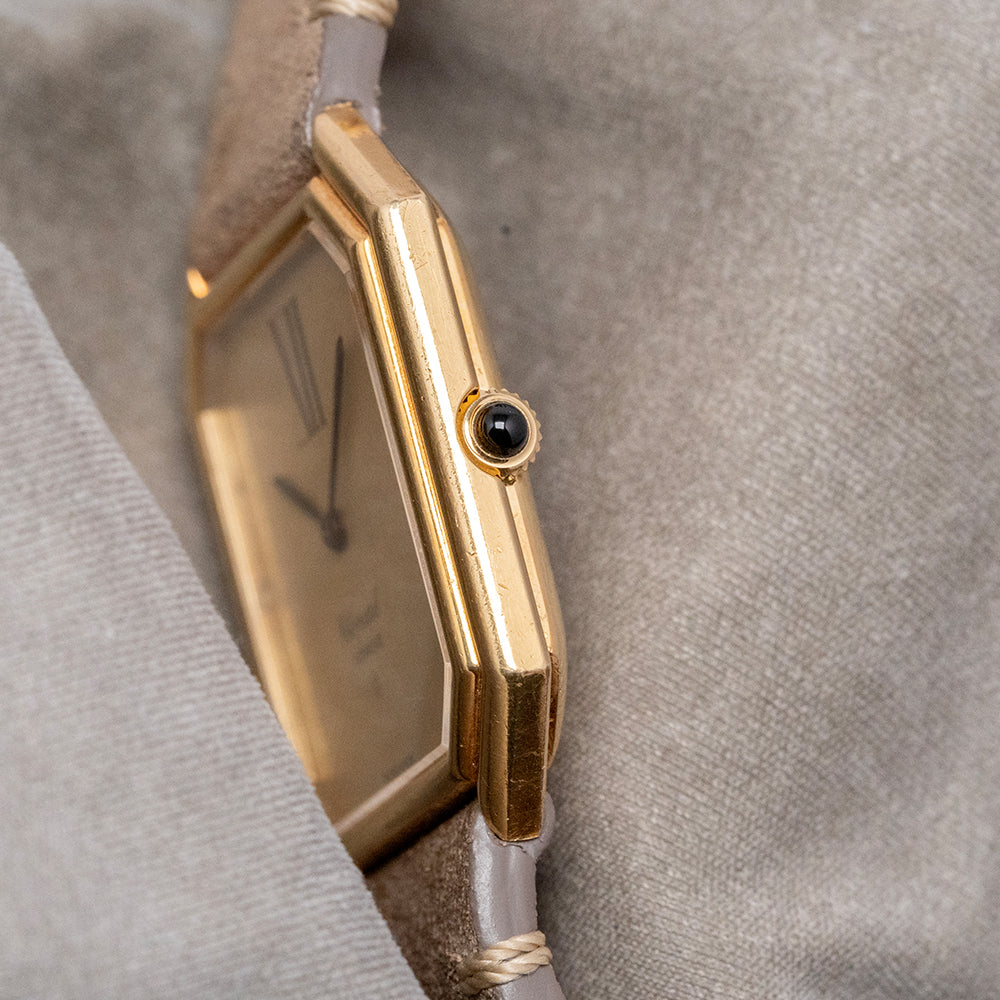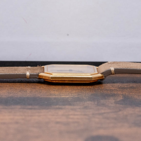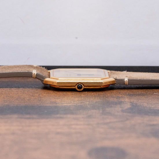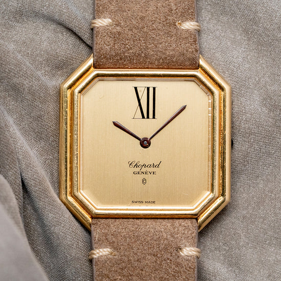 Here we have a classic 1980s Chopard Geneve Step Case 18ct Gold Dress Watch, Model 2147, featuring an elegant 31mm 18ct yellow gold octagonal stepped case. Its slim profile leads to a lug-to-lug length of 32mm, and a case thickness of just 5.5mm ensures a comfortable fit on your wrist. On the right side is a recessed crown with an attractive black cabochon. The stepped contours of the case add interest and draw the eye towards the flat, slightly raised octagonal crystal above a minimalist champagne dial. A large Roman numeral for 12 sits above the decorative sword hands in the centre, and the Chopard motif is found at 6 o’clock, completing this sophisticated two-hand dress watch. On the reverse is a snap-off case back engraved with the details of the watch and the Swiss hallmark, inside a quality quartz movement. The watch comes paired with a 19mm well-suited vintage-style leather strap.