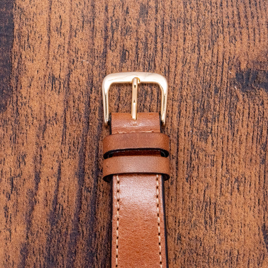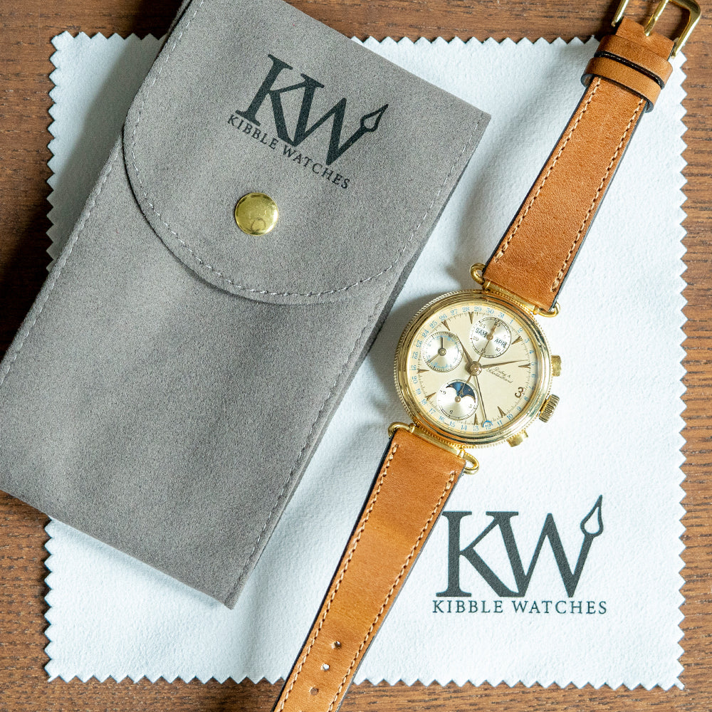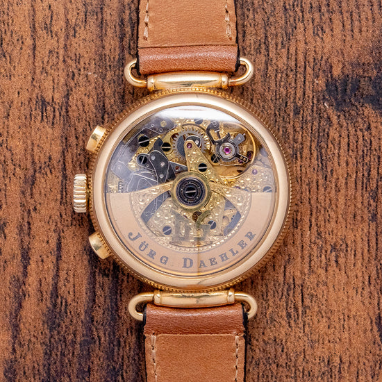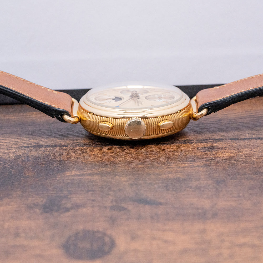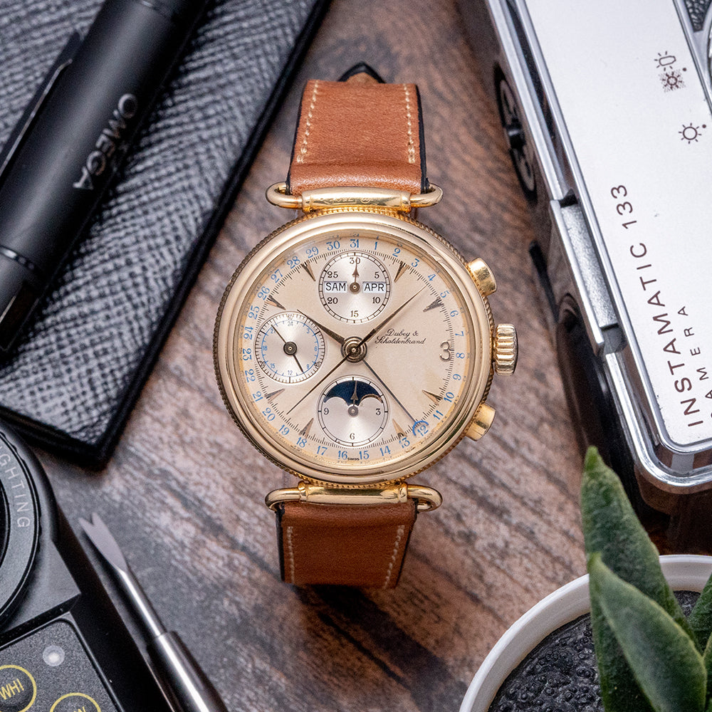 Here we have a 1980s Dubey & Schaldenbrand Triple Calendar Moonphase Chronograph with a 37mm 18ct Yellow Gold round case and coin edge detailing, beautifully sculpted lug tubes holding a hinged hoop for you to attach a strap, and a lug-to-lug length of 46.5mm and a case thickness of 15mm give the watch an impressive wrist presence. Down the right side chronograph pushers and a crown in the centre, on the left you find an indented pusher. A smooth stepped bezel holds a domed sapphire crystal above an eggshell white dial, an outer date ring in blue ink surrounds a minute track precisely executed with a Yellow Gold dagger and “3” indexes marking the hours, at 12 o’clock we have a 30-minute register, inside a day/month window, at 6 o’clock a 12-hour register, inside a moonphase crescent and finally at 9 o’clock a small seconds and a 24-hour register in blue ink, two hands indicate the relevant scale. The handset consists of Yellow Gold Alpha hands, a blue crescent-tipped hand indicating the date and a fine tapered chronograph hand. At 3 o’clock we have the Dubey & Schaldenbrand motif completing this Art Deco-inspired Triple Calendar Moonphase Chronograph. On the reverse a sapphire exhibition case back, inside a hand-engraved automatic Modified ETA 7750, 25 jewels, beating at 28,800 beats per hour, beautifully decorated with a skeletonised rotor engraved with “Jürg Daehler”, modified modules for the moonphase, day/month and outer date. The watch comes paired with its well-suited aftermarket 18mm brown leather strap.
