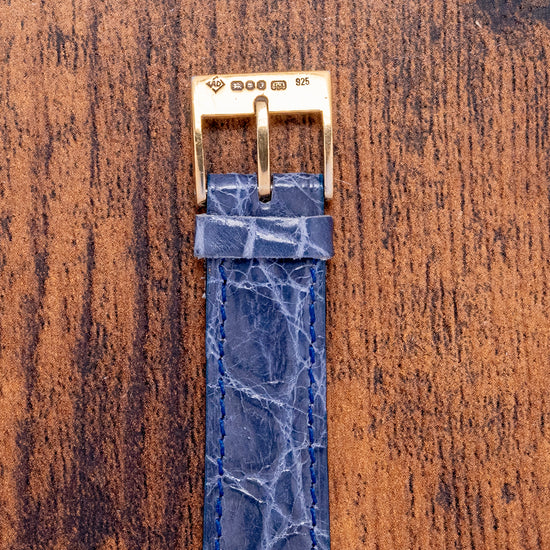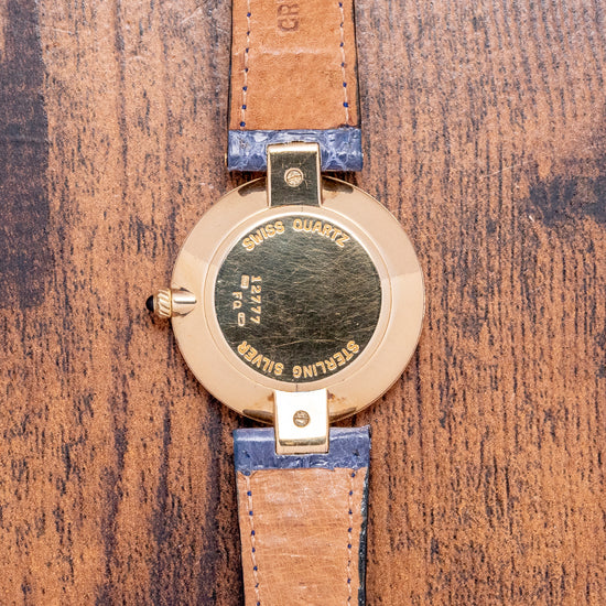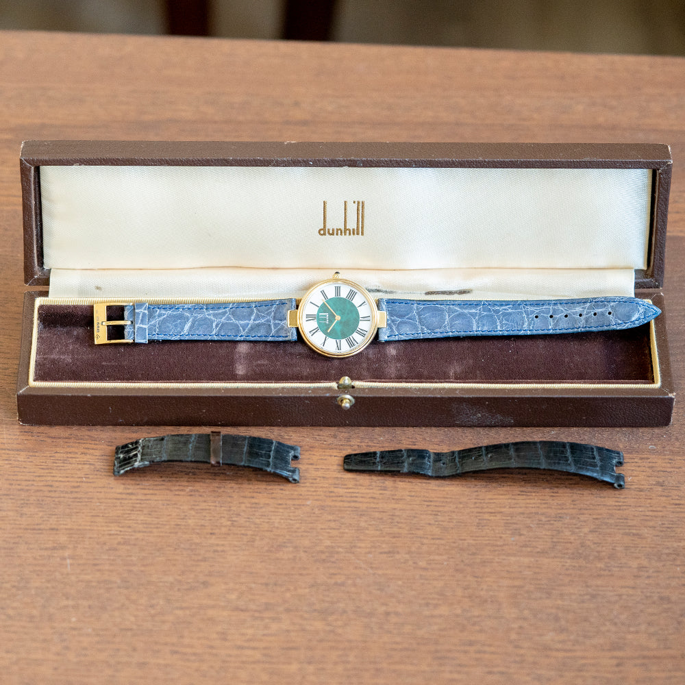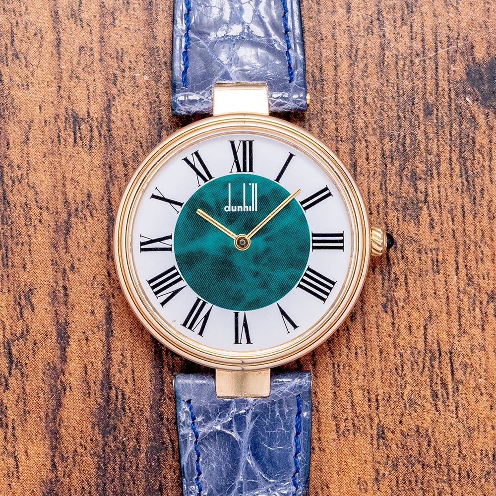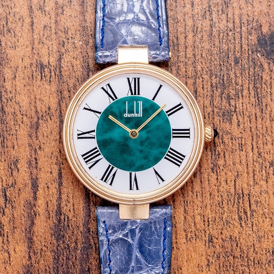 Here is a classic 1980s Dunhill .925 Silver Green Dial "Vendôme" Quartz with a 33mm polished .925 Sterling Silver / Gold Plated round case. The screwed T Bar lugs are secured in the centre by a screw, creating a pleasing jewellery fitting. A lug-to-lug length of 40.5mm and a case thickness of just 6.5mm ensures a comfortable fit on your wrist. On the right side, a black cabochon crown with fine knurling for grip. The thin-stepped smooth bezel holds a chamfer-edges flat crystal above a stunning green marbe coloured inner circle with a white outer ring and attractive radiating large Roman numeral hour markers, gold-plated stick hands sit majestically in the centre; at 12 o’clock, we have the Dunhill motif completing this sophisticated dress watch. On the reverse, a polished .925 Sterling Silver / Gold Plated snap-off case back is stamped with the Swiss hallmarks and details of the watch around its edge, inside a quality Swiss Quartz movement. It comes paired with its original 17mm leather strap and .925 Sterling Silver / Gold Plated pin buckle and its original Dunhill presentation box.