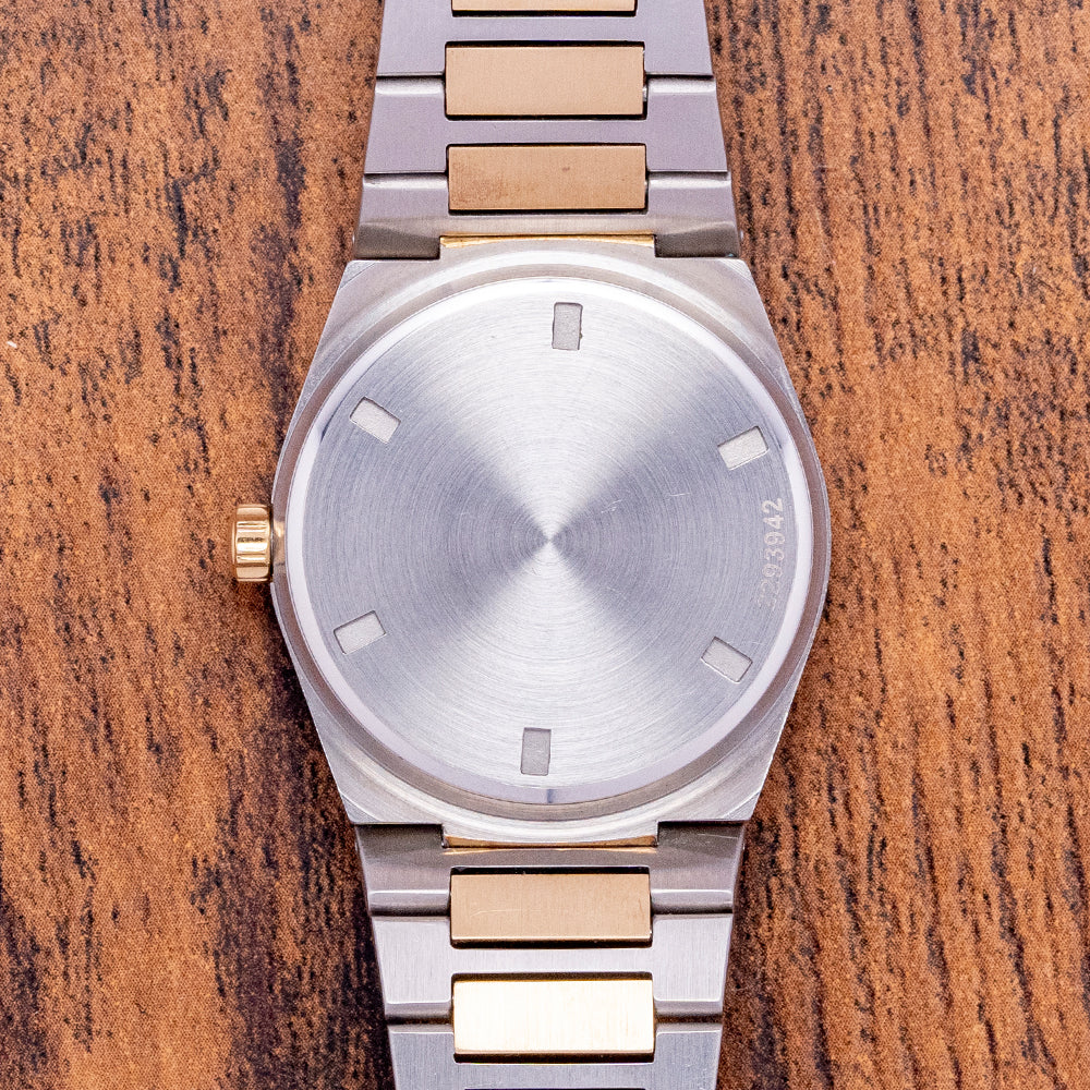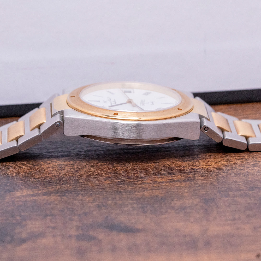 Here we have an incredible 1980s IWC Ingenieur SL Quartz Steel & 18ct Yellow Gold on an integrated Bracelet. The 34mm tonneau stainless steel and 18ct yellow gold case is a Gerald Genta design that flies under the radar of many collectors. Genta designed the 40mm IWC Ingenieur four years after he created the Audemars Piguet Royal Oak in 1972, and it was in 1976, that he convinced Patek Philippe to launch the Nautilus. The SL stood for Steel Line, and this Quartz variant was in production from 1981 until 1987. The brushed surfaces and a slim profile lead to a lug-to-lug length of 39mm and a thickness of 8mm, which gives the watch an impressive wrist presence. The case gently curves comfortably over your wrist thanks to the integrated bracelet, and on the right side a signed screw-down crown. The fixed 18ct yellow gold bezel has five rivet holes and is brushed with polished edges. A flat sapphire crystal protects a crisp white dial, and an outer minute track with Roman numeral indices marks the hours. At 3 o’clock, a framed colour-matched date window. Elegant black hands are complemented by a tapered 18ct yellow gold second hand. The text is precisely printed in black with a 12 “IWC” motif in its original swirling script and 6 “Ingenieur SL Quartz,” respectively. On the reverse, a screw-down case back. Inside a quality Quartz movement. The watch comes paired with its original 23mm integrated IWC steel and raised 18ct Yellow Gold centre link bracelet secured by a signed concealed clasp and will fit up to a 7.1-inch wrist. This watch is sold with an IWC Service box and paperwork for two IWC Services, the most recent being from June 2024.