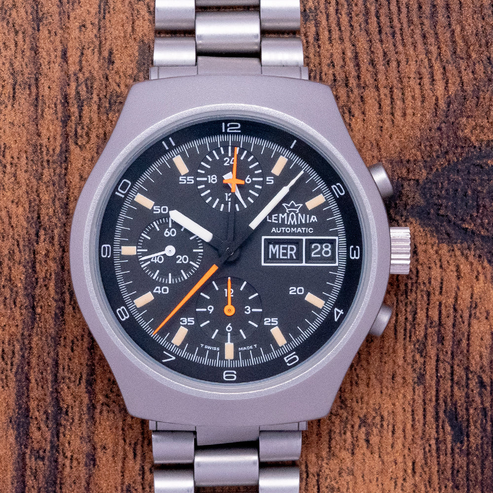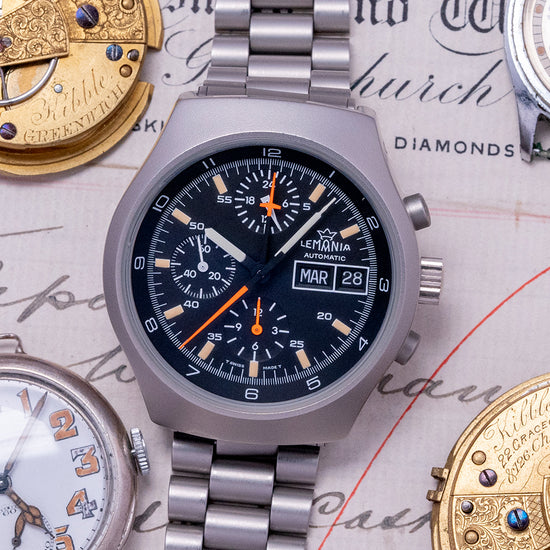 Lemania was founded by watchmaker Alfred Lugrin in 1883. Specialising in high-quality chronographs, stopwatches, and repeaters. Companies like Omega and Patek Philippe have used Lemania-based movements among many others. In 1932 they became members of the SSIH Group. In 1946 Albert Piquet developed the movement that became the Omega 321 which powered the first Speedmaster in 1957. Lemania's name comes from the French for Lake Geneva ”Lac Leman”. During the 1970s they developed the Cal. 5100 which was used by Heuer. They broke away from the SSIH Group in 1981 and changed its name to Nouvelle Lemania. In 1992 Lemania was bought by Breguet, who later in 1999 was acquired by the Swatch Group.