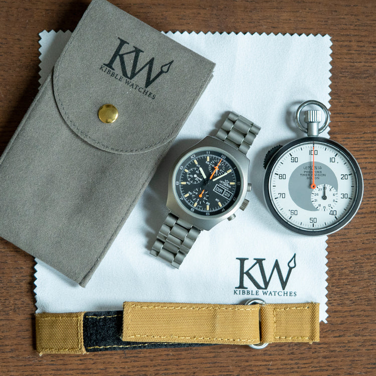 Here we have a Rare 1980s Lemania Chronograph Cal. 5100 & Lemania Stop Watch that was made for Preston's Timer Division in Bolton, it is housed in a base metal case from Circa. 1960, the stopwatch is operated by winding it manually, and the push-in crown allows the watch to return to zero, the Stopwatch is started and stopped using the black slide on the left side of the case, the dial has black Arabic numerals that show the 100-second scale, there is also a grey centre with a white subsidiary 30-minute register, and a red tapered chronograph hand hits its mark precisely, the stopwatch uses a Lemania Watch Co. movement with a jewelled lever escapement and comes paired with a fabric NATO strap. A Rare 1980s Lemania Chronograph Cal. 5100 inspired by the chronographs of the 1970s such as the Porsche Design, Heuer, and many others. Its 40mm tonneau case has an unusual grey bead-blasted finish, and a lug-to-lug length of 44mm and a case thickness of 14.5mm give the watch an impressive wrist presence and comfortable fit, thanks to its profile. On the right side, you find the recessed chronograph pushers and a crown in the centre. The flat crystal is recessed above a matte black dial, an outer 12-hour scale with an inner minute track, and tritium-coated baton indexes mark the hours. Under the batons, we have 60 minutes printed in white, at 12 o’clock a 24-hour register, at 6 o’clock a 12-hour register, and finally at 9 o'clock a 60-second register. The framed day/date window balances the dial. Slender sword hands are complemented by an orange chronograph second hand. Text is minimalist with Lemania Automatic above the day/date window. On the reverse, a screw-down case back, inside an automatic Lemania Cal. 5100, 17 jewels, 28,800 beats per hour. This workhorse of a movement was also used by Sinn and Heuer amongst others, the movement was quietly discontinued in 2003/4 once Lemania was absorbed by the Swatch Group in 1999. The watch comes paired with a grey bead-blasted 20mm unsigned bracelet and flip-lock folding clasp.