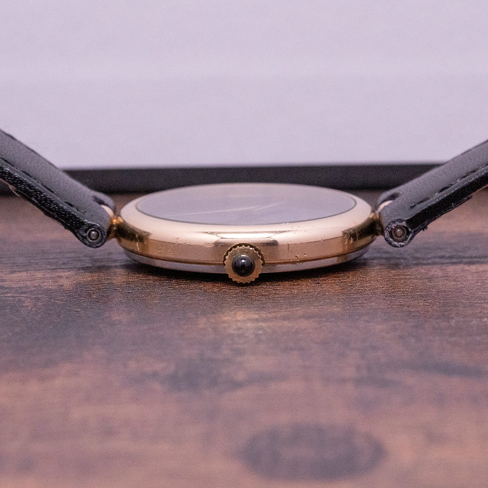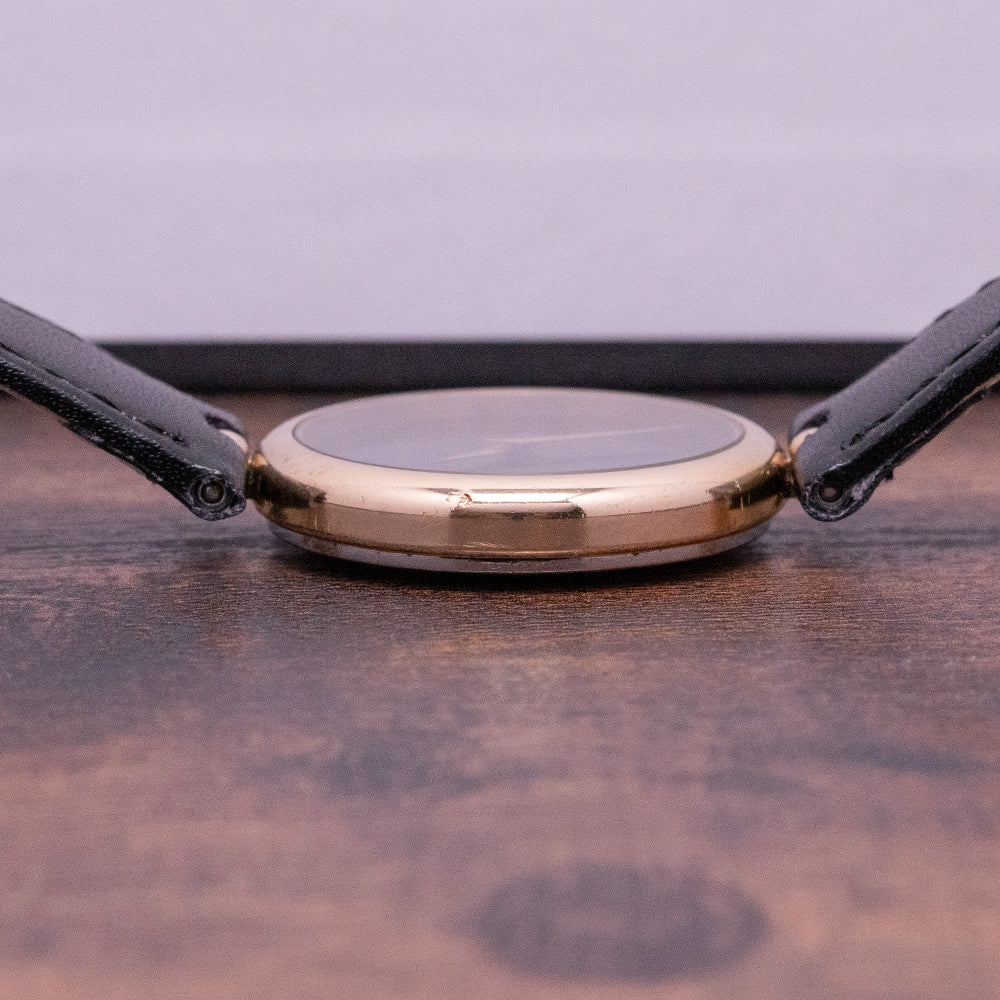 Here we have a 1980s Movado/Zenith Manually Wound with a curvaceous 31mm Gold-Plated case that sits on your wrist with a central gold-plated ring for the spring bar to go through, reminding me of a delicate piece of jewellery. A lug-to-lug length of 38.5mm and a case thickness of just 6.5mm ensures a comfortable fit. On the right side a gold-plated crown with an attractive black cabochon centre. A flat crystal sits above a black sterile dial, elegant gold-plated Dauphine hands sit in contrast to the black dial, at 12 o’clock we have the Movado motif completing this sophisticated delicately executed dress watch. On the reverse a stainless steel snap-off case back, inside a manually wound Zenith Cal. 2320, 17 jewels, beating at 21,600 beats per hour. The watch comes paired with a suitable 18mm leather strap with a gold-plated pin buckle.