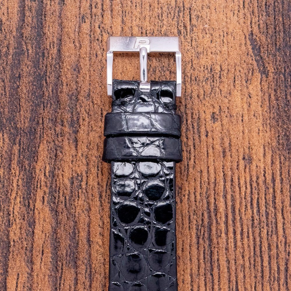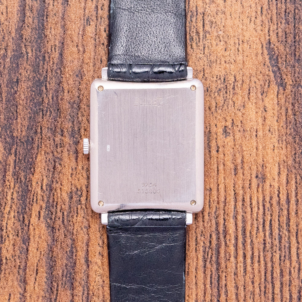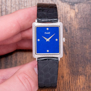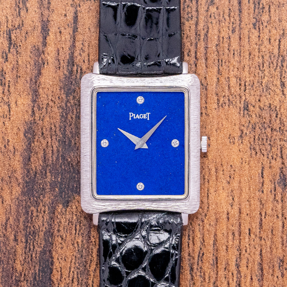 Here we have a 1980s Piaget 18ct White Bark Case Lapis & Diamond Dial with a 23.5mm square 18ct White Gold case. Elegant chamfered lines lead to straight drilled lugs with a lug-to-lug length of 32.5mm and a case thickness of just 4.5mm, ensuring a comfortable cushion fit on your wrist. On the right side is a coin-edge crown. A perfectly executed bark-textured bezel holds a flat crystal above an unusual and beautiful Lapis dial; four diamonds at the cardinal points mark the hours; they shimmer magically in the light as you rotate your wrist; elegant Dauphine Hands sit majestically in the centre of this jewel-like sterile dial. On the reverse, a screwed-down case back, inside a manually wound Piaget Cal. 9P2, 18 jewels, 19,800 beats per hour. This incredibly thin movement at 2.15mm is still one of the world's thinnest mechanical movements. The watch comes paired with a 16mm leather strap secured by its original Piaget 18ct white gold pin buckle.