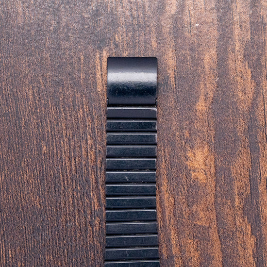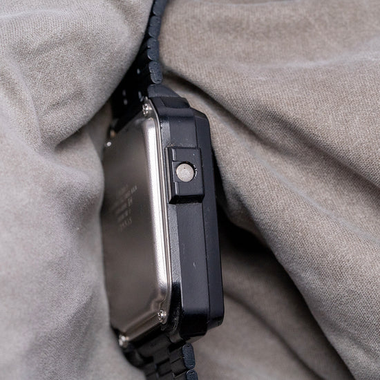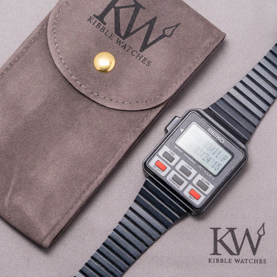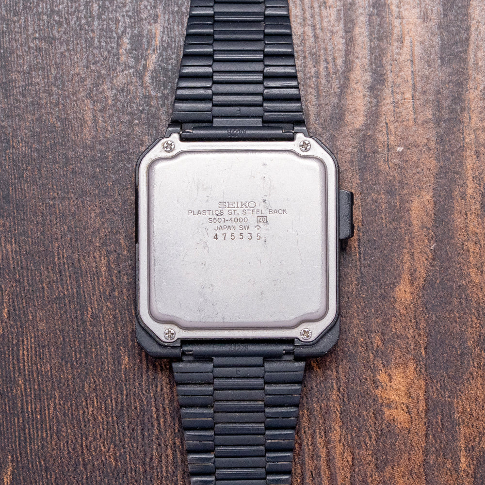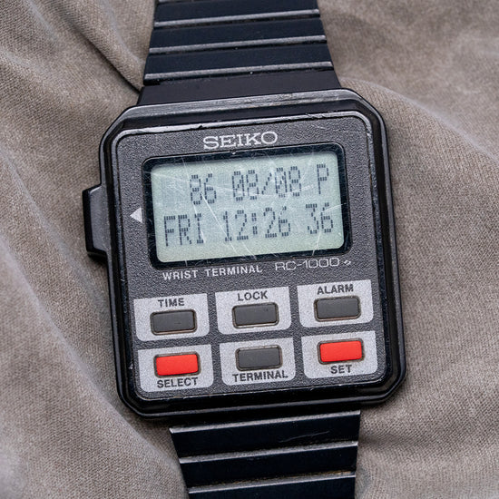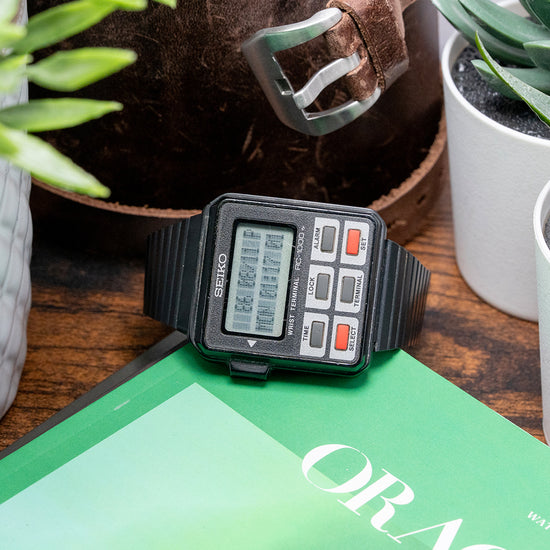 Here we have a rarely seen 1980s Seiko Wrist Terminal RC-1000 S501-4000, it was Seiko's first computer-connected watch. This watch is compatible with a variety of older computers, requiring an RS-232C interface cable and software, including the Apple II series, Commodore 64, and IBM PCs, as well as some compatible models. It also supports the Tandy Colour Computer and several versions of the TRS-80. Its 36mm rectangular black plastic case sits comfortably on your wrist thanks to the tapered 20mm adjustable bracelet. On the left side, an enclosed button for changing the various functions. The RC-1000 watch has six buttons and offers various functions, including displaying the day, date, alarm, and time. It also features a memo function, a schedule alarm, a weekly alarm, and a world time option. (which requires special software for some of these features). A light is activated by pressing and holding the SET button to brighten up the two-line DOT-Matrix display. On the reverse, a screwed-down case back engraved with the details of the watch, inside a Quartz Seiko Cal. S501 movement. It comes paired with its original tapered 20mm black adjustable bracelet.