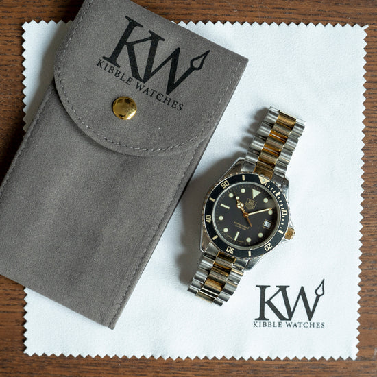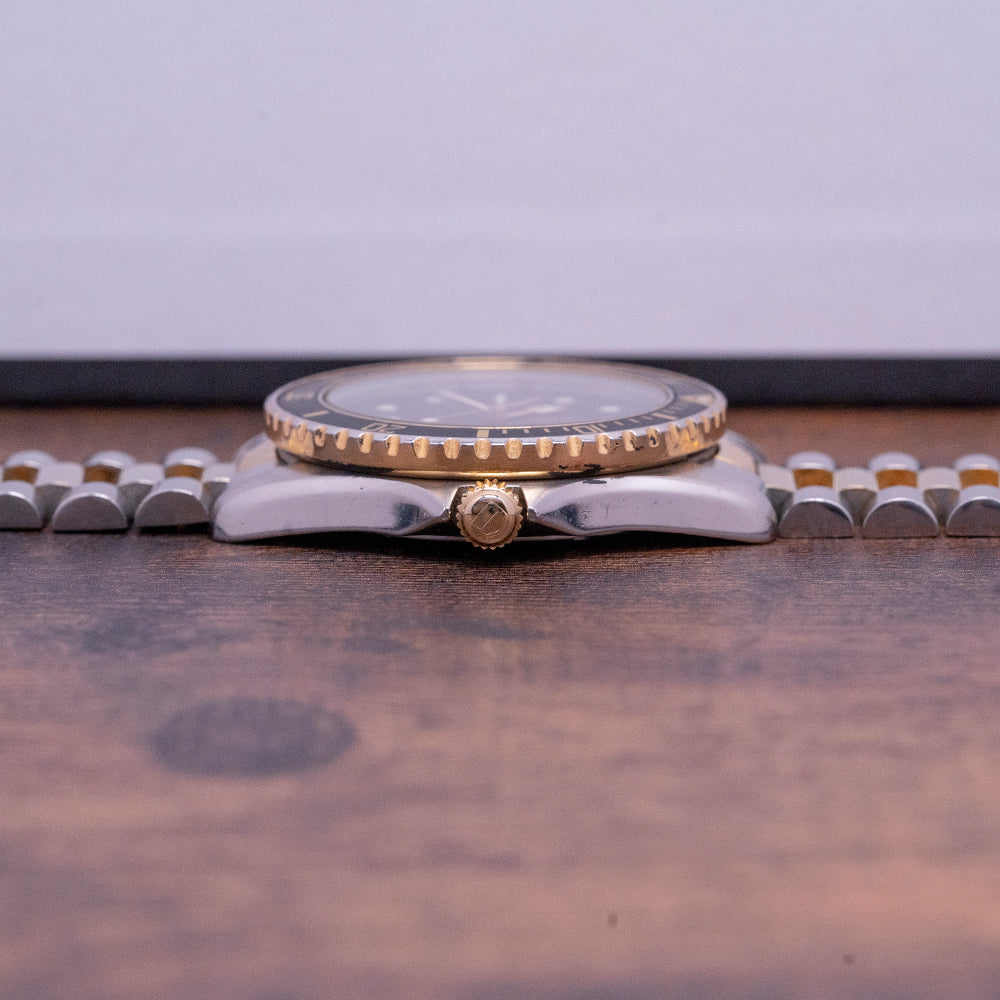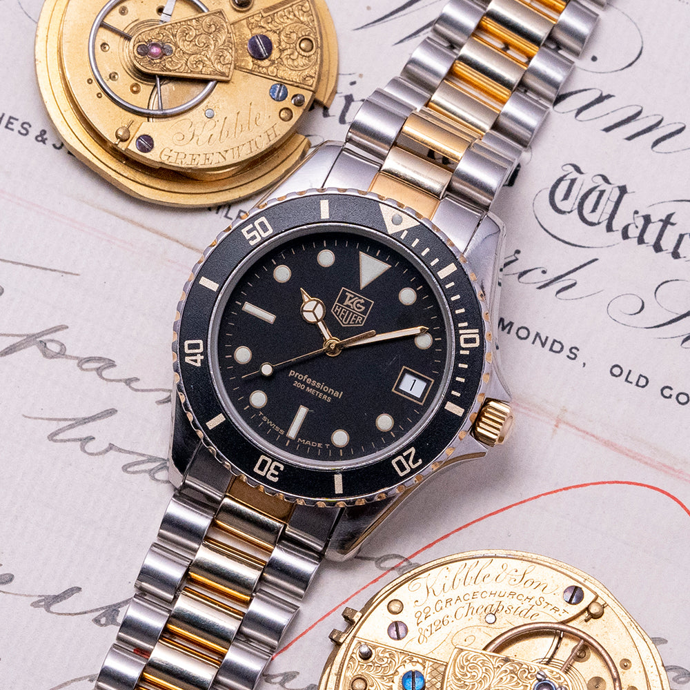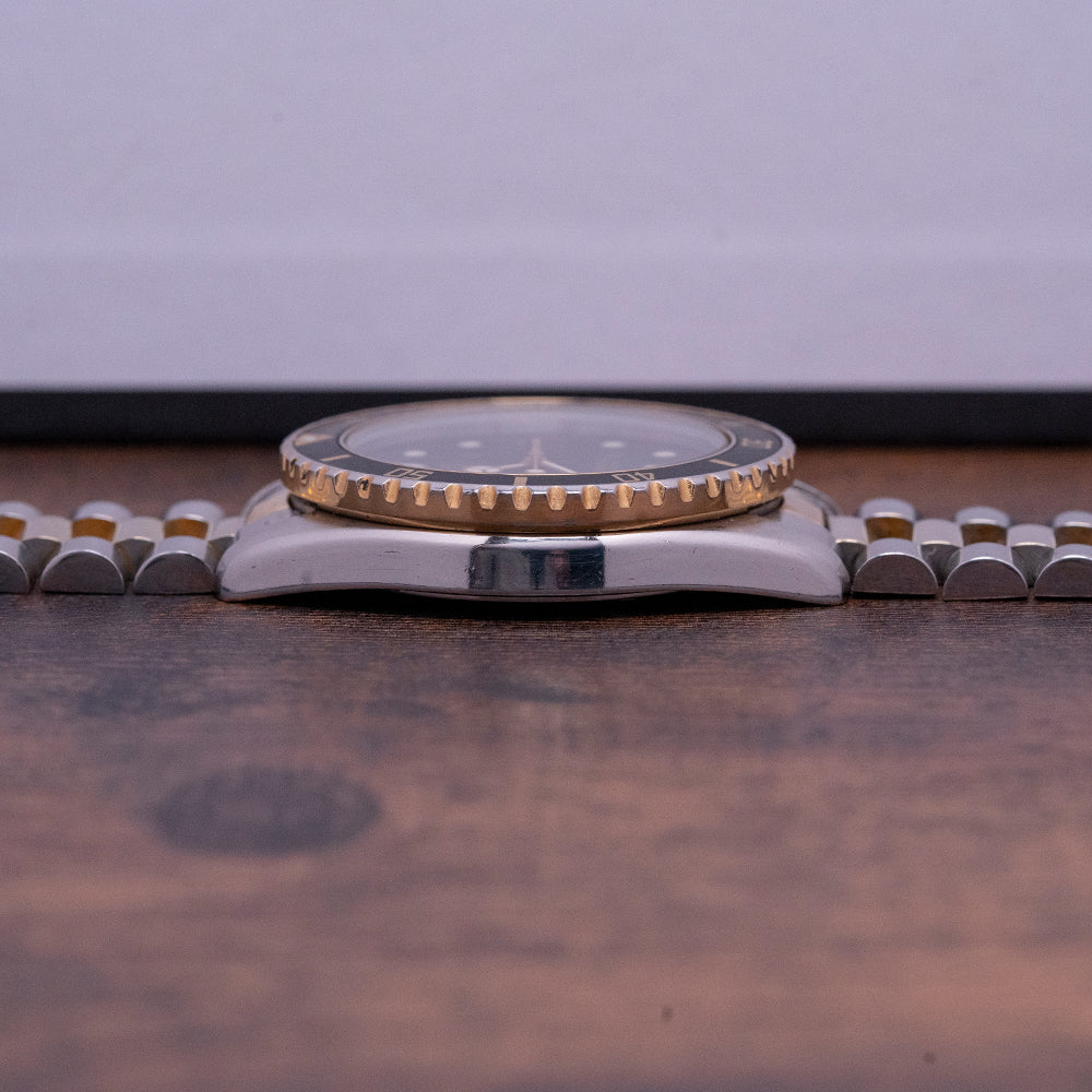 Here we have a 1980s TAG Heuer Professional Diver "Bi-Metal" Quartz 980.020D with a curvaceous 37mm gold plated/stainless steel case curving over your wrist with tapered lugs, a bevelled edge leads to a lug-to-lug length of 44.5mm and a case thickness of 9mm ensures a comfortable fit on your wrist. On the right side is a gold-plated signed crown protected by crown guards, and a rotating gold-plated bezel has a black anodised aluminium dive insert with silver numerals and markings holding a flat crystal above a matte black dial. An outer minute track surrounds tritium-coated disc and baton indexes and an inverted triangle at 12 o’clock marks the hours, at 3 o’clock a framed date window, and elegant gold-plated hands filled with tritium are complemented by a lollipop counterweighted second hand. At 12 o’clock we have the TAG Heuer motif and at 6 o’clock “Professional 200 metres” completes this vintage tool watch. On the reverse a screw-down case back with the details of the watch engraved around the edge and the TAG Heuer motif in the middle, inside a Quartz movement. The watch comes paired with its original 18mm stainless steel and gold-plated centre link TAG Heuer bracelet with a signed folding clasp and safety flip lock which will fit up to a 7.15-inch wrist.