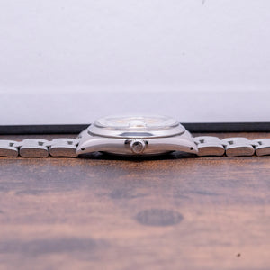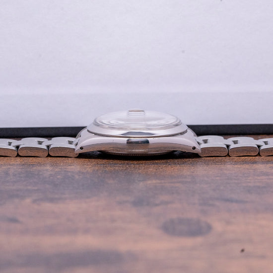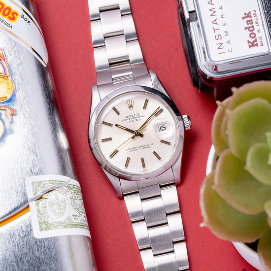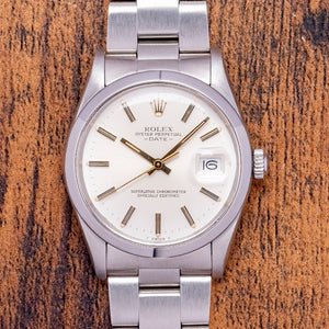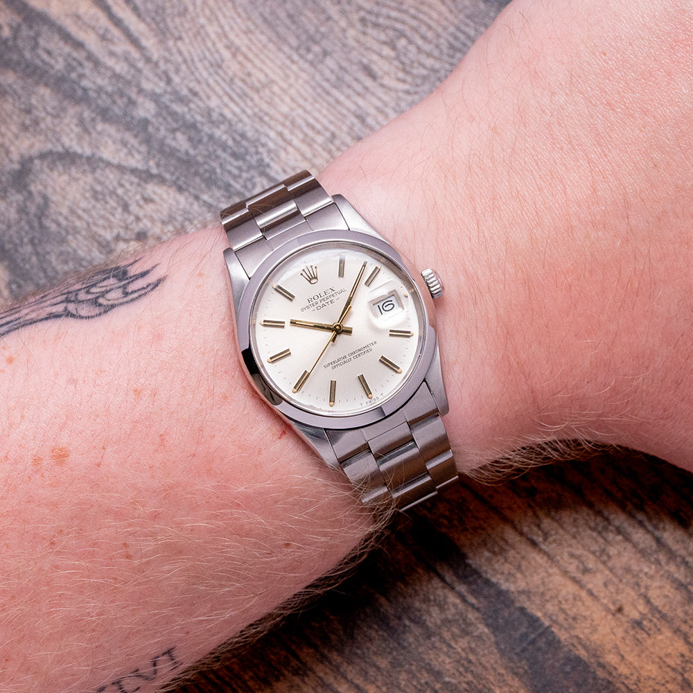Here we have a 1982 Rolex Oyster Perpetual Date Silver Dial 15000 with a 34mm stainless steel Oyster case, the case flows over your wrist with a lug-to-lug length of 42mm and a case thickness of 12mm, ensuring a comfortable fit on your wrist. On the right side is a signed crown. The smooth polished bezel holds a raised plexiglass above a sunburst silver dial, and an outer minute track is precisely printed with Tritium lume pips at the hours, with applied gold baton indexes marking the hours. At 3 o’clock, there is a date window with Cyclops magnification on the crystal. Elegant Gold baton hands are complemented by a sweeping tapered second hand. At 12 o’clock, we have an applied Rolex crown with “Rolex Oyster Perpetual Date” printed underneath and “Superlative Chronometer Officially Certified” at 6 o’clock. On the reverse, a screw-down coin-edged solid case back, inside an automatic Rolex Cal. 3035, which is fitted with a free-sprung Breguet overcoil hairspring and a bi-directional rotor, this movement was manufactured from 1977 until 1988. The watch comes paired with its 19mm Rolex Oyster bracelet with a signed folding clasp and will fit up to a 7.1-inch wrist.