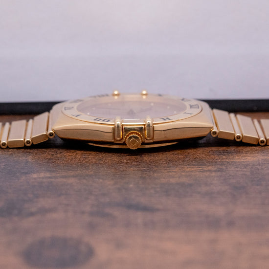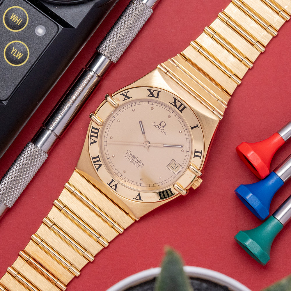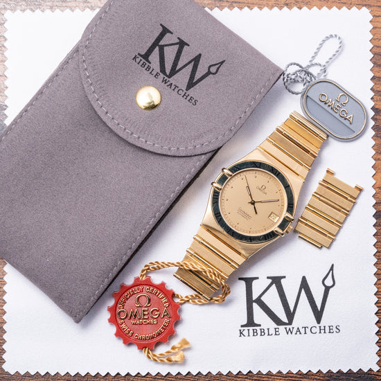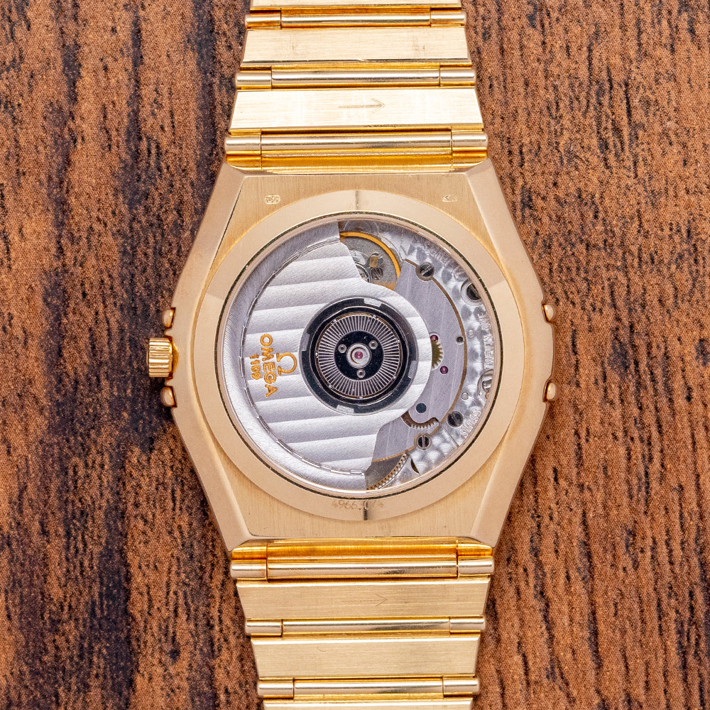 Here we have a very rare 1986 Omega Constellation Automatic 18ct Gold 368.1075 with a 35mm 18ct Yellow Gold tonneau case; the elegantly flowing lines of the integrated style bracelet lead to a lug-to-lug length of 40mm and a case thickness of just 7.5mm ensuring a comfortable fit on your wrist. On the right side is an 18ct yellow gold signed crown. The 18ct yellow-gold bezel has large black Roman numerals and design elements that remind us of a porthole on a ship; a flat crystal sits above a golden hue dial. An outer minute rail track is precisely executed with applied gold pips marking the hours and, at 3 o’clock, a framed colour-matched date window. Elegant 18ct yellow gold hands are filled with lume and are complemented by a tapered second hand; at 12 o’clock, we have the Omega motif, and at 6 o’clock, “Constellation Chronometer Automatic” completes this striking dress watch. On the reverse, an exhibition case back, hallmarks are present, inside an automatic Omega Cal. 1109, 21 jewels, beating at 28,800 beats per hour; this quality movement has a base of the ETA 2892-A2. The watch comes fitted with its original full and heavy Omega 23mm 18ct yellow gold integrated tapered bracelet with a signed push button concealed clasp; all links are provided and come with its Omega swing tags.