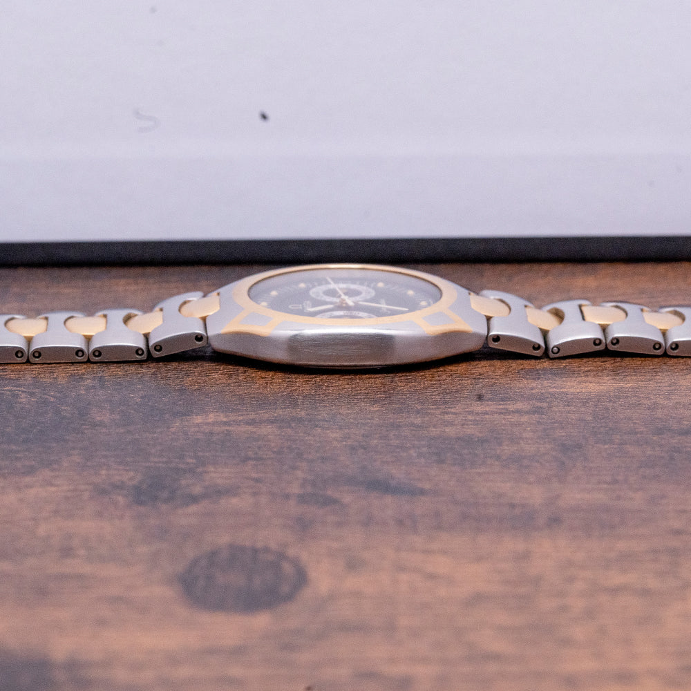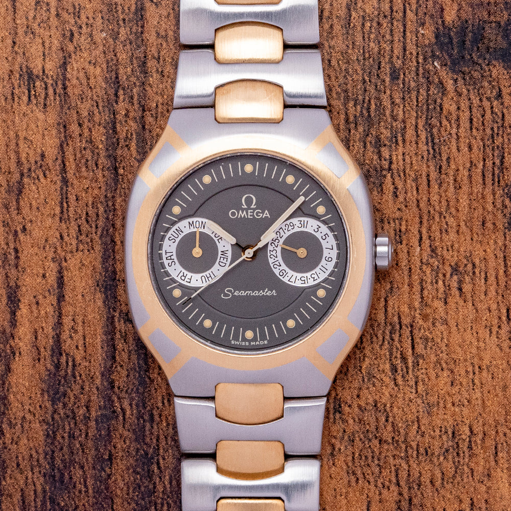 Here we have a 1986 Omega Seamaster Polaris Two-Tone Owl Dial on a Bracelet 396.1022 with a 31.5mm brushed stainless steel cushion-shaped case that flows over your wrist thanks to the integrated H-Link bracelet, and a lug-to-lug length of 42mm and a case thickness of just 6.5mm ensure a comfortable fit. On the right side is a signed crown and the gold geometric-shaped bezel surrounds a flat crystal above the affectionately named “Owl Dial” due to the bicompax arrangement. A raised outer minute chapter ring has lume surrounding a day register and date register, outlined in silver with black markings and gold-toned hands. Slender baton hands filled with lume are complemented by a tapered second hand, at 12 o’clock we have the Omega motif and at 6 o’clock “Seamaster” completes this striking timepiece. On the reverse, a snap-off brushed case back engraved with Omega Seamaster, inside a quality Quartz Omega Cal. 1445 movement, 6 jewels with a base of the ETA 255.451. The watch comes paired with its Omega 18mm H-link steel and gold integrated bracelet and signed concealed deployant clasp, links are provided and will fit up to a 7.15-inch wrist, including the watch's swing tag.