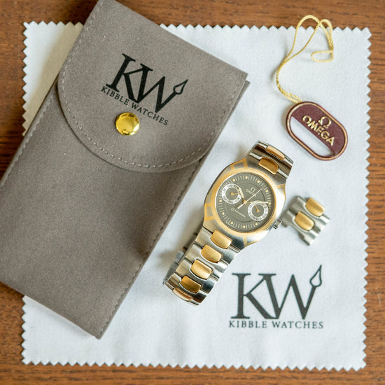 This watch is sold as "Watch Only" and therefore comes with no Omega box or Omega paperwork. The watch comes paired with its two-tone Omega 18mm H-link integrated bracelet and signed concealed deployant clasp, links are provided and will fit up to a 7.15-inch wrist, including the watch’s swing tag. The watch is from Circa. 1986 and is in worn vintage condition, with age-related wear, as you can see and comes with our 12-Months NON-Waterproof Warranty.