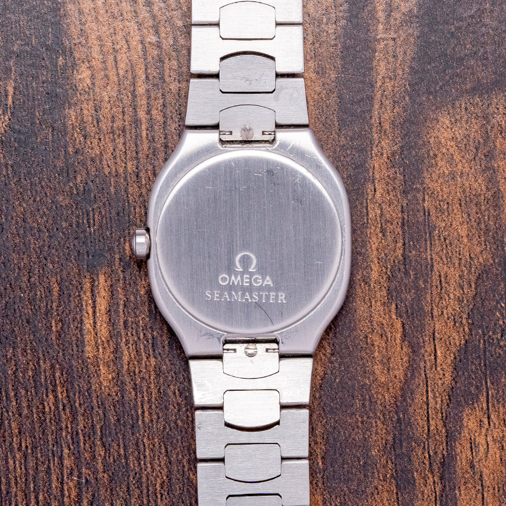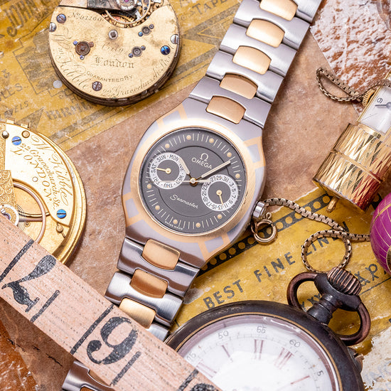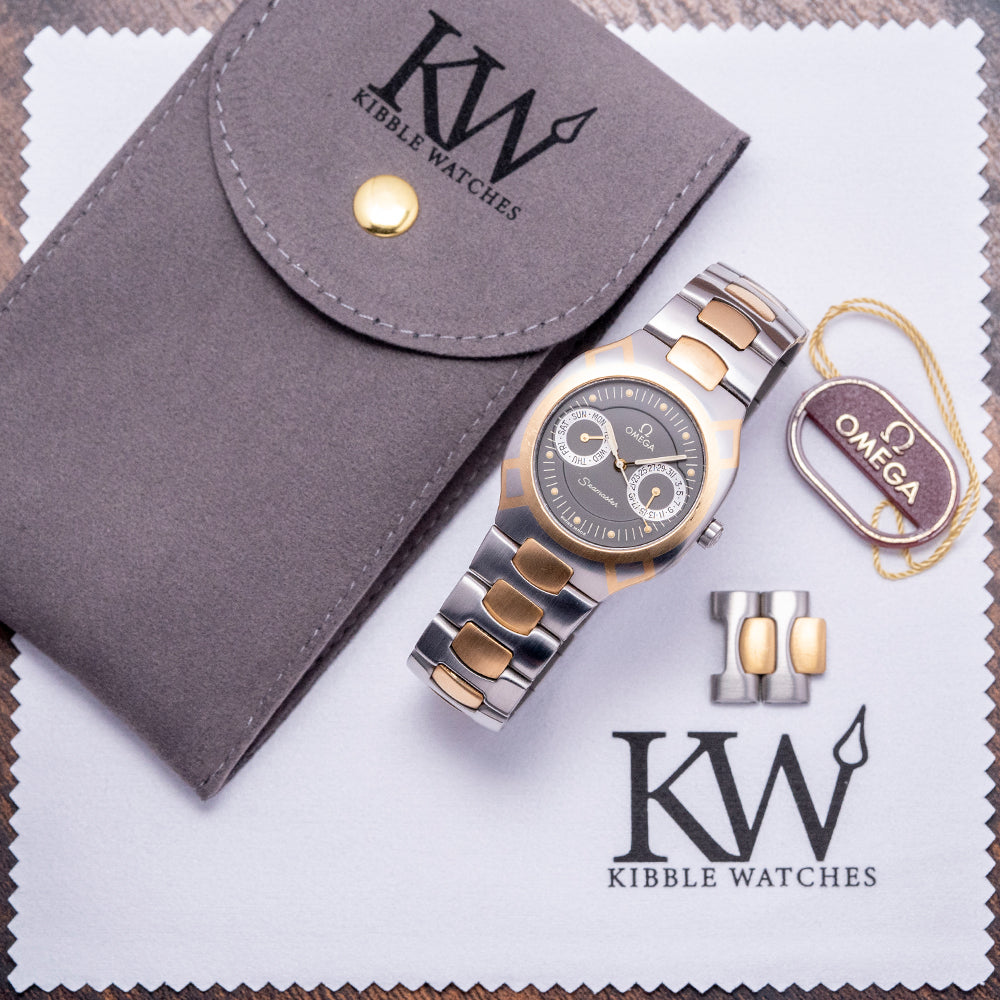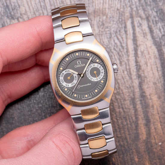 Here we have a 1986 Omega Seamaster Polaris Two-Tone Owl Dial on a Bracelet 396.1022 with a 31.5mm brushed stainless steel cushion-shaped case that flows over your wrist thanks to the integrated H-Link bracelet and a lug-to-lug length of 42mm and a case thickness of just 6.5mm ensure a comfortable fit. On the right side is a signed crown, and the gold geometric-shaped bezel surrounds a flat crystal above the affectionately named “Owl Dial” due to the bicompax arrangement. A raised outer minute chapter ring has lume surrounding a day register and date register, outlined in silver with black markings and gold-toned hands. Slender baton hands filled with lume are complemented by a tapered second hand; at 12 o’clock, we have the Omega motif, and at 6 o’clock, “Seamaster” completes this striking timepiece. On the reverse, a snap-off brushed case back engraved with Omega Seamaster, inside a quality Quartz Omega Cal. 1445 movement, six jewels with a base of the ETA 255.451. The watch comes paired with its Omega 18mm H-link steel and gold integrated bracelet and signed concealed clasp; links are provided and will fit up to a 7.15-inch wrist, including the watch's swing tag.