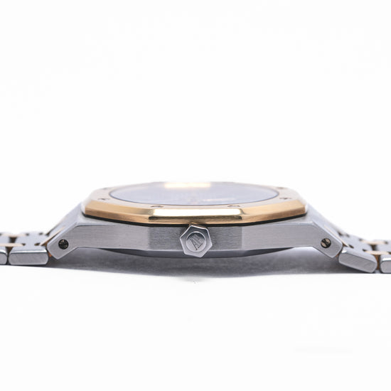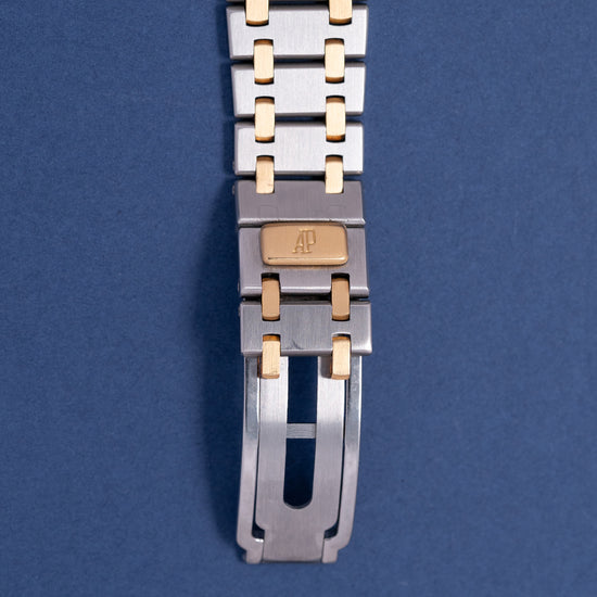 This watch is sold with an Audemars Piguet service box. The watch comes paired with its original 23mm brushed integrated gold and steel bracelet with a signed hidden clasp, spare links included. The watch is from Circa. 1987/90 and is sold in worn condition with signs of wear, a full case and bracelet refurb can be provided at an additional cost. The watch comes with our 12-Months NON-Waterproof Warranty.