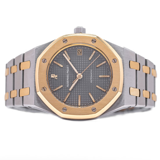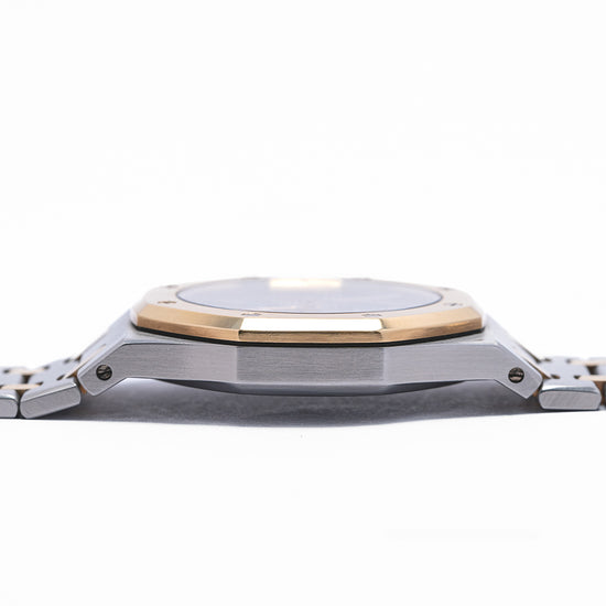 Here we have the iconic 1987/90 Audemars Piguet Royal Oak 36mm Automatic 14700SA, designed by Gerald Genta in 1971 the original Ref 5402A design is inspired by a commercial divers scuba helmet, he got the name Royal Oak from a series of eight ships of the Royal Navy that took their naming convention from the hollowed oak tree that King Charles 2nd hid whilst escaping the roundheads who were supporters of the English parliament during the English civil war 1642-1651. The 36mm tonneau-shaped stainless steel and 18ct yellow gold case flow over your wrist with angular sloped lugs that perfectly encompass the integrated bracelet, a lug-to-lug length of 46mm and a case thickness of just 7.5mm ensure a comfortable fit on your wrist. On the right side the characteristic hexagonal crown, the 18ct yellow-gold octagonal bezel sits on an exposed rubber gasket. It has screw detailing reminiscent of a commercial divers helmet holding a flat sapphire crystal above a grey waffle dial. Applied yellow gold baton indexes mark the hours, at 3 o’clock a date window, slender baton yellow gold baton hands sit majestically complemented by a tapered sweeping second hand. At 12 o’clock we have the Audemars Piguet motif and at 6 o’clock "Automatic" completes this iconic versatile luxury sports watch. On the reverse, a screwed-down case back with Royal Oak engraved across the centre, inside an automatic Audemars Piguet Cal. 2125. The watch comes fitted with a 23mm yellow-gold and brushed integrated steel bracelet and signed hidden clasp, and the watch comes with an Audemars Piguet service box.