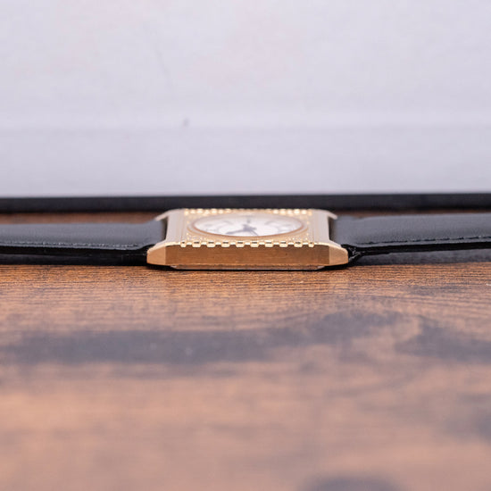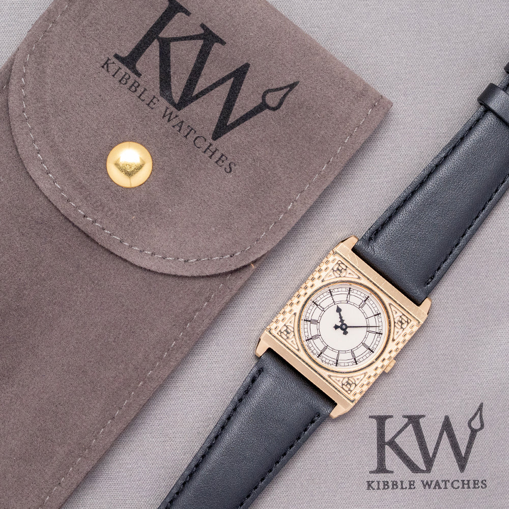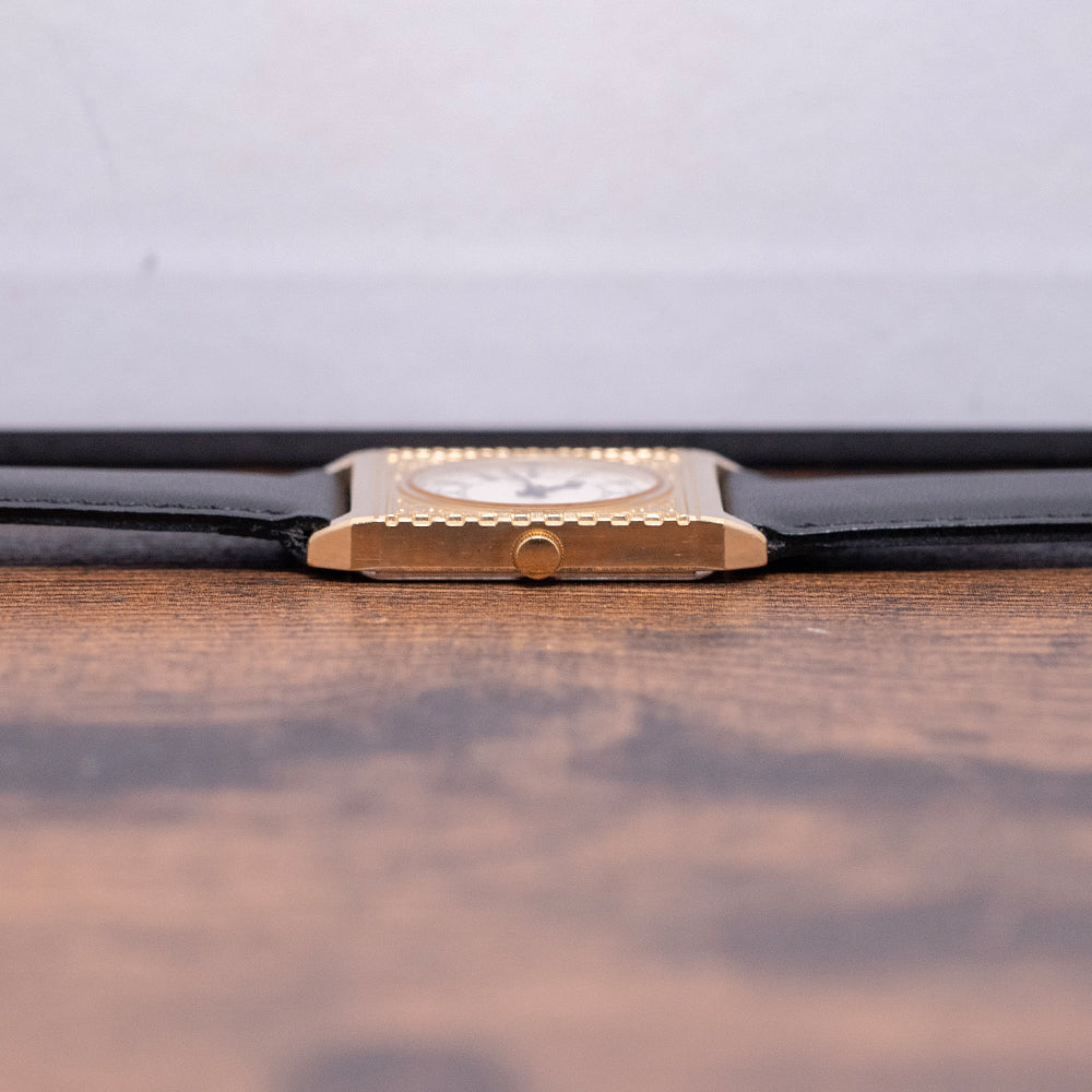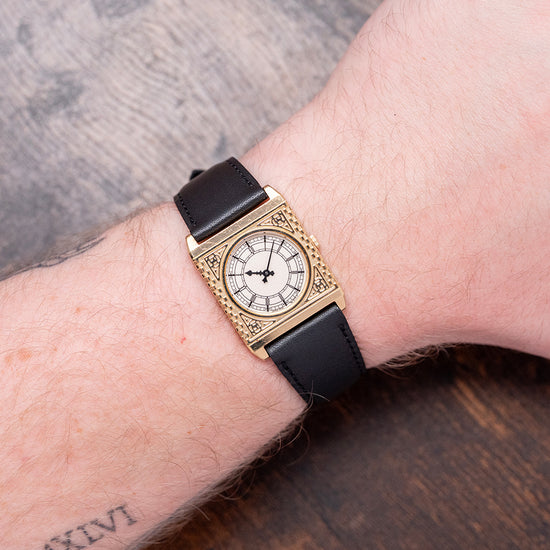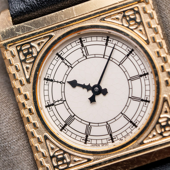 Here we have a rare 1987 Seiko 'Big Ben' Gold-Plated Quartz 5P30-6150. Made in collaboration with the Franklin Mint and inspired by the iconic Westminster Elizabeth Tower ‘Big Ben’ clock in London. Featuring a 25mm square gold-plated case that sits comfortably on your wrist with stubby, angled lugs. Its straight flanks lead to a lug-to-lug length of 33mm and a case thickness of just 5mm. On the right side, a coin-edged crown. An intricately engraved bezel surrounds a round crystal above a white dial mimicking the distinctive clock face. An outer minute track surrounds Roman numerals marking the hours. Elegant black spade and sword hands complete the dial. On the reverse, a stainless steel snap-off case back engraved with the watch's details, housing a Seiko quartz Cal. 5P30 movement. It comes paired with a well-suited 19mm strap and pin buckle.