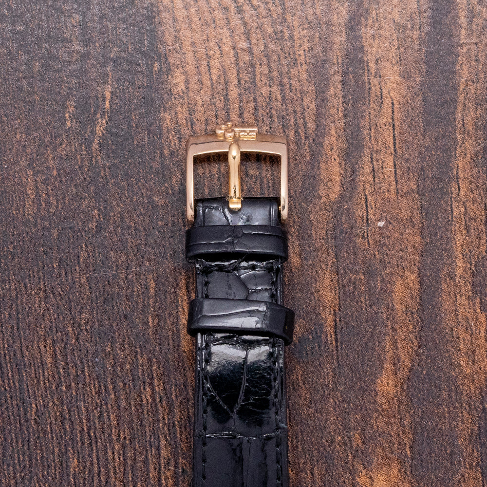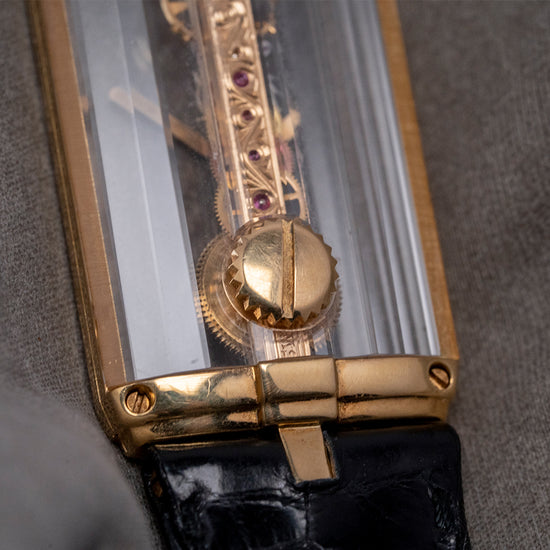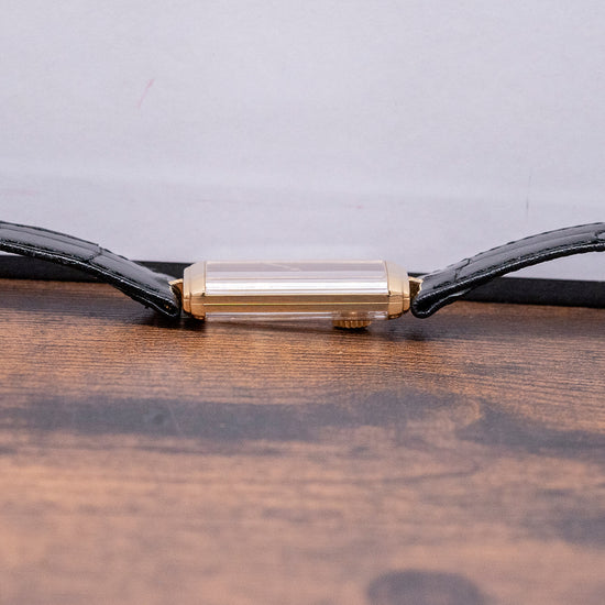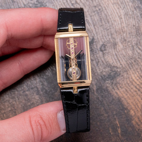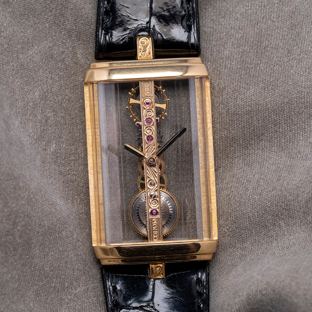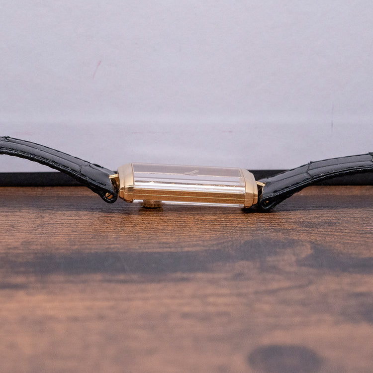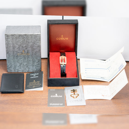 Here we have a rare 1988 Corum Golden Bridge 18ct Gold Mid-Size 13.150.56 with a 20mm rectangular 18ct yellow gold case that comfortably sits on your wrist with an attractive decorated screwed ‘T’ bar. The straight flanks lead to a lug-to-lug length of 33mm and a case thickness of just 7.5mm, ensuring a comfortable fit on your wrist. The top of the case has a step at either end. It holds a rectangular, domed facet sapphire crystal showcasing the intricately engraved Golden Bridge that holds the vertical movement and hands of the watch, engraved ‘Corum and 690’ on the front, on the reverse, a screwed-down exhibition facet sapphire case back with the winding and hand adjustment mechanism attached. The Manually Wound Corum Bridge is intricately engraved, just like the front. It comes paired with its well-suited cut to fit 17mm leather strap and gold-plated Corum pin buckle. This watch is sold with it's Corum presentation box and paperwork.