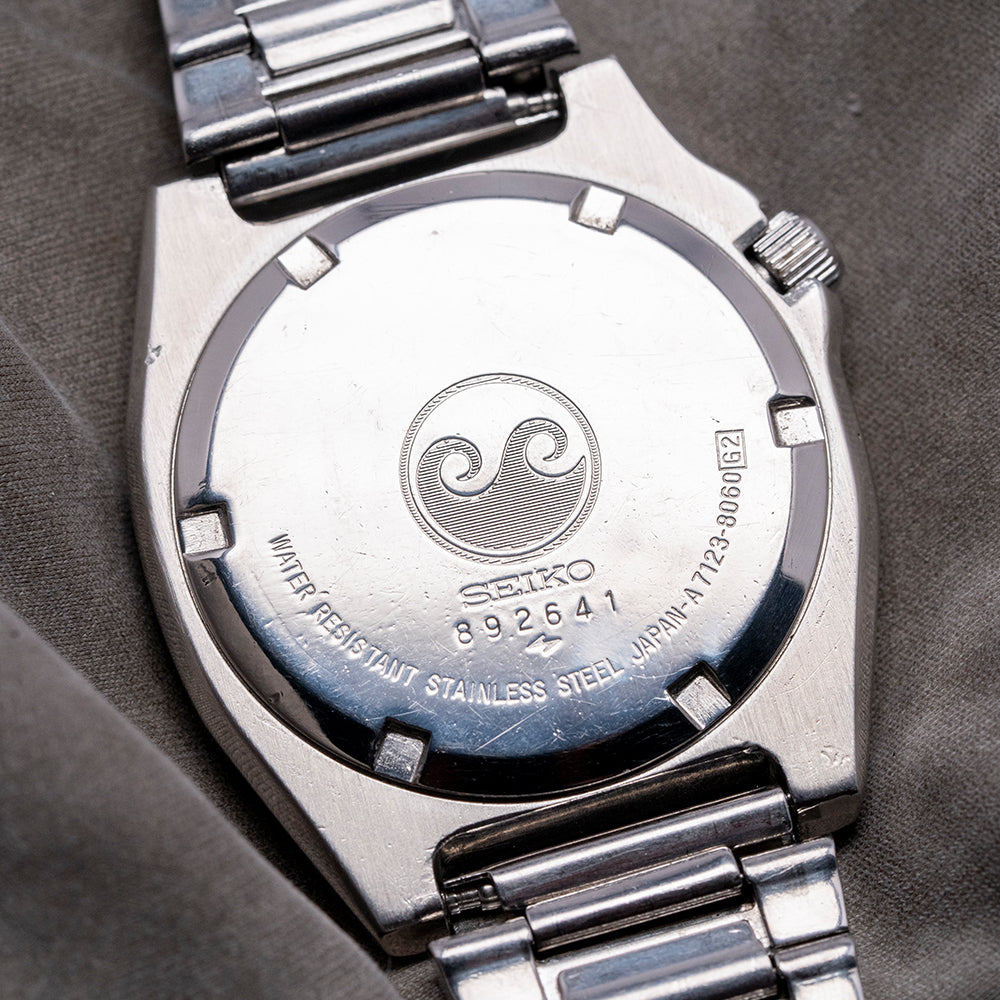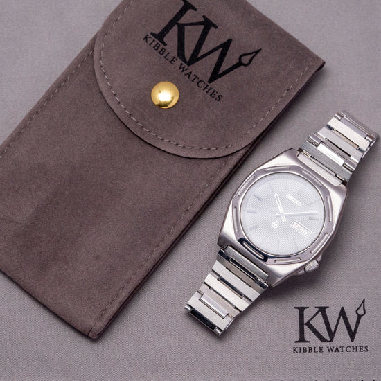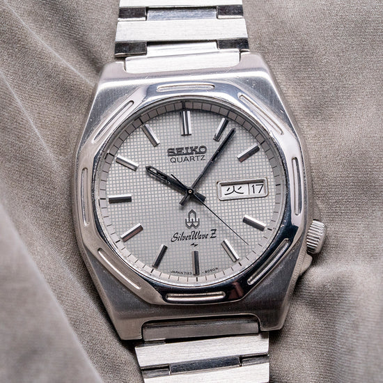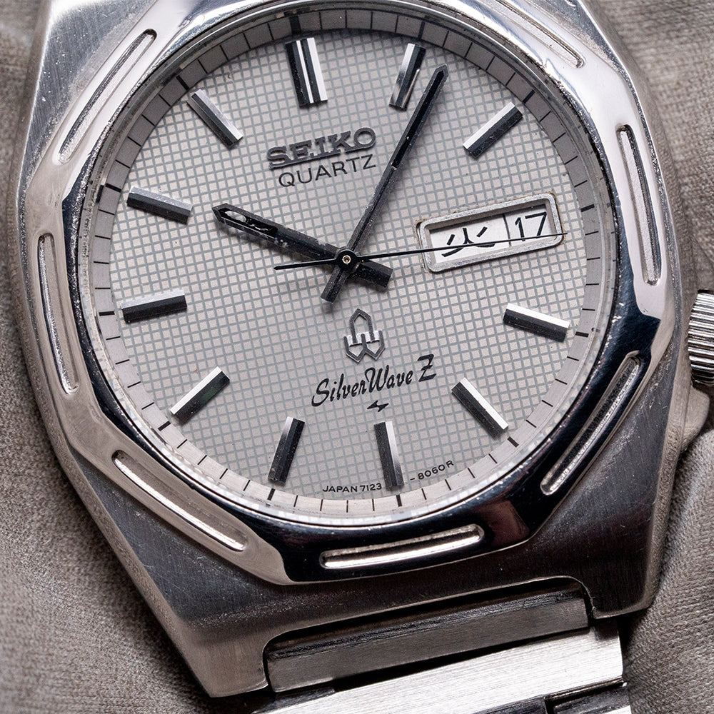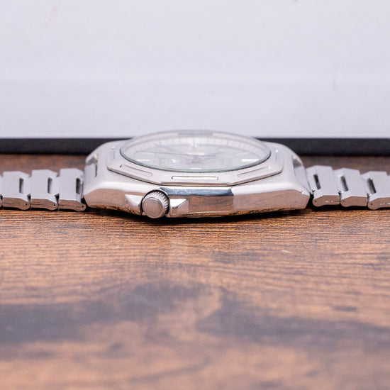 Here is a very rare reference 1988 Seiko Quartz SilverWave Z 'Royal Oak' 7123-8060 with its brushed and polished 36.5mm tonneau-shaped stainless steel case that sits comfortably on your wrist thanks to the flat-ended lugs. The angular flanks lead to a lug-to-lug length of 43mm and a case thickness of 9.5mm, providing the watch with an impressive wrist presence. At 4 o’clock, there is a coin-edged crown protected by crown guards. An octagonal bezel with attractive hollow sections and dial design gives the watch its ‘Royal Oak’ aesthetic. A flat Hardlex crystal sits above a striking silver tile-patterned dial. An outer minute chapter ring surrounds applied polished facet-edged baton indexes marking the hours, at 3 o’clock, a framed (Kanji) day and (English) date window. Polished steel hands are complemented by a tapered second hand. At noon, the applied Seiko motif, ‘Quartz’, is printed underneath, and at 6 o’clock, the single Quartz crystal symbol ‘SilverWave Z’ completes this distinctive, rarely seen timepiece. On the reverse, a screw-down solid case back engraved with the details of the watch and a stylised wave in the centre, inside a Quartz Seiko Cal. 7123. It comes paired with its original full-sized 18mm brushed and polished stainless steel bracelet, nicely tapering towards the signed folding clasp.