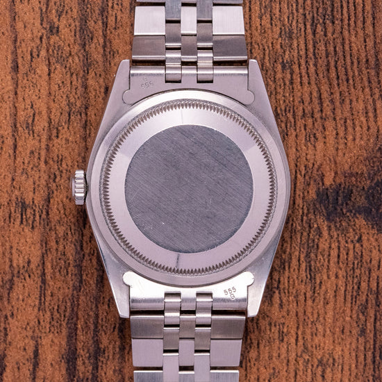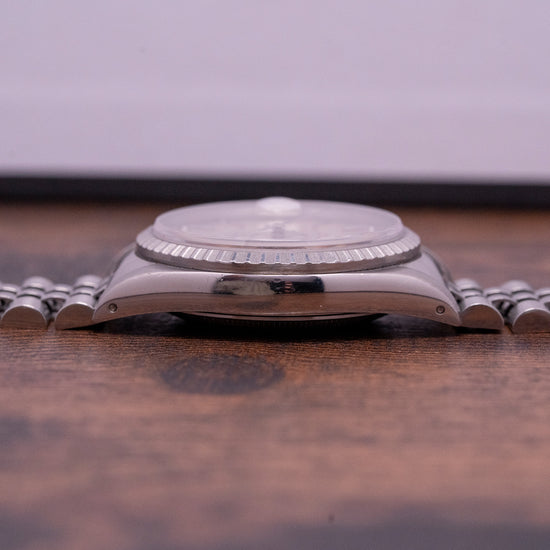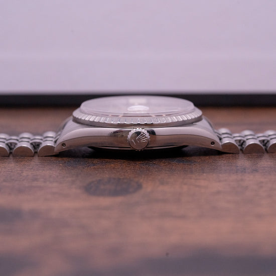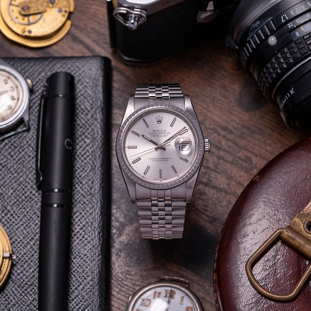 Here we have a 1990 Rolex Datejust 36mm on Jubilee 16220 Box & Papers, a curvaceous 36mm Oyster stainless steel case, with a lug-to-lug length of 43.5mm and a case thickness of 11.5mm that elegantly fits your wrist with finely tapered drilled lugs. On the right side, is a signed screw-down crown, and polished and brushed surfaces transition with crisp lines. An engine-turned stainless steel bezel holds a domed sapphire crystal. The striking sunburst silver dial has an outer minute track with Tritium pips surrounding applied baton indexes marking the hours, at 3 o’clock a date window with a cyclops magnification on the crystal, making the date easily read, slim steel baton hands Tritium infilled along with a tapered sweeping seconds hand, an applied Rolex crown sits at 12 o’clock with “Oyster Perpetual DateJust”, at 6 o’clock “Superlative Chronometer Officially Certified”. On the reverse, a coin edge screw-down case back, inside an automatic Rolex Cal. 3135, 31 jewels, 28,800 beats per hour, this workhorse movement launched in 1988 has hacking seconds and quickset date functionality for your convenience. The watch comes paired with its 20mm Rolex 5-link Jubilee stainless steel bracelet with a signed folding clasp and comes with its Rolex presentation box, swing tags and paperwork.