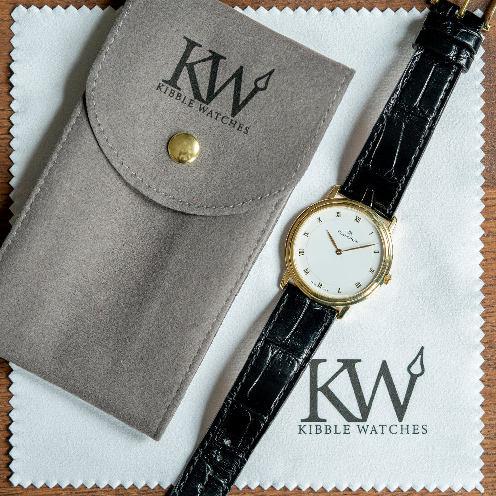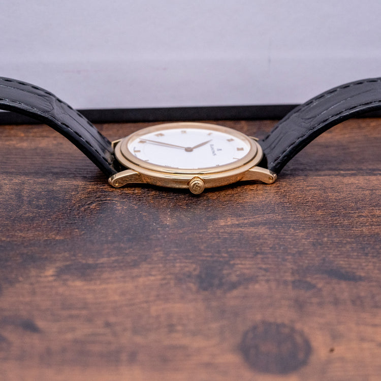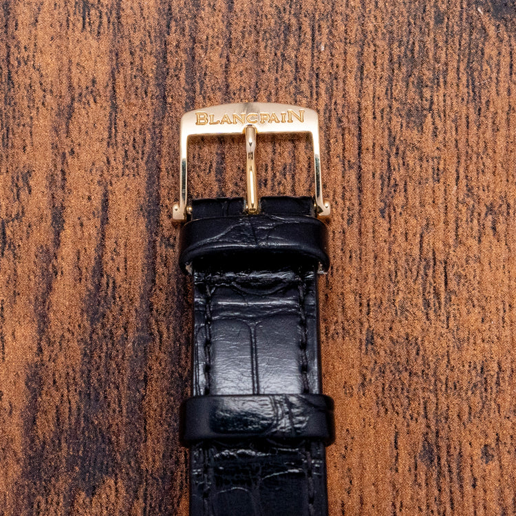 Here we have a 1990s Blancpain Villeret 0021-1418 with a curvaceous 34mm 18ct Yellow Gold round case that gently curves over your wrist thanks to straight drilled lugs, it is Swiss-hallmarked. The Villeret collection was named after Blancpain's birthplace and incorporates elements from their long and illustrious history. A lug-to-lug length of 38mm and a case thickness of just 5mm ensures a comfortable fit on your wrist. On the right side is a coin-edged crown sitting slightly recessed in-keeping with its thin profile. A stepped smooth bezel holds a flat sapphire crystal above a crisp white dial, applied gold Roman numeral indices mark the hours, elegant 18ct Yellow gold leaf hands sit majestically in the centre, and at 12 o’clock, we have the Blancpain motif completing this sophisticated two-hand dress watch. On the reverse, an exhibition snap-off case back with the details of the watch engraved around its edge, inside a manually wound Blancpain Cal. 21, 18 jewels, beating at 21,600, this ultrathin movement introduced in 1925 remains one of the world's thinnest watch movements. The watch comes paired with a 19mm Blancpain leather strap and an 18ct Yellow Gold pin buckle.