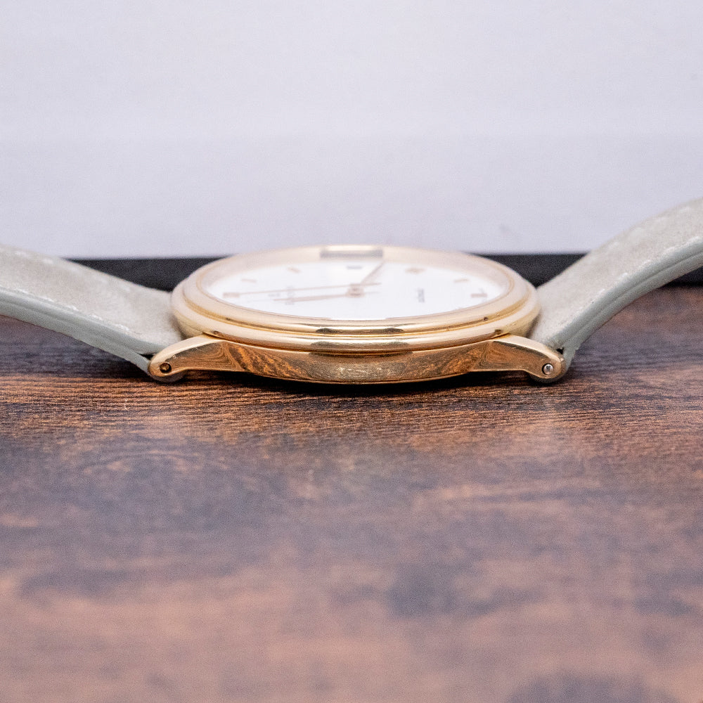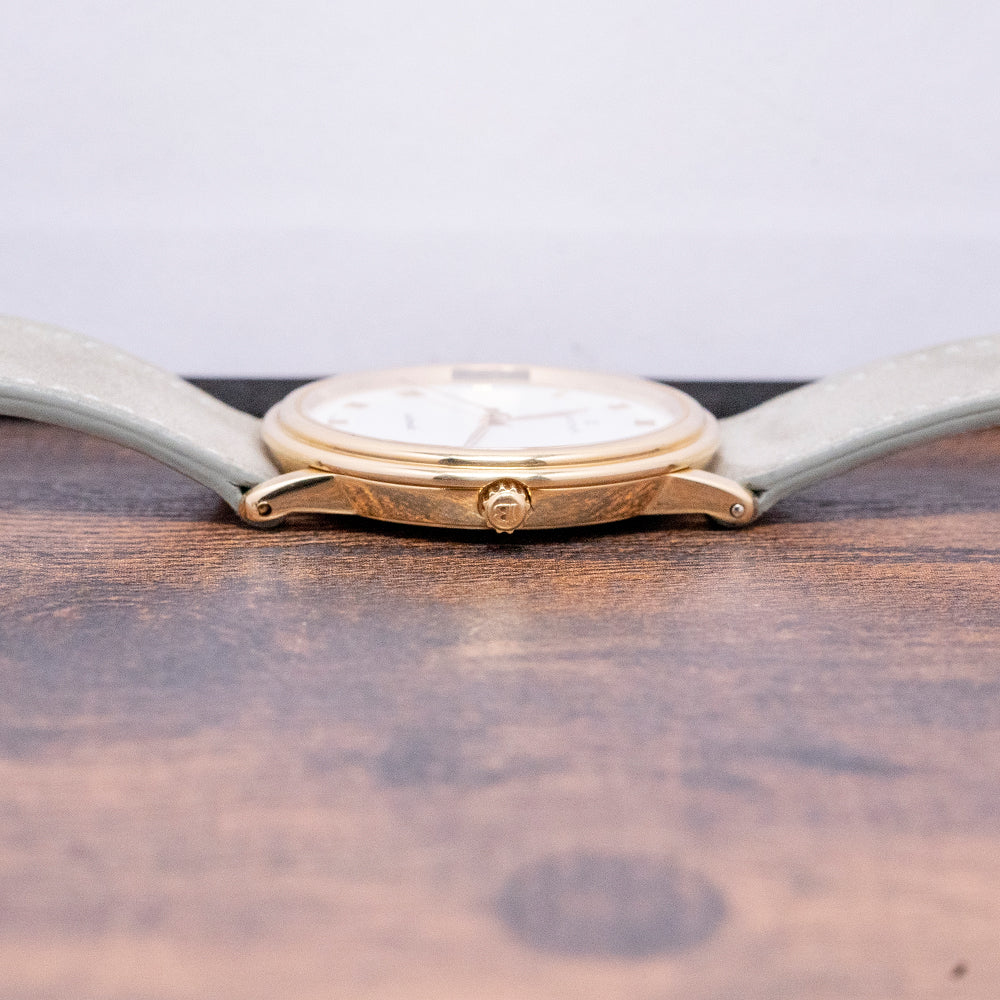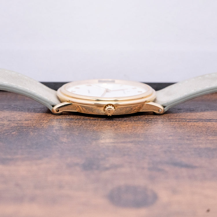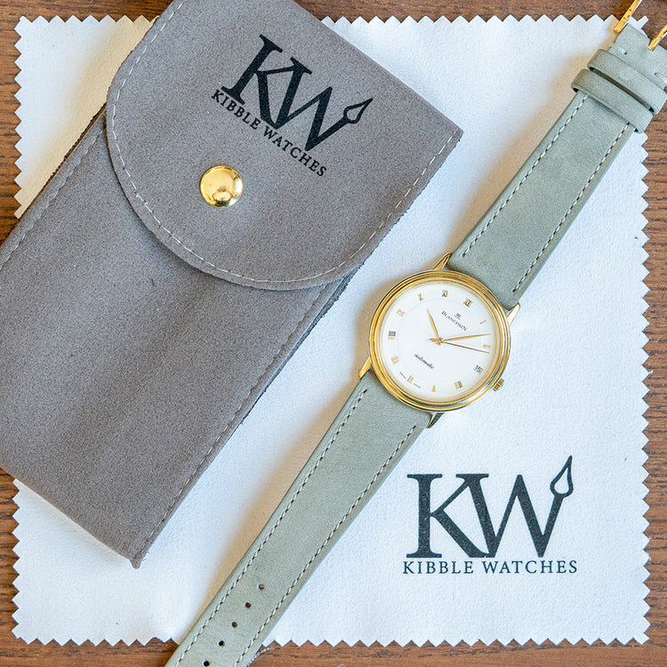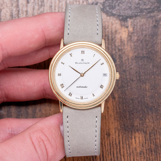 Here we have a 1990s Blancpain Villeret Automatic Date with a curvaceous 34mm 18ct Yellow Gold round case that gently curves over your wrist thanks to straight drilled lugs; it is Swiss-hallmarked. The Villeret collection was named after Blancpain's birthplace and incorporates elements from their long and illustrious history. A lug-to-lug length of 37.5mm and a case thickness of just 6.5mm ensures a comfortable fit on your wrist. On the right side is a coin-edged domed crown. A stepped smooth bezel holds a flat sapphire crystal above a crisp white sector style dial, applied gold Roman numeral indices mark the hours at 3 o’clock, a colour-matched date window, elegant 18ct Yellow gold leaf hands sit majestically in the centre complemented by a tapered second hand, and at 12 o’clock, we have the Blancpain motif and at 6 o’clock “Automatic” completing this sophisticated dress watch. On the reverse, an 18ct yellow gold snap-off case back with the details of the watch engraved and the Swiss hallmarks, inside an Automatic Blancpain Cal. 9513, 19 jewels, beating at 21,600, this thin movement was made by Frédéric Piguet S.A. The watch comes paired with a 19mm Blancpain leather strap and an 18ct Yellow Gold pin buckle.