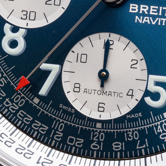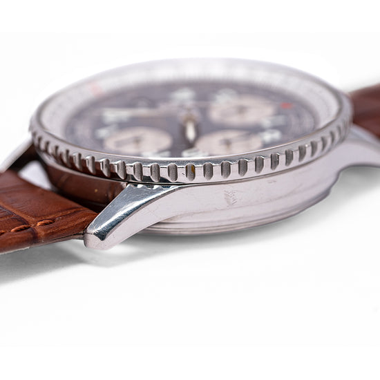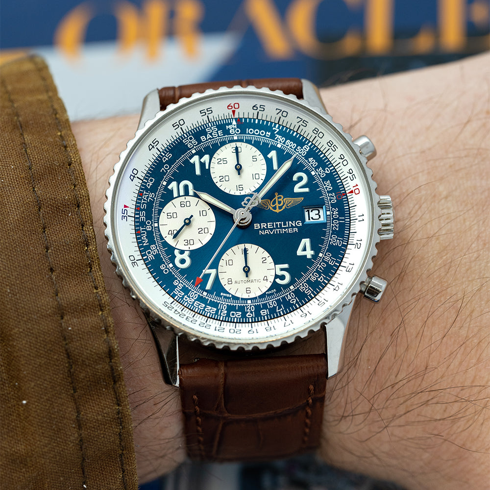 Here we have a 1990s Breitling Old Navitimer II Automatic Blue Arabic A13022 with a 41mm stainless steel case that curves over your wrist with thick chamfered edges tapered lugs, a lug-to-lug length of 47.5mm and a case thickness of 13.5mm gives the watch an impressive wrist presence. Down the right side, we have the chronograph piston pushers and a signed crown. A bidirectional stainless steel bezel has a white rotating logarithmic slide-rule navigation computer which makes complex mathematical calculations useful to pilots. You can measure a lot of things such as gasoline consumption, miles per minute, ground speed, rate of descent/climb, distance in descent/climb and nautical / statute mile conversion. The flat sapphire crystal AR coated sits above the blue dial. A silver Telemetric scale surrounds large Arabic numerals coated in luminance to mark the hours, at 3 o’clock a framed date window, at 12 o’clock a 30-minute register with a blue hand, at 6 o’clock a 12-hour register with a blue hand and finally at 9 o’clock the continuous second register with a blue hand, each register is silver creating a nice contrast against the blue dial. Steel syringe style hands infilled with luminance complemented by a red-tipped chronograph hand complete with its Breitling anchor counterweight. At 3 o’clock we have the Breitling motif with Breitling Navitimer printed underneath completing this dynamic tool watch. On the reverse, a screw-down case back with an engraved temperature scale from degrees centigrade to Fahrenheit and embossed Breitling Navitimer wings in the centre, inside an automatic Breitling Cal. 13, 25 jewels beating at 28,800 beats per hour, the movement has a base of the ETA 7750 and is used in many of the Breitling ranges. The watch comes fitted on an aftermarket 22mm brown leather strap, the original heavily worn 22mm Breitling brown leather strap with a worn signed buckle is in the box and the watch comes with its Breitling presentation box, Breitling service records and swing tag.