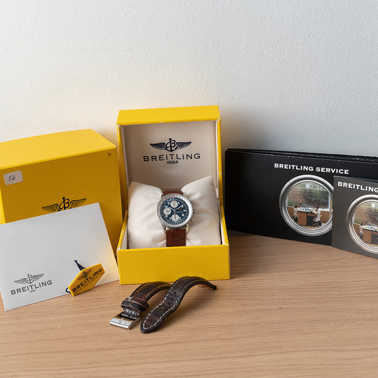 This watch is sold with its original Breitling box and Breitling service records. The watch comes paired with an aftermarket 22mm brown leather strap, and the original heavily worn 22mm Breitling brown leather strap with a worn signed buckle is in the box. The watch is from Circa. 1990s and is sold in worn condition, with some faint hairline scratches to the anti-reflective coating, the bezel rotates but is quite tight, in May 2012 service paperwork shows a new dial, hands and bezel were fitted during that service. The case and buckle can be refurbished to look close to new, please get in contact if you'd like a quote on getting this done. The watch comes with our 12-Months NON-Waterproof Warranty.
