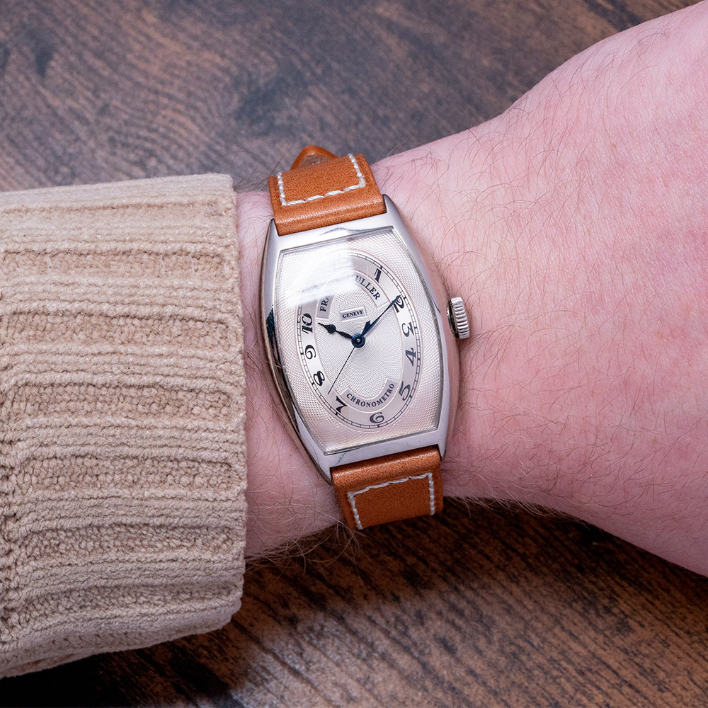 Here we have a 1990s Franck Muller Cintré Curvex Chronometro 5850 with a curvaceous 31.5mm Tonneau-shaped 18ct White Gold case that gently curves over your wrist with a lug-to-lug length of 45mm and a case thickness of 11mm ensuring a comfortable fit. On the right side is a signed crown, and a domed sapphire crystal sits above a stunning silver Guilloché dial. An oval minute track surrounds large Arabic black painted numerals marking the hours, elegant blued steel hands are complemented by a tapered sweeping second hand, at 12 o’clock we have the Franck Muller motif and at 6 o’clock “Chronometro” completes this exquisite sophisticated dress watch. On the reverse a screwed-down white gold case back with deep engraving “Master of Complications”, inside an automatic Franck Muller Cal. 2800 (Platinum Rotor), this quality modified movement has a base of the ETA 2892-2. The watch comes paired with a suitable aftermarket 18mm leather strap with its 18ct White Gold Franck Muller pin buckle.