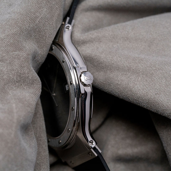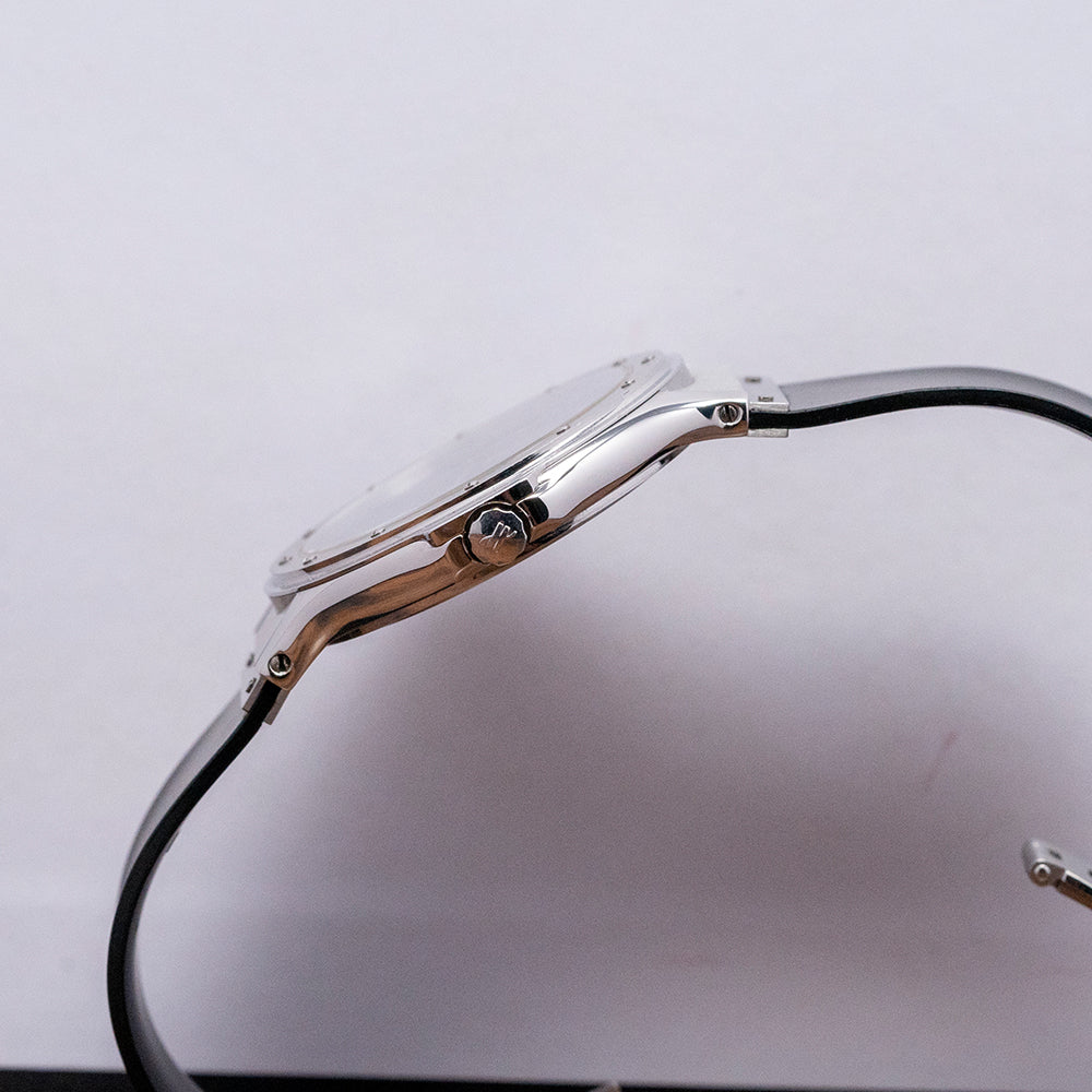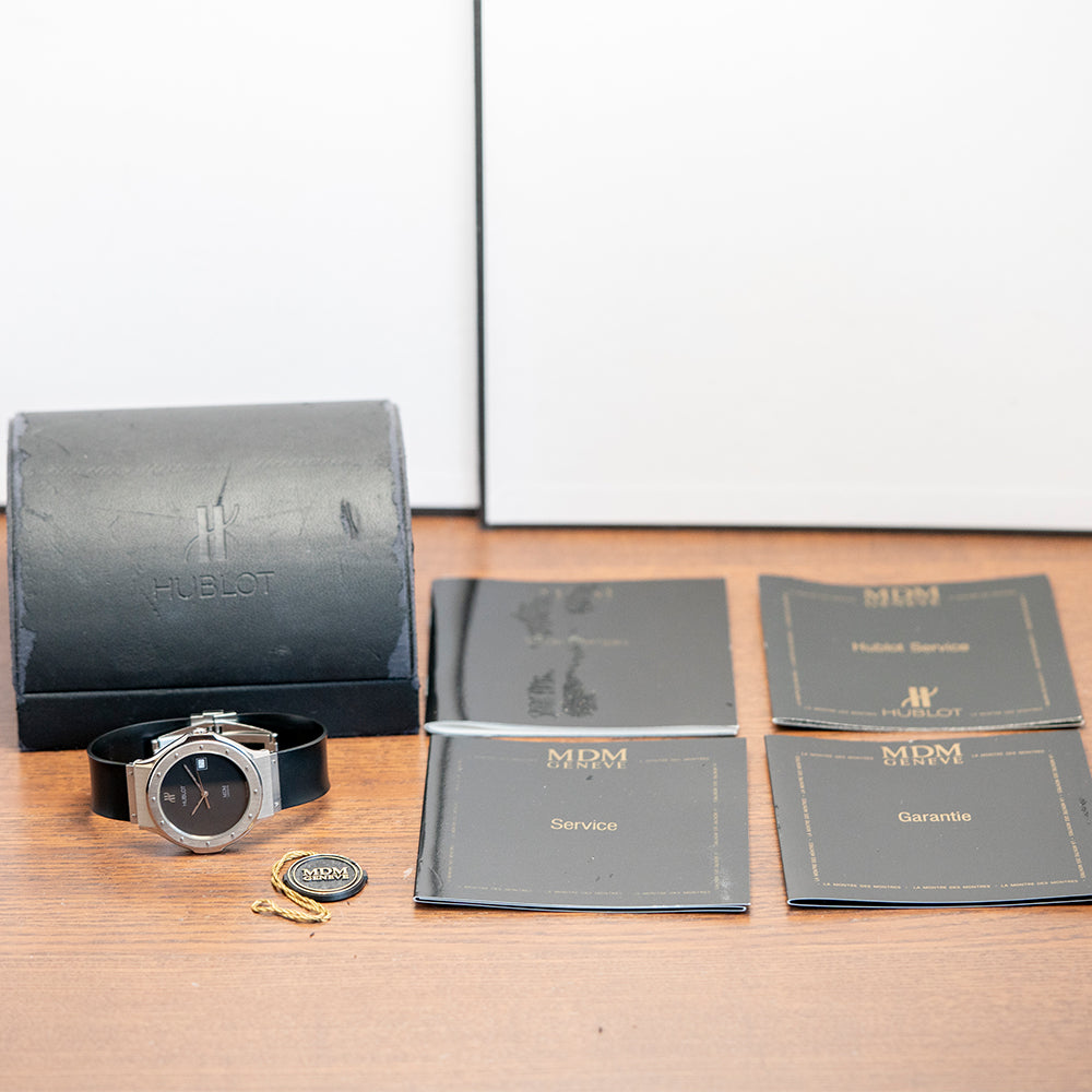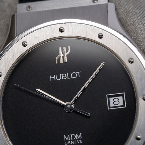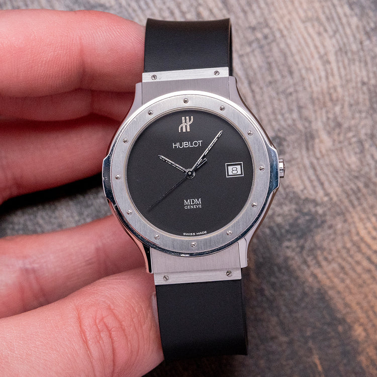 Here we have a 1990s Hublot Classic MDM Geneve Quartz 1521 with its distinctive Carlo Crocco-designed 36mm polished and brushed stainless steel case that curves over your wrist with finely tapered screwed lugs, and a lug-to-lug length of 43.5mm and a case thickness of just 6.5mm ensures a comfortable fit. On the right side is a signed crown, and the sculpted ring under the brushed bezel detailed with screws at the hour has a prominent ship port hole shape so Hublot in design, a flat sapphire crystal sits above a matte black dial. The Hublot motif at 12 o’clock and at 3 o’clock a framed date window, elegant Hublot hands are complemented by a tapered second hand, at 6 o’clock “MDM Geneve”, "MDM" stands for "Marie-Daniel Montre", Crocco's wife. On the reverse, a screwed-down case back with Hublot motif on it, inside a Quartz ETA 955.412. It comes paired with its integrated 20mm Hublot black rubber strap attached by a broad stainless steel plate with screws, spring bars and a signed butterfly clasp and comes with its Hublot box and booklets.