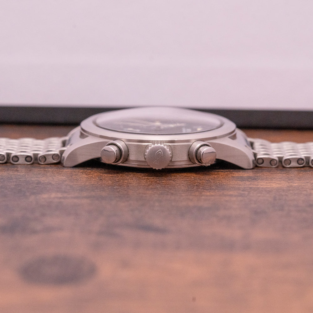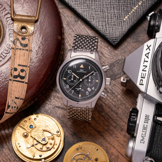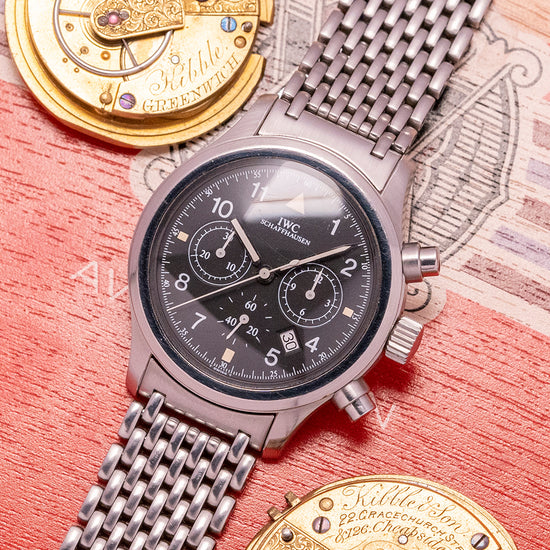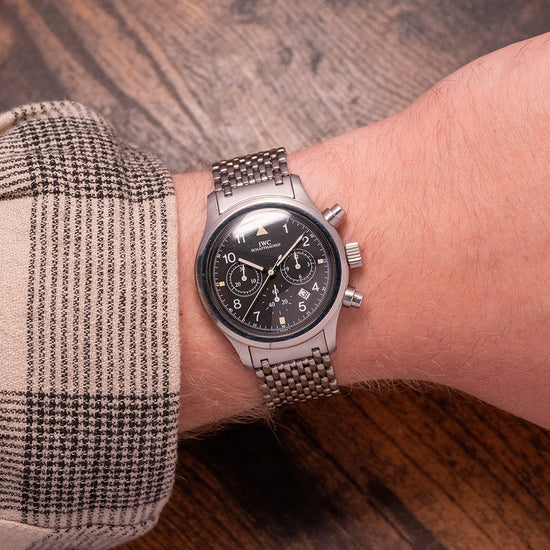 Here we have a 1990s IWC Flieger Chronograph IW3741 Quartz with a satin-brushed 36mm stainless steel case that curves over your wrist with thick tapered lugs, a lug-to-lug length of 43.5mm and a case thickness of 10.5mm give the watch an impressive comfortable fit. Down the right side, we have the chronograph pushers and a signed screw-down crown with deep knurling in the centre. A smooth bezel holds a domed sapphire crystal above a black dial. An outer minute track is precisely executed surrounding Arabic numeral indices marking the hours, at 3 o’clock a 12-hour register, at 6 o’clock a continuous seconds register and finally at 9 o’clock a 30-minute register, between the 4 and 5 a date window, slim baton hands are complemented by a tapered chronograph hand. At 12 o’clock we have the IWC motif. On the reverse a screw-down case back with deep engraving “IWC Der Flieger Chronograph, inside a Jaeger Le Coultre Cal.631 Mecha Quartz, a Quartz base that powers a mechanical chronograph. The watch comes paired with its original IWC 18mm stainless steel multi-link bracelet with a butterfly clasp, it will fit up to a 7.1-inch wrist. The watch comes with a later IWC presentation box.