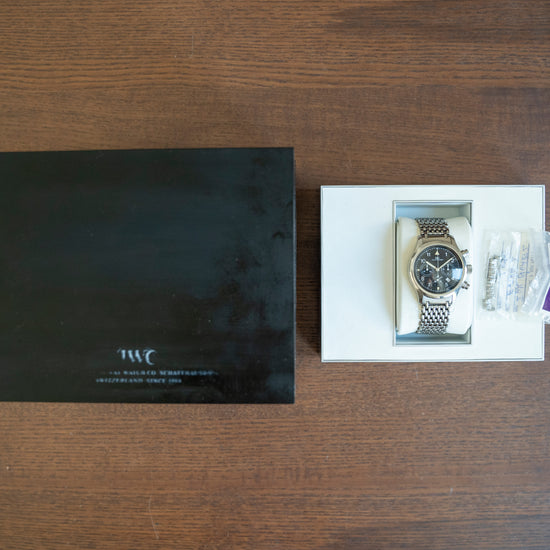 This watch is sold with a later IWC Box and no paperwork. The watch comes paired with its original IWC 18mm stainless steel multi-link bracelet with a butterfly clasp, it will fit up to a 7.1-inch wrist. The watch is from Circa. 1990s and is sold in worn condition, marks can be seen with a few hairlines to the crystal, a full case & bracelet refurb can be provided at an additional cost. The watch comes with our 12-Months NON-Waterproof Warranty and has a fresh battery fitted.