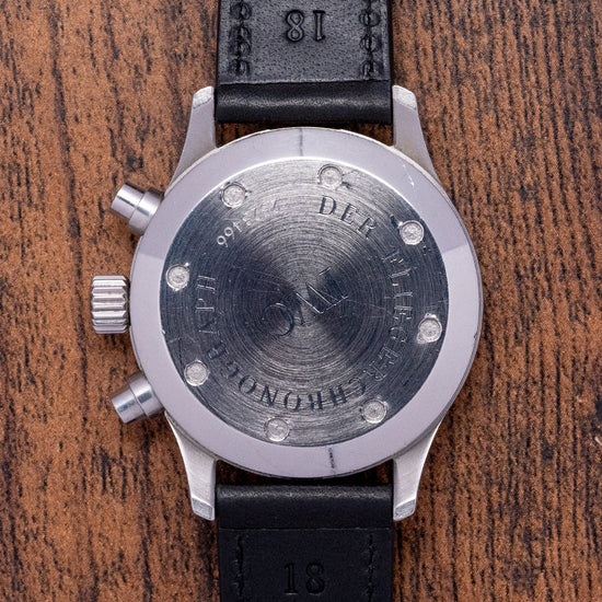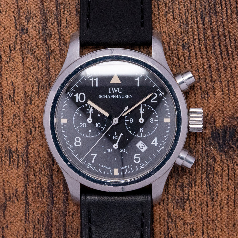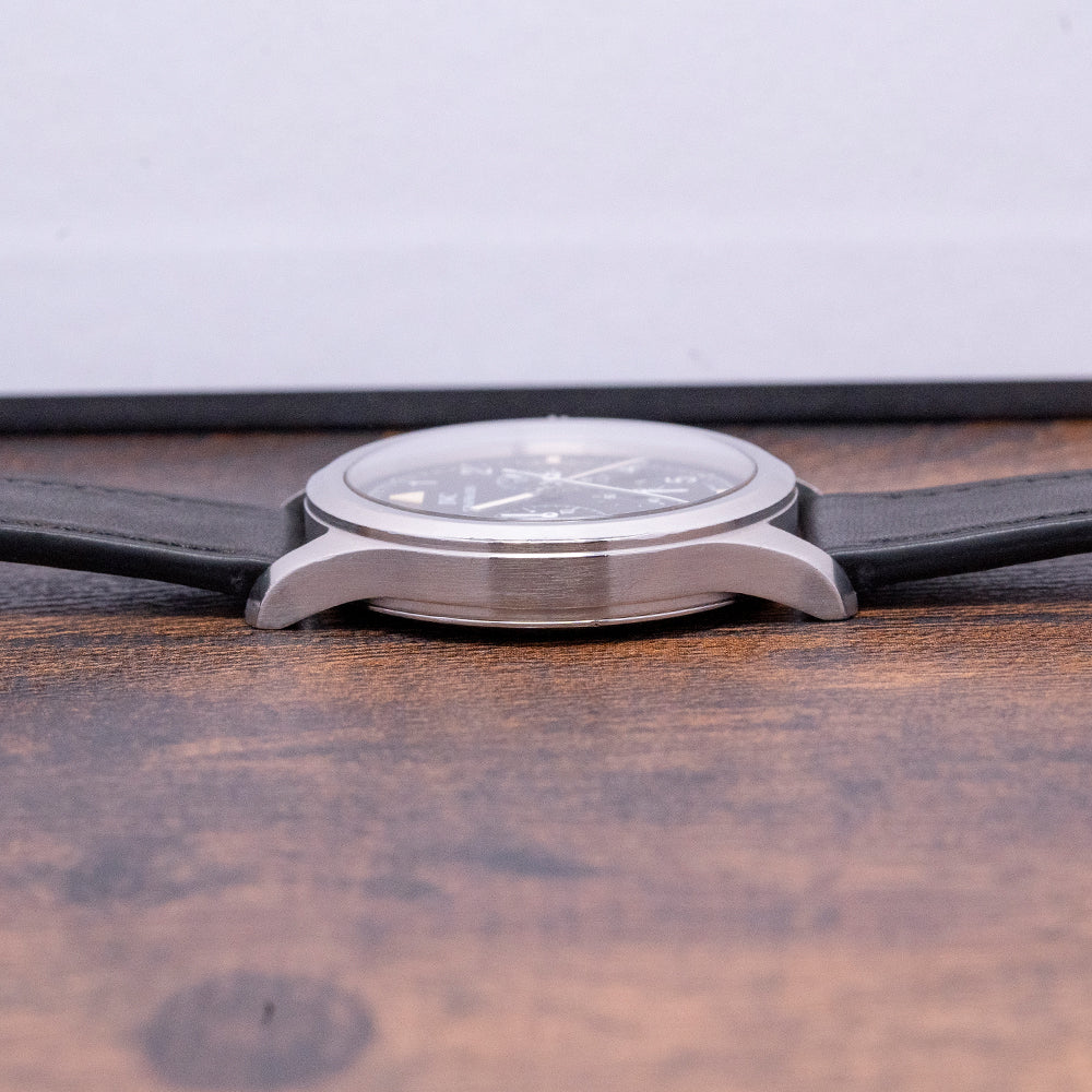 Here we have a 1990s IWC Flieger Chronograph IW3741 Quartz with a satin-brushed 36mm stainless steel case that curves over your wrist with thick tapered lugs, a lug-to-lug length of 44mm and a case thickness of 10mm giving the watch an impressive comfortable fit. Down the right side, we have the chronograph pushers and a signed screw-down crown with deep knurling in the centre. A smooth bezel holds a domed sapphire crystal above a black dial. An outer minute track with lume plots and a triangle at 12 o’clock coated in Tritium precisely executed surrounding Arabic numeral indices marking the hours, at 3 o’clock a 12-hour register, at 6 o’clock a continuous seconds register and finally at 9 o’clock a 30-minute register, between the 4 and 5 a date window, slim baton hands are complemented by a tapered chronograph hand. At 12 o’clock we have the IWC motif. On the reverse a screw-down case back with deep engraving “IWC Der Flieger Chronograph, inside a Jaeger Le Coultre Cal.630 Mecha Quartz, a Quartz base that powers a mechanical chronograph. The watch comes paired with a suitable aftermarket 18mm leather strap with a pin buckle.