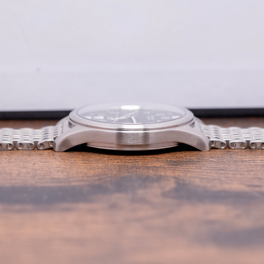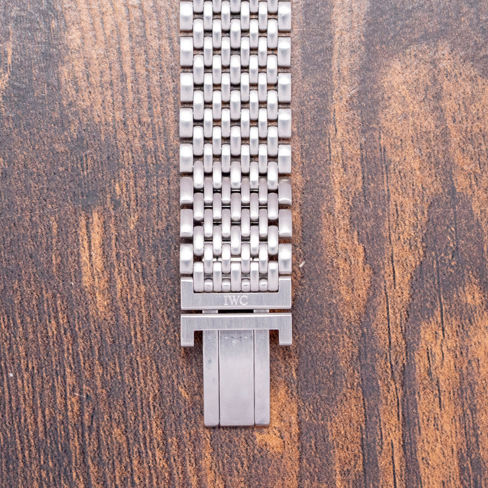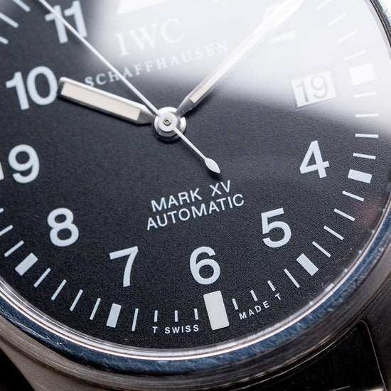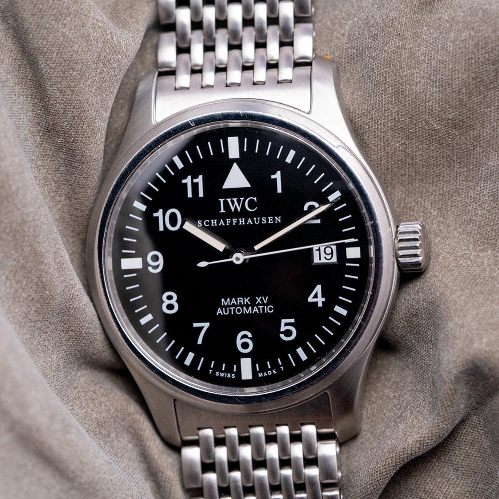 Here we have a 1990s IWC Pilot Mark XV IW325301 on a bracelet. The classic Mark XV was produced from 1999 until 2005; the Mark X line of watches can trace its heritage back to 1944, when it was issued to the military. The 38mm satin-brushed stainless steel case curves over your wrist, with a lug-to-lug length of 47mm and a case thickness of 9.5mm, ensuring a comfortable fit. On the right side, we have a signed "fish" crown. The smooth bezel holds a slightly domed sapphire crystal above a matte black dial, and an outer minute track is precisely executed with Tritium-coated batons and Arabic numeral indices marking the hours. At 3 o'clock, we have a date window; at 12 o’clock, we have the large triangle, slender sword hands coated in Tritium, complemented by a teardrop counterweighted sweeping second hand. Printed at 12 o’clock, we have the IWC motif, and at 6 o’clock, "Mark XV Automatic '' completes this vintage-inspired pilot watch. On the reverse, a screw-down case back with "IWC" engraved on it; inside is an automatic ETA 2892-A2, 21 jewels, 28,800 beats per hour. The movement is heavily modified by IWC. The watch comes paired with its 19mm multilink stainless steel bracelet with a concealed clasp, which will fit up to a 7.3-inch wrist, plus an IWC buckle on a generic 19mm strap.