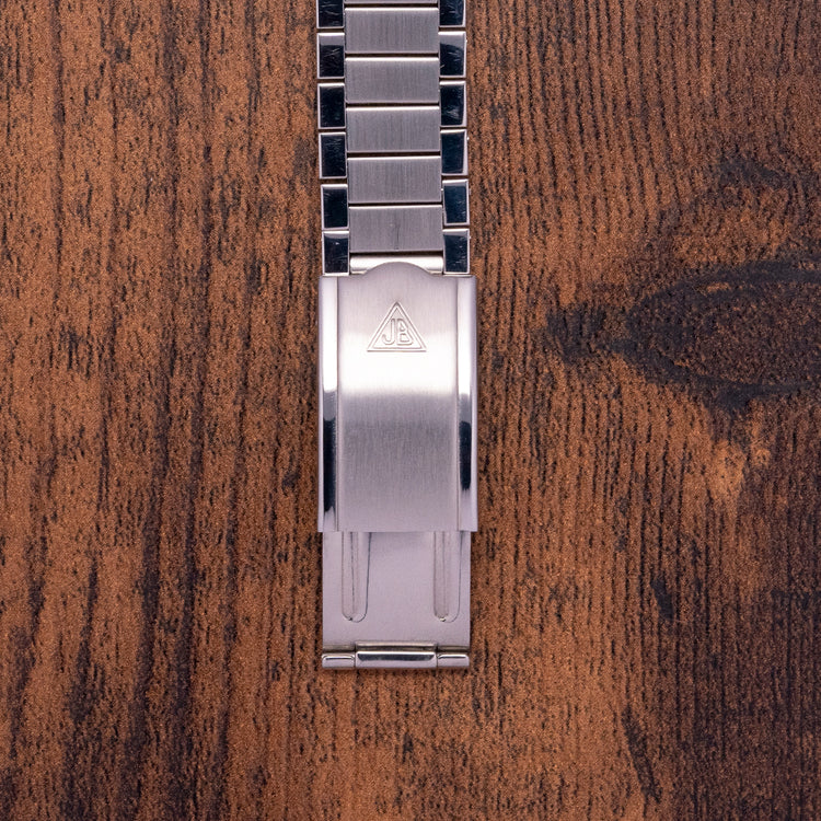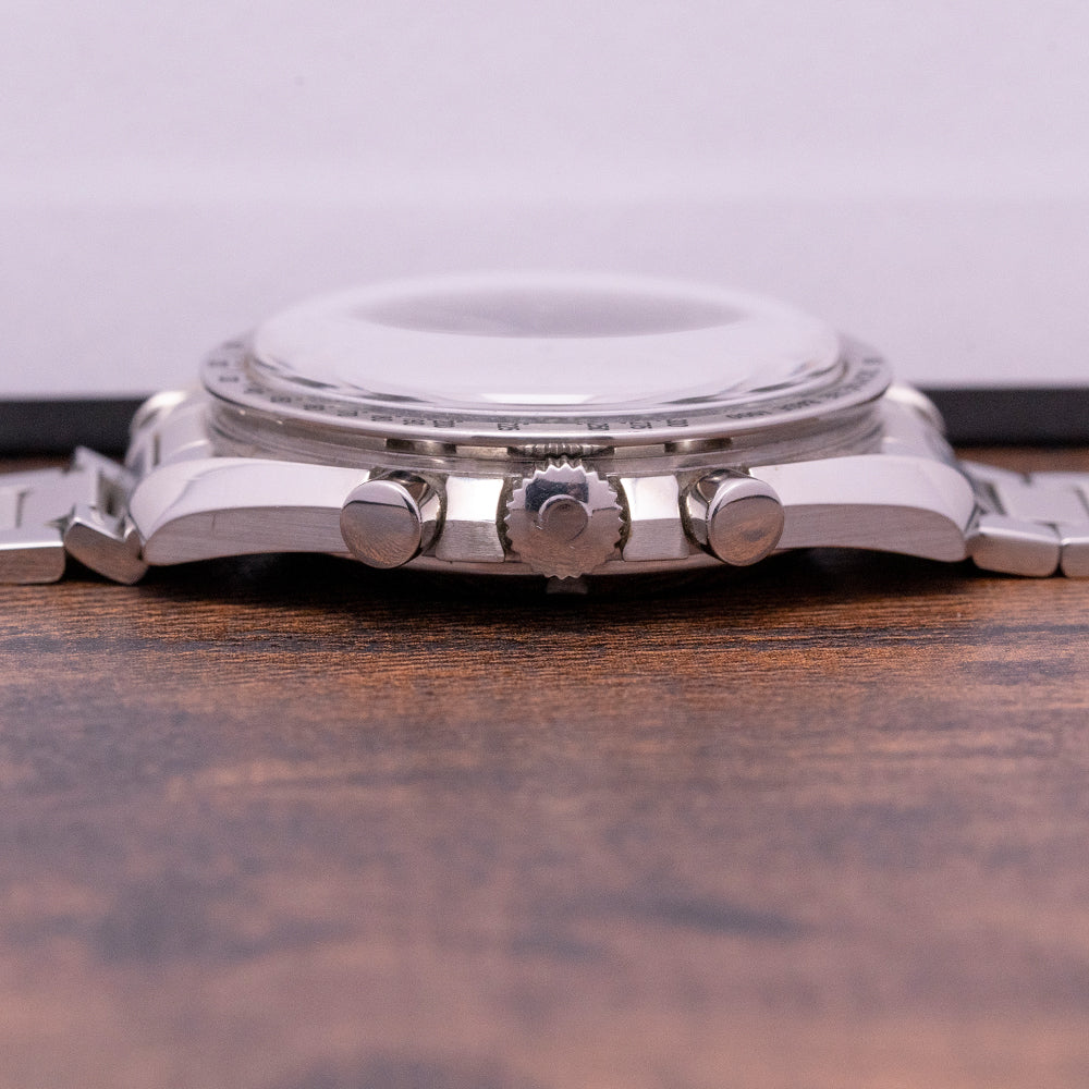 Here we have a 1990s Omega Speedmaster Broad Arrow Manual 3594.50.00, based on the original 1957 “Broad Arrow”, which was not only the first Speedmaster, it was also the first chronograph wristwatch in the world with its tachymeter scale on the bezel. Released in 1997 it celebrated the 40th Anniversary of the release of the CK2915, the 42mm asymmetric case has brushed and polished surfaces, twisted tapered lugs that provide a comfortable fit on your wrist, and a lug-to-lug length of 47.5mm and a thickness of 14mm gives the watch an impressive wrist presence. On the right side, we have the piston pushers and a signed crown in the centre, a thin brushed stainless steel bezel has the Tachymeter scale engraved and painted black. A domed Hesalite crystal sits above a matte black dial, and an outer minute and seconds track is precisely executed with white baton indexes marking the hours. The three registers are slightly recessed, at 3 o’clock 30 minutes, at 6 o’clock 12 hours and finally at 9 o’clock small seconds. Steel Broad Arrow hands are infilled with lume and complemented by a tapered chronograph hand. At 12 o’clock we have the Omega Speedmaster motif completing this accurate re-edition of a true icon. On the reverse a screw-down case back with the embossed Speedmaster Hippocampus in the centre, inside we have the Cal. 1861, 18 jewels hand-wound chronograph beating at 21,600 bph. It has a Rhodium-plated finish, as a manual wound movement, it is the direct descendant of the original moon watch that used the Cal. 361 movement. The watch comes paired with a 20mm Forstner flat-link polished and brushed bracelet with a signed folding clasp and the watch comes with its Omega presentation box.