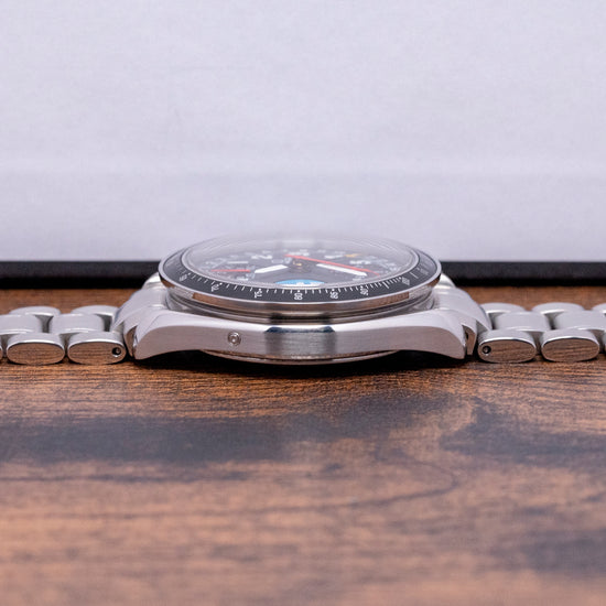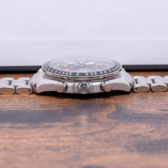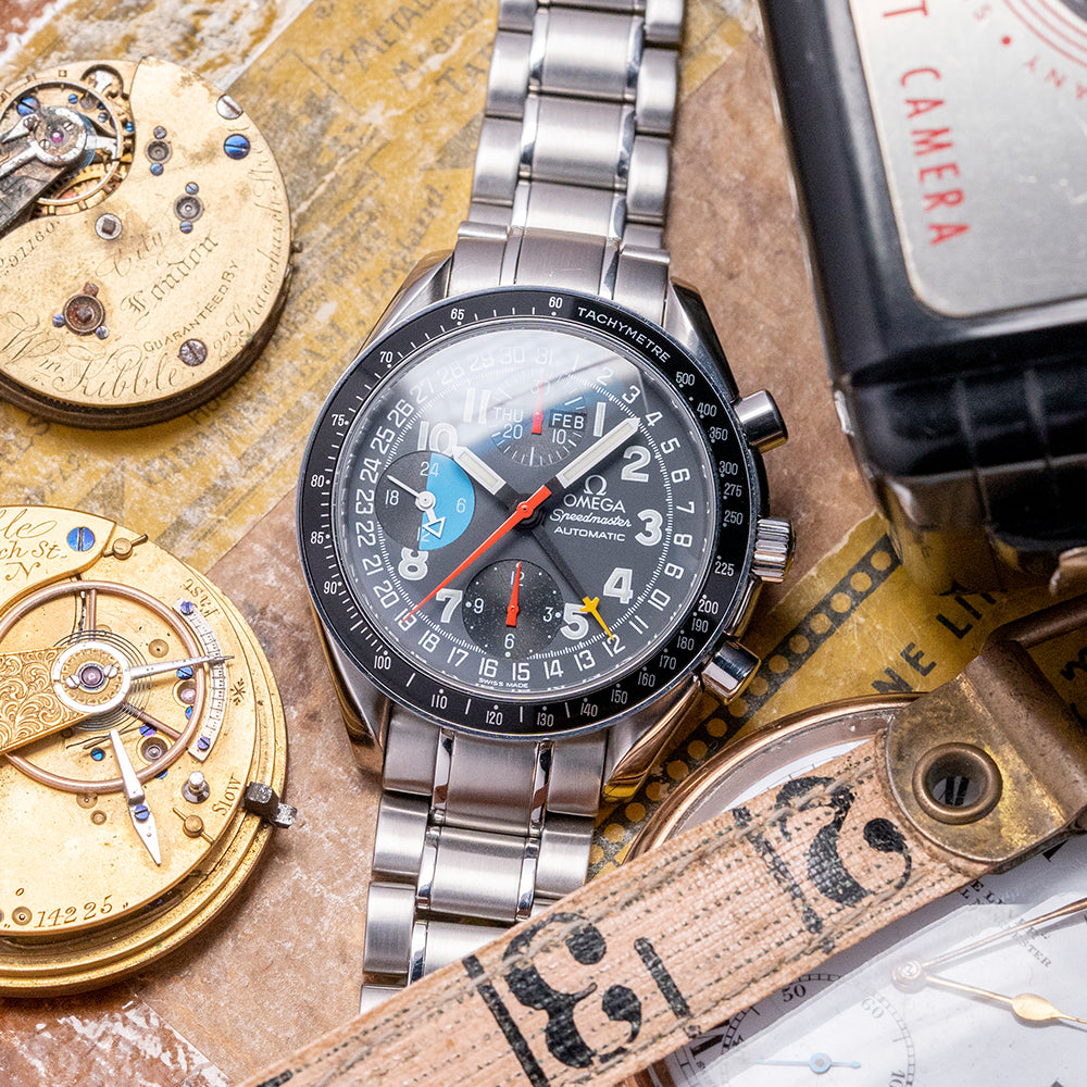 Here we have a 1990s Omega Speedmaster MK40 Triple-Date Automatic with a 39mm polished and satin-finished case that fits snuggly on the wrist thanks to the characteristic twisted lugs, its curved flanks lead to a lug-to-lug length of 44.5mm and a case thickness of 13.5mm ensures a comfortable fit. Down the right side, we have the chronograph pushers and a signed crown in the centre. The fixed stainless steel bezel has a black aluminium Tachymetre insert with silver numerals. The domed crystal protects a matte grey dial, a date outer track with its indicator hand ending in a yellow-tipped jet pointer showing the correct date. Applied Arabic indexes indicate the hours coated in luminescence; we have three sunken dials: a 30-minute dial that incorporates the Day and Month at 12 o’clock, followed by a 12-hour dial at 6 o’clock, and finally, a 24-hour dial at 9 o’clock with blue and black indicating night and day, perfect for the intrepid explorer or executive travelling around the world. Sword hands filled with lume and a red chronograph hand complete a very elegant dial, a screw-down case back complete with the Hippocampus, inside an automatic Omega Cal. 1151, 25 jewels, 28,800 beats per hour. It comes paired with its 18mm Omega polished and brushed stainless steel bracelet secured by a signed deployant clasp and will fit up to a 6.9-inch wrist, plus its original 18mm Omega leather strap and pin buckle. The watch comes with its Omega pouch.