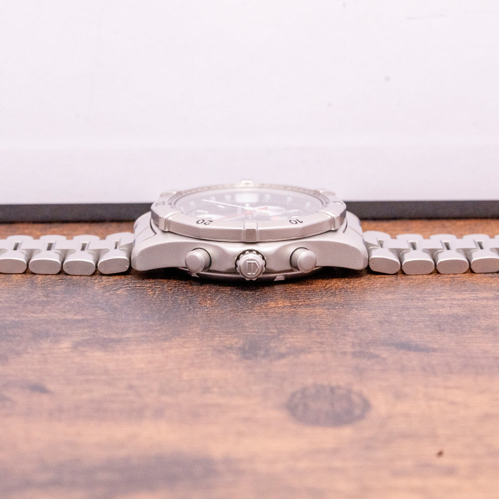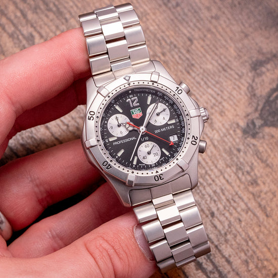 Here we have a 1990s TAG Heuer 2000 Chronograph CK1110 with a 38mm satin brushed stainless steel case; the 2000 series was designed by Eddie Schopfer. The curve of the case leads to a lug-to-lug length of 44mm and a case thickness of 11.5mm, giving the watch an impressive wrist presence; down the right side, we have the chronograph pushers and a signed screw-down crown in the centre. A satin brushed bezel has raised polished blocks and a 60-minute scale with black painted numerals; a flat sapphire crystal sits above a black dial with an outer Tachymetre chapter ring. Applied 12 followed by applied rounded baton indexes are infilled with luminance marking the hours, at 4 o’clock a date window. The chronograph consists of three black registers: a 1/10 second, 60 seconds continuous and finally, a 12-hour register, each slightly recessed on the dial. Elegant Mercedes hands filled with luminance and a red chronograph second hand, at 12 o’clock, an applied TAG Heuer motif at 3 o’clock “200 meters” and at 9 o’clock “Professional” complete this sports chronograph. On the reverse, a screw-down case back with an engraved TAG Heuer shield in the centre, inside a Quartz movement. The watch comes fitted on its 20mm TAG Heuer stainless steel bracelet with a signed folding clasp and flip lock, and it also comes with its TAG Heuer service pouch and 2022 TAG Heuer service paperwork.