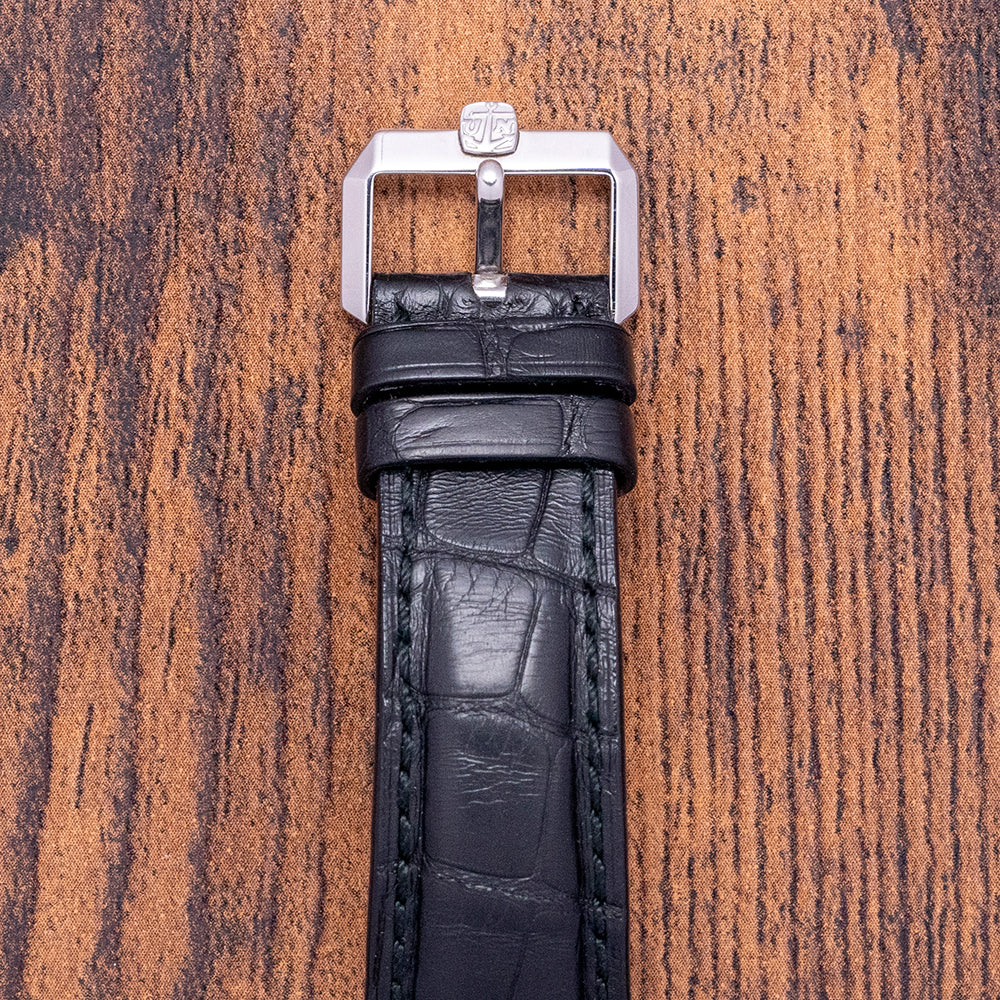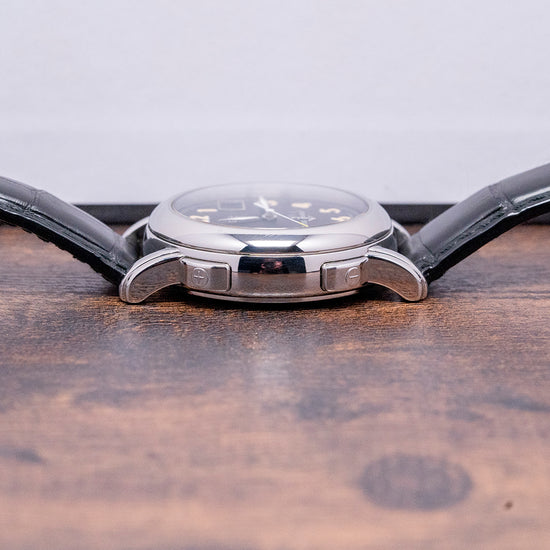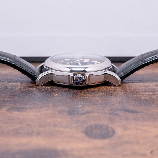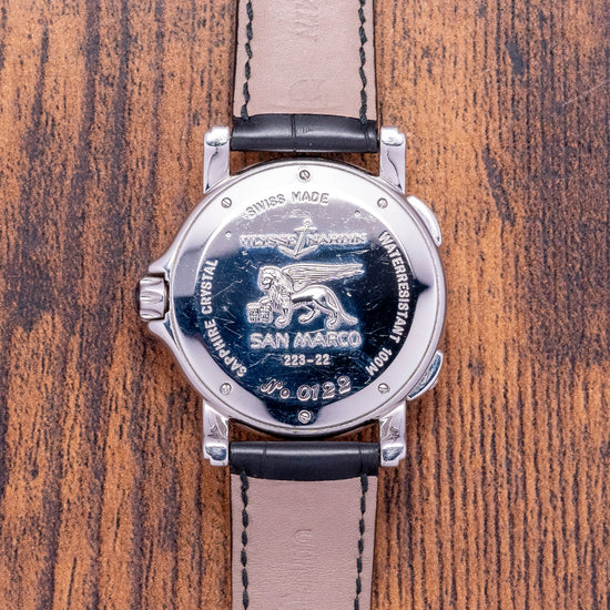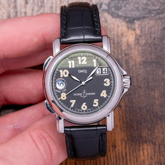 Here we have a 1990s Ulysse Nardin San Marco Big Date GMT 223-22; its high polished 37mm round stainless steel case gently curves over your wrist, and the stepped lugs add an interesting profile with a lug-to-lug length of 44mm and a thickness of 11.5mm ensure a comfortable fit. On the left side, you will find the pushers to change the GMT hour window in one-hour increments. On the right side is a protected signed crown with crown guards. A polished bezel holds a domed sapphire crystal, and its attractive matte grey dial has an outer minute track that is precisely executed and Arabic numeral indexes to mark the hours coated in Tritium. The big date-framed window sits off-centre on the right, and at 9 o’clock, the 24-hour Home Time disc jumps at the hour, and the watch features elegant sword hands filled with Tritium sitting majestically in the centre, a yellow-tipped sweeping second-hand completes the handset. At noon, we have GMT+- and the Ulysse Nardin Anchor motif sits at 6 o’clock, completing this sophisticated travel companion. On the reverse, a screwed-down case back with an embossed San Marco (Lion of St. Mark, the Evangelist) is in the centre, inside an automatic Ulysse Cal. UN-22 based on the ETA 2892-A2, 23 jewels, 28,800 beats per hour; this is the advanced version of the Cal. 2892; it has an "eccentric screw" for precise fine adjustment and has hacking seconds. The watch comes with its 19mm Ulysse Nardin leather strap secured by its pin buckle.