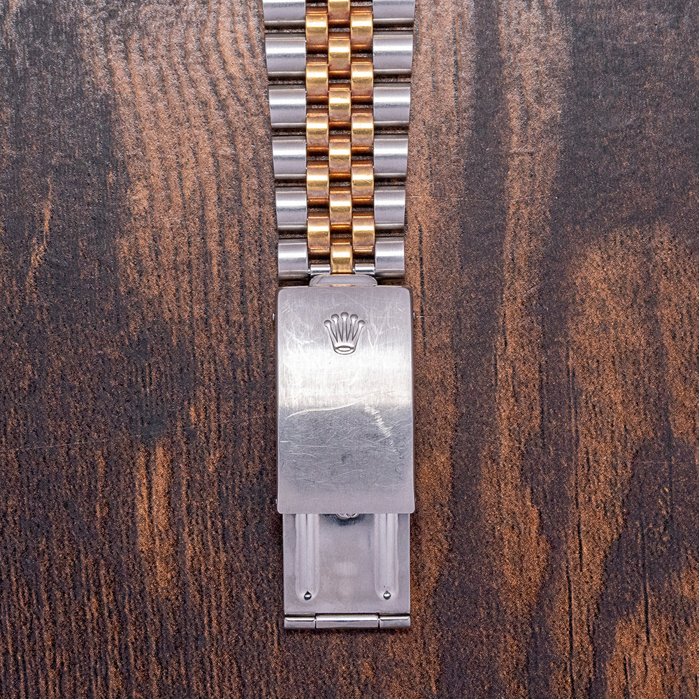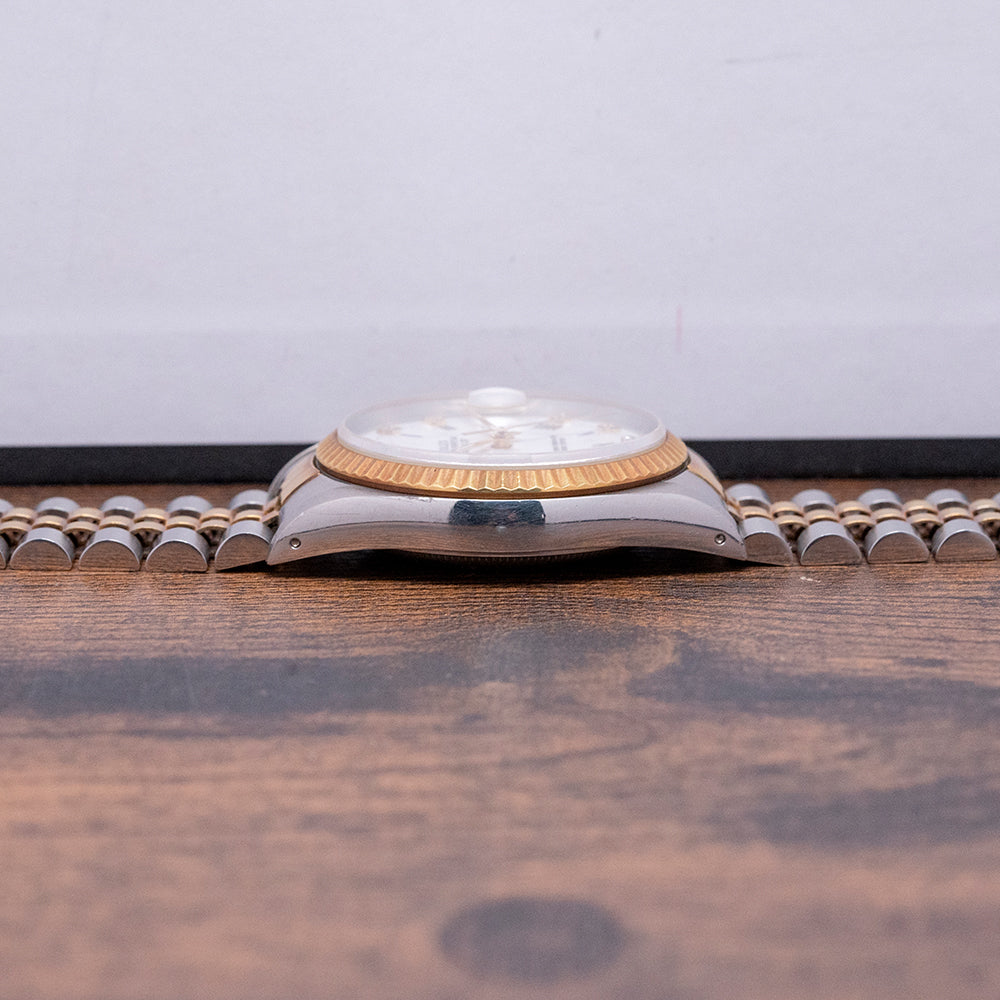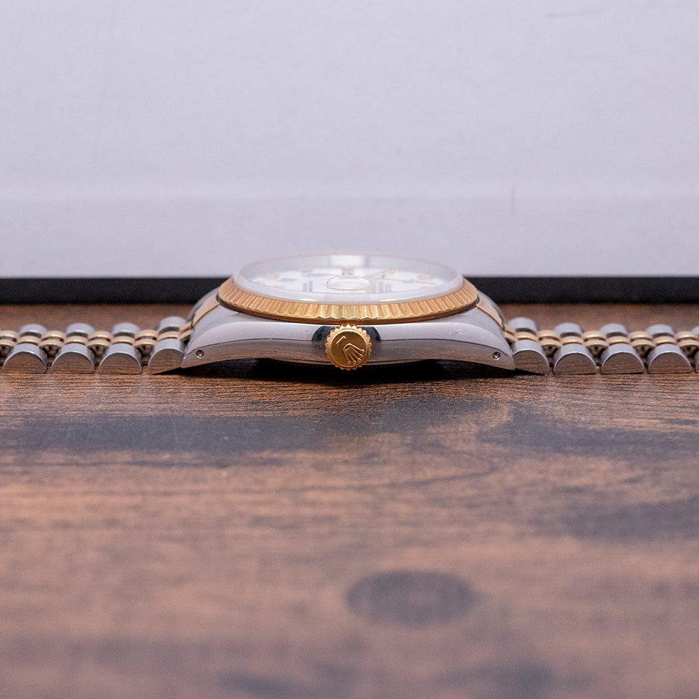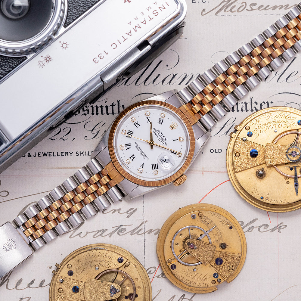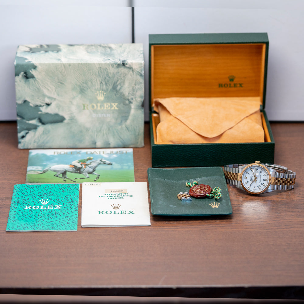 Here we have the stately 1991 Rolex Datejust White Roman 'Buckley' Diamond Dial 16233, which has a 36mm Oyster satin brushed and polished stainless steel case that gently curves over your wrist thanks to the tapered drilled lugs. The Buckley dial has Roman numerals printed in a particular “font” rather than the usual applied indexes. The name of the dial is derived from John Buckley, a vintage watch dealer from New York, who owns the company, Tuscany Rose. Buckley is a respected watch expert and highly respected in the Rolex world. Over time, these particular style dials took on his name. Its curvaceous flanks lead to a lug-to-lug length of 44.5mm and a case thickness of 11.5mm. Ensuring a comfortable fit under your wrist. On the right side, a signed screw-down 18ct yellow gold crown. Polished and brushed surfaces transition with crisp lines. An 18ct yellow gold fluted bezel holds a bevelled flat sapphire crystal. The striking white Buckley dial has an outer minute track with beautiful, rare factory diamonds set in 18ct yellow gold at the hour, and finely printed ‘Buckley’ Roman numerals mark the hours. At 3 o’clock, a colour-matched date window with cyclops magnification on the crystal makes the date easily read. Slim 18ct yellow gold hands have Tritium infill complemented by a tapered 18ct yellow gold sweeping seconds hand. An applied Rolex crown sits at 12 o’clock with ‘Rolex Oyster Perpetual DATEJUST’ and printed clearly at 6 o’clock ‘Superlative Chronometer Officially Certified’, the dial sparkles mesmerisingly in the light as you rotate your wrist. On the reverse, a coin-edge screw-down case back. Inside an Automatic Rolex Cal. 3135, 31 jewels, 28,800 beats per hour, this movement was first introduced in 1988 and has hacking seconds and a quick-set date function for your convenience. It comes paired with its full-sized Rolex 20mm Jubilee stainless steel and 18ct yellow gold centre links bracelet, secured with a signed folding clasp and includes its Rolex presentation box, swing tag and paperwork.