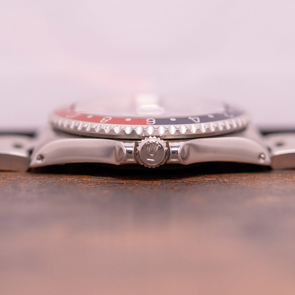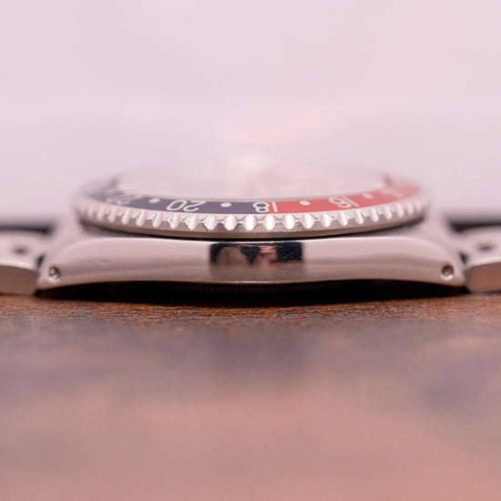 Here we have a 1991 Rolex GMT-Master "Pepsi" 16700 Tritium Dial & Hands with a 40mm stainless steel case, ergonomically shaped with its subtle curve to the drilled lugs making for a very comfortable fit on the wrist. The polished sides transition with the brushed top surface. Crown guards protect the screw-down crown from any knocks. Its bidirectional bezel has the iconic blue and red “Pepsi” insert, 24-hour numerals radiate around the bezel, the red indicates the daytime while the blue signifies the nighttime. The sapphire crystal sits slightly above the bezel and has the Cyclops magnifier over the date at 3 o’clock. The black dial has Tritium-filled White Gold framed discs and batons for hours, Mercedes hands with Tritium infill and are complemented by a sweeping second hand with a lollipop counterbalance, and the red GMT hand has a white Tritium arrowhead. The hour hand and GMT hand are linked making this a true GMT as opposed to a separate set GMT hand. On the reverse, a plain coin-edged case back, inside an automatic Rolex Cal. 3175, 31 jewels, 28,800 beats per hour, it has both hacking and quick set date functions. The watch comes fitted on a 20mm Rolex Oyster bracelet with the Oysterlock system that prevents the bracelet from accidentally opening, 12 links are included, and the watch also comes with a later Rolex presentation box.