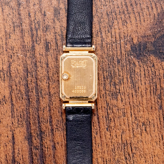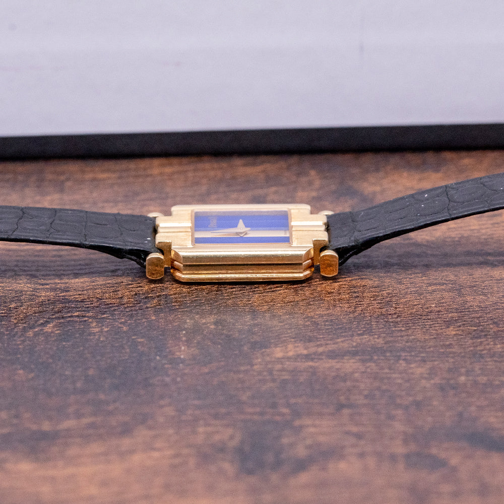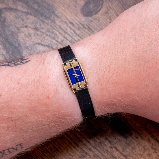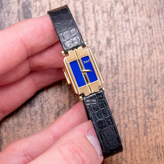 Here we have a beautifully sculpted 1992 Piaget Polo 18ct Yellow Gold Lapis Dial Box & Papers 15213 with a brushed and polished 14mm 18ct Yellow Gold case that sits on your wrist with distinctive lugs. A lug-to-lug length of 24mm and a case thickness of an incredibly thin 5mm ensures a comfortable fit on your wrist. This collection was initially designed as an equestrian sports watch by Yves Piaget in 1979, who cleverly brought horology and jewellery craftsmanship together. It was famously worn by Andy Warhol and Miles Davis. The 18ct Yellow Gold case consists of outer decorative rounded flanks, brushed flat inner sections matched by a central vertical, rounded strip splitting the dial for an attractive architectural design. A flat crystal sits above a stunning Intense Lapis lazuli dial, created from a naturally forming deep blue mineral found in limestone deposits that have been mined for thousands of years. 18ct Yellow Gold Dauphine hands sit perfectly on this sterile dial; in the top right, we have the Piaget logo, reprinted during the 2024 Piaget Service. On the reverse, a screwed-down 18ct Yellow Gold case back stamp, inside a quality Quartz Piaget Cal. 601 movement, operated via a push button on the case back. The watch comes paired with its original Piaget 10mm leather strap and 18ct Yellow Gold pin buckle, and it comes with a Piaget presentation box and paperwork, including 2024 Piaget Service paperwork.