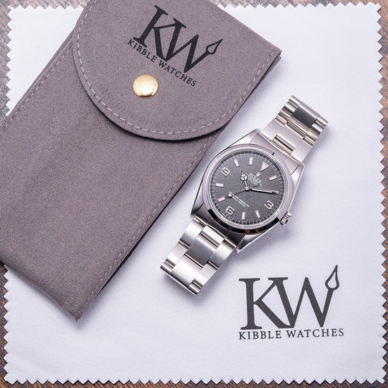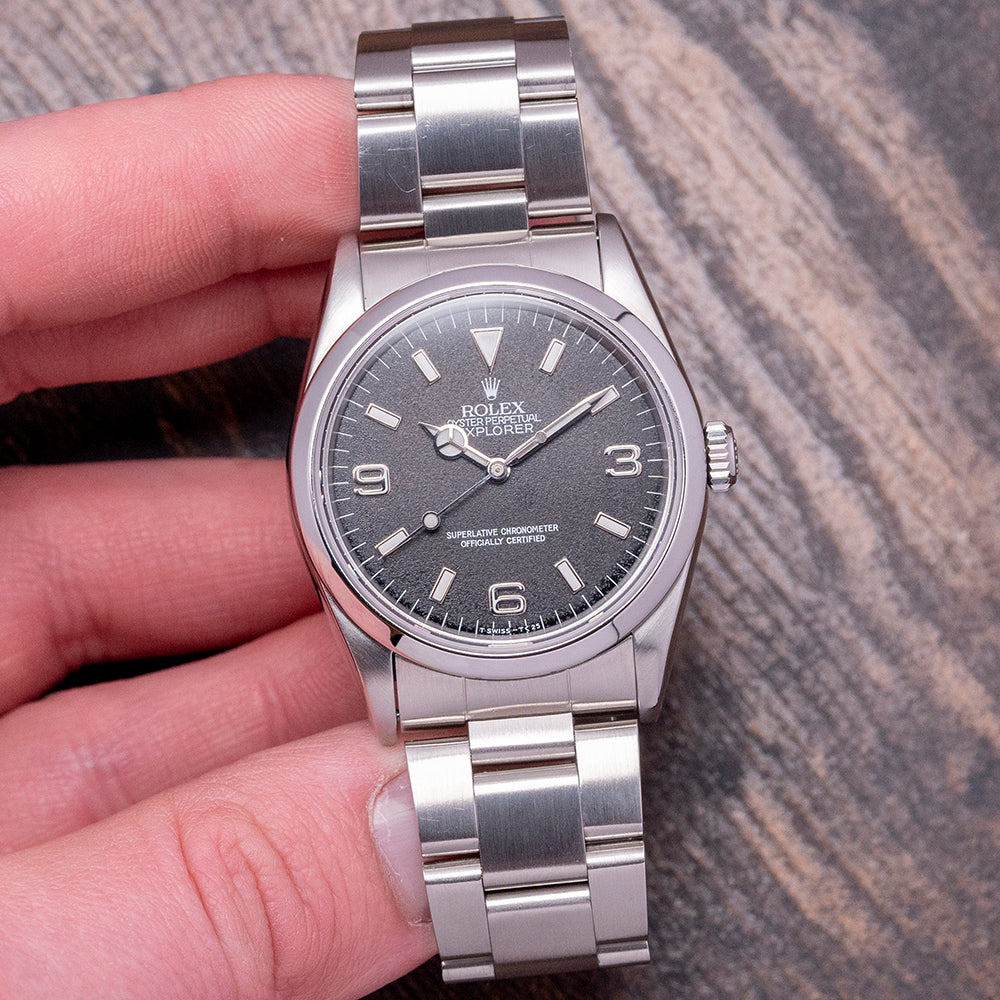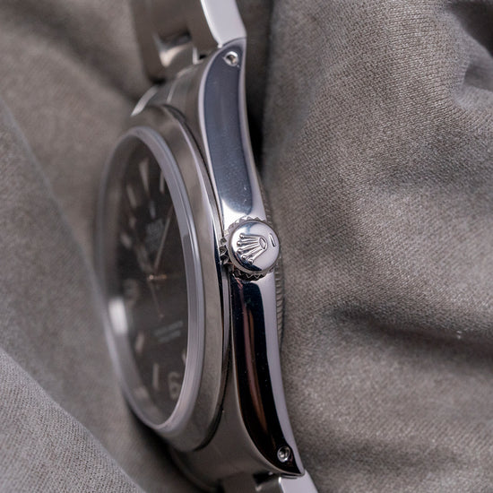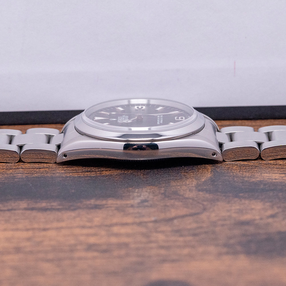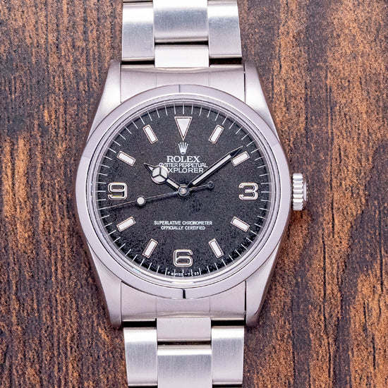 Here we have a 1993 Rolex Explorer 1 Tritium 'Grainy Dial' 14270 with a 36mm stainless steel Oyster case that gently curves over your wrist towards the finely tapered lugs, its curvaceous flanks lead to a lug-to-lug length of 43.5mm and a case thickness of 11mm giving the watch an impressive wrist presence. On the right side, a screw-down TwinLock signed crown. A smooth bezel holds a flat sapphire crystal above a glossy black lacquer dial, and an outer minute track is precisely executed with the applied White Gold baton, triangle and 3, 6 and 9 indexes Tritium T< 25 infilled marking the hours, Mercedes’s hands are complemented by a lollipop counterweighted sweeping second hand, Tritium T< 25 infilled, at 12 o’clock we have the Rolex motif and “Oyster Perpetual Explorer” printed underneath and at 6 o’clock “Superlative Chronometer Officially Certified” complete this rugged explorers timepiece. On the reverse, a coin-edged screw-down case back, inside an automatic Rolex Cal. 3000, 27 jewels, beating at 28,800 beats per hour, this workhorse movement was launched in 1990. The watch comes fitted with its 20mm Rolex Oyster bracelet secured by a folding Oyster clasp and will fit up to a 7.1-inch wrist.