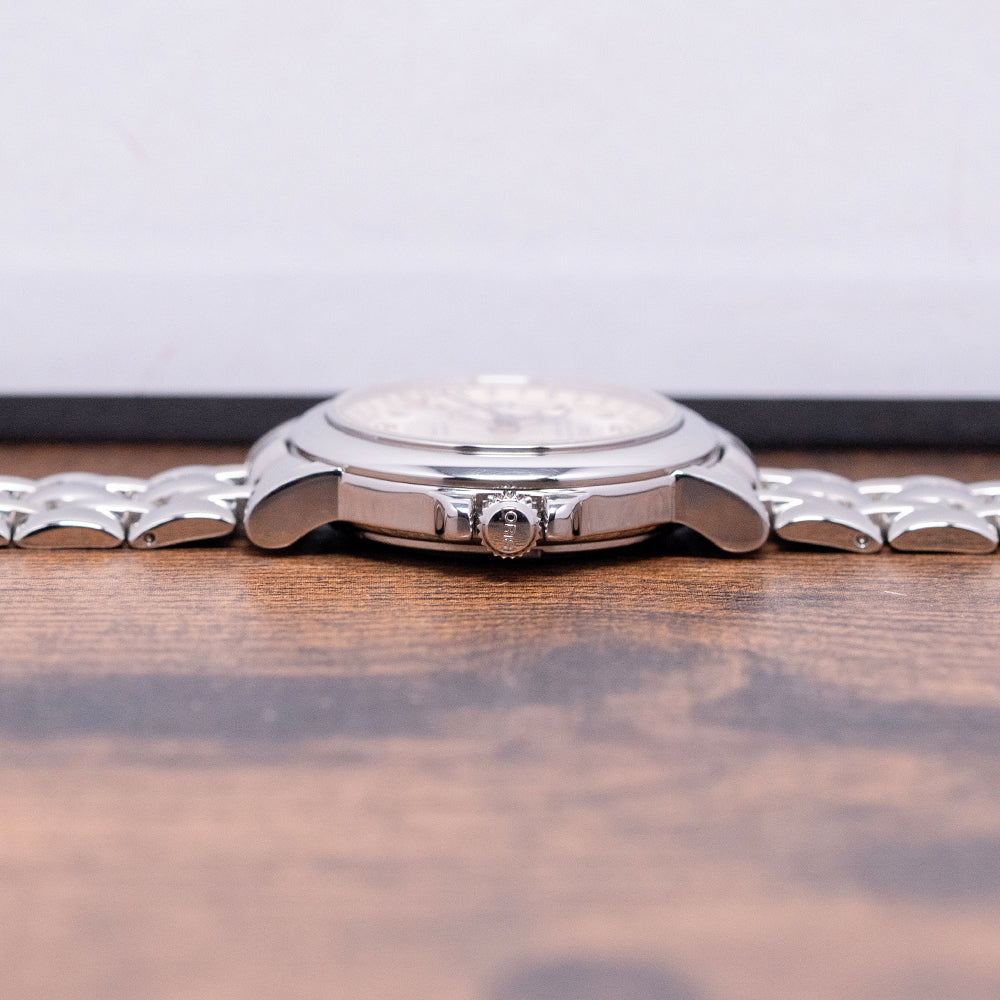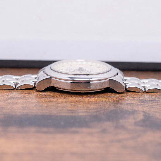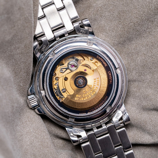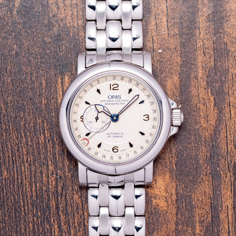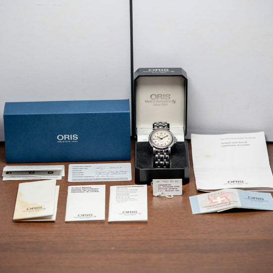 Here we have a 1995 Oris 'Chronometer' Pointer Date 7467B. Featuring a 35mm polished stainless steel case with a gentle curve to the tapered lugs, a lug-to-lug length of 42mm, and a thickness of 10mm, ensuring a comfortable fit on your wrist. On the right side is the signed crown protected by crown guards. The smooth, polished bezel supports a domed sapphire crystal. Its off-white sector dial features an outer date track with a centre indicator hand that has a red-coloured crescent to highlight the date, as well as an inner minute track with applied golden Arabic numerals and blue arrowhead indexes to mark the hours. Elegant blued hands with lume infill are complemented by a recessed sub-seconds at 9 o’clock. At 12 o’clock, we have the Oris motif “Officially Certified Chronometer” underneath and at 6 o’clock, “Automatic 27 Jewels”. On the reverse, a screw-down exhibition case back houses an automatic Oris Cal. 641, featuring 27 jewels and a beat rate of 28,800 beats per hour, based on the ETA 2836-2. It comes paired with its original Oris 18mm 5-link polished and brushed stainless steel bracelet, featuring a signed folding push-button concealed clasp, which will fit up to a 7-inch wrist. The watch also includes its Oris presentation box and Oris paperwork.