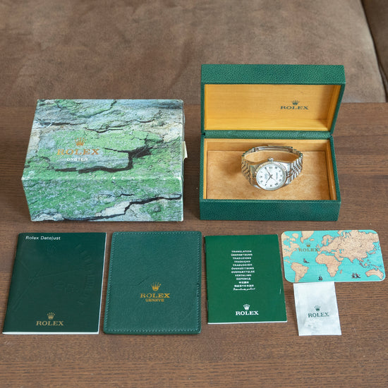 Here we have a 1995 Rolex Datejust 36mm White Roman Dial 16234 with a 36mm stainless steel Oyster case, the case gently curves over your wrist with tapered lugs, a lug-to-lug length of 43mm and a case thickness of 11.5mm ensuring a comfortable fit on your wrist. Brushed and polished surfaces transition with crisp edges. On the right side is a signed screw-down crown, the 18ct White Gold fluted bezel holds a flat sapphire crystal above the star of the show, a crisp white dial, and an outer minute track precisely executed and applied Roman numerals mark the hours. At 3 o’clock a date window with a cyclops magnification on the crystal, and at 12 o’clock the applied Rolex crown and printed underneath “Rolex Oyster Perpetual DateJust”. At 6 o’clock “ Superlative Chronometer Officially Certified” completes this elegant timepiece. On the reverse, a screw-down case back with coin edge detailing, inside an automatic Rolex Cal. 3135, 31 jewels, 28,800 beats per hour, this movement was first introduced in 1988. The watch comes fitted on its Rolex 20mm Jubilee bracelet with a signed folding clasp, all links included and comes with its Rolex presentation box and booklets.